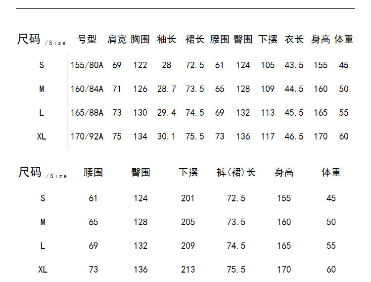 | 尺码 | 裙长(cm) | 肩宽(cm) | 袖长(cm) | 上装号型 | 下装号型 | 衣长(cm) | 腰围(cm) | 臀围(cm) | 胸围(cm) | 号型 |