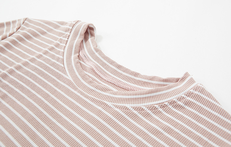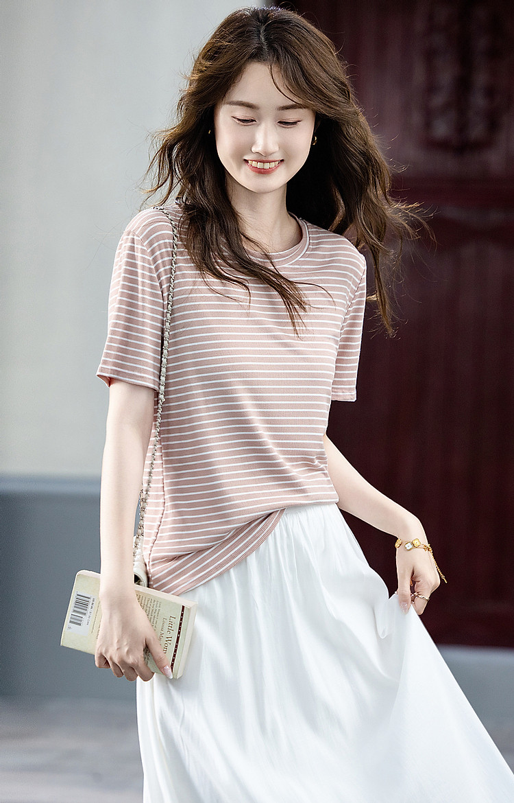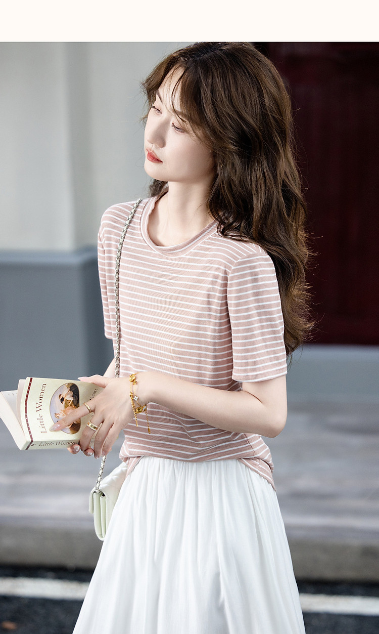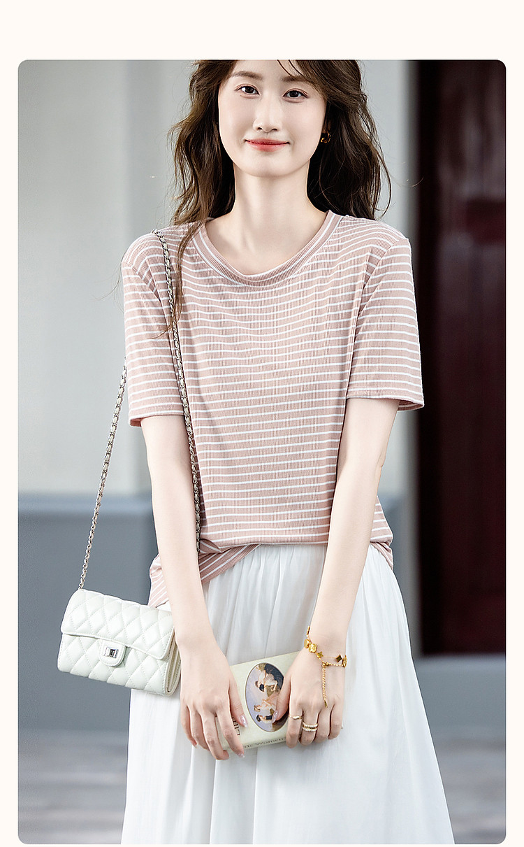 商品名称:【格雷系穿搭】夏简约风休闲圆领条纹短袖舒适藏肉女式t恤 832321