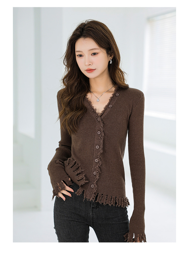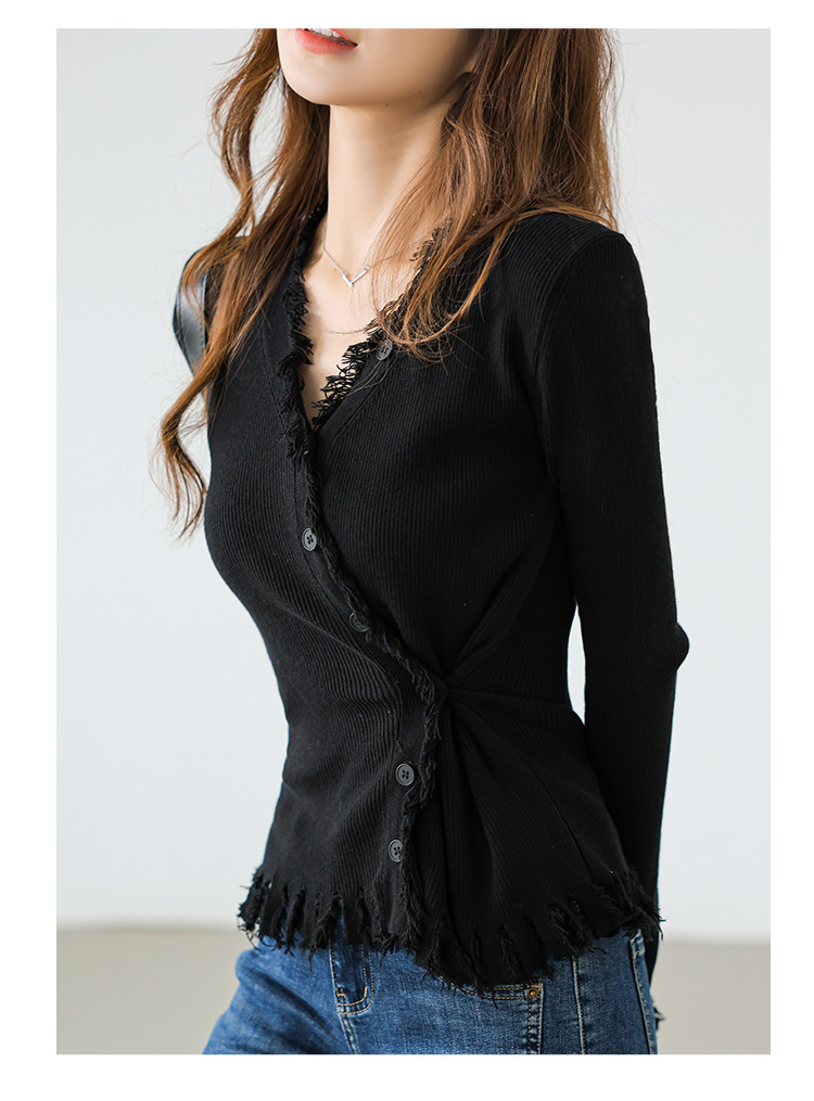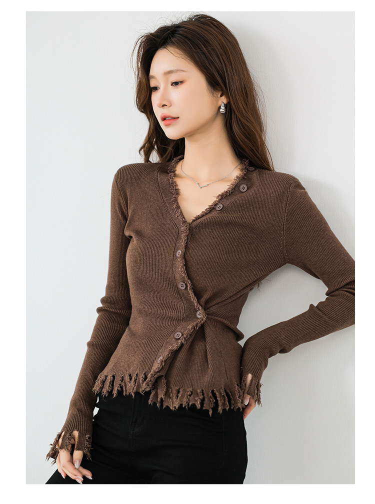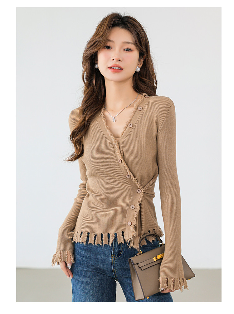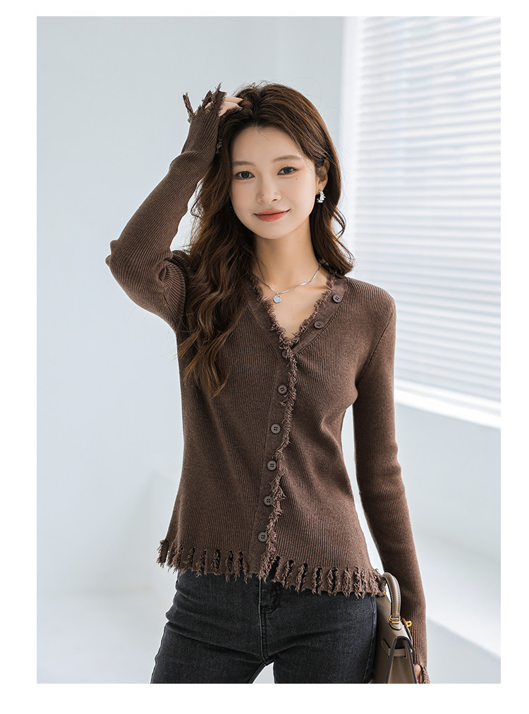 V领长袖针织衫女流苏设计打底内搭针织开衫空调服 831683