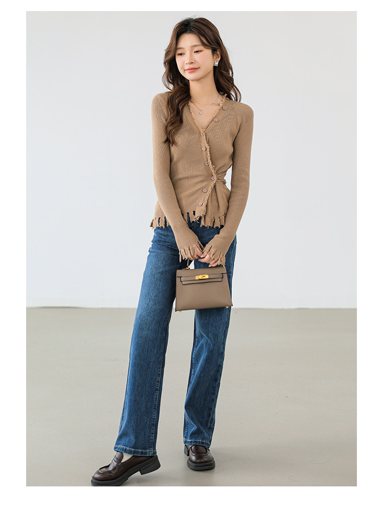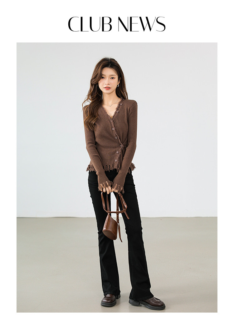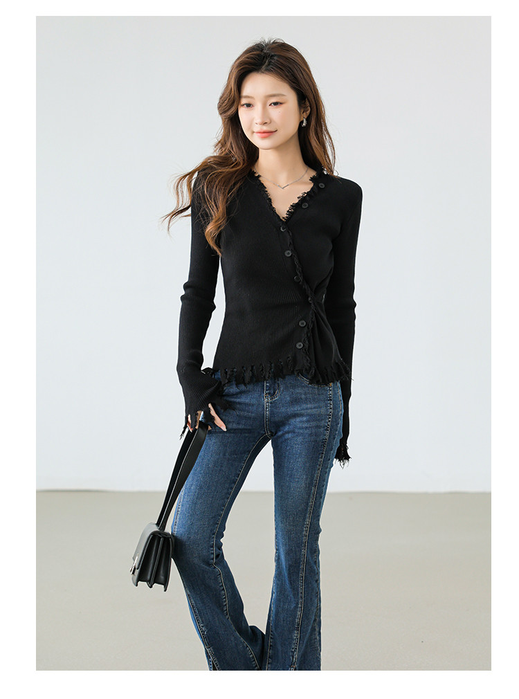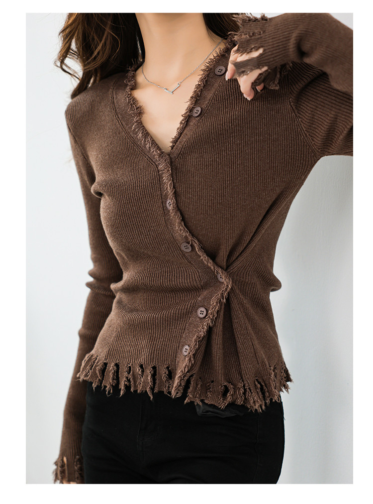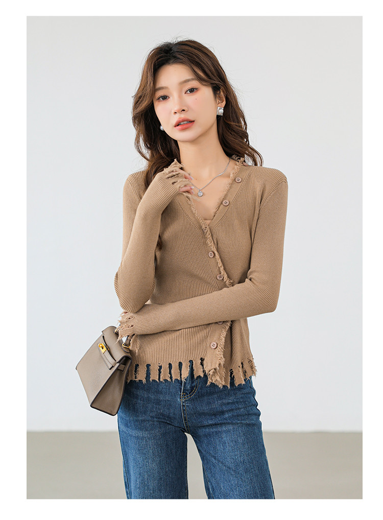 V领长袖针织衫女流苏设计打底内搭针织开衫空调服 831683
