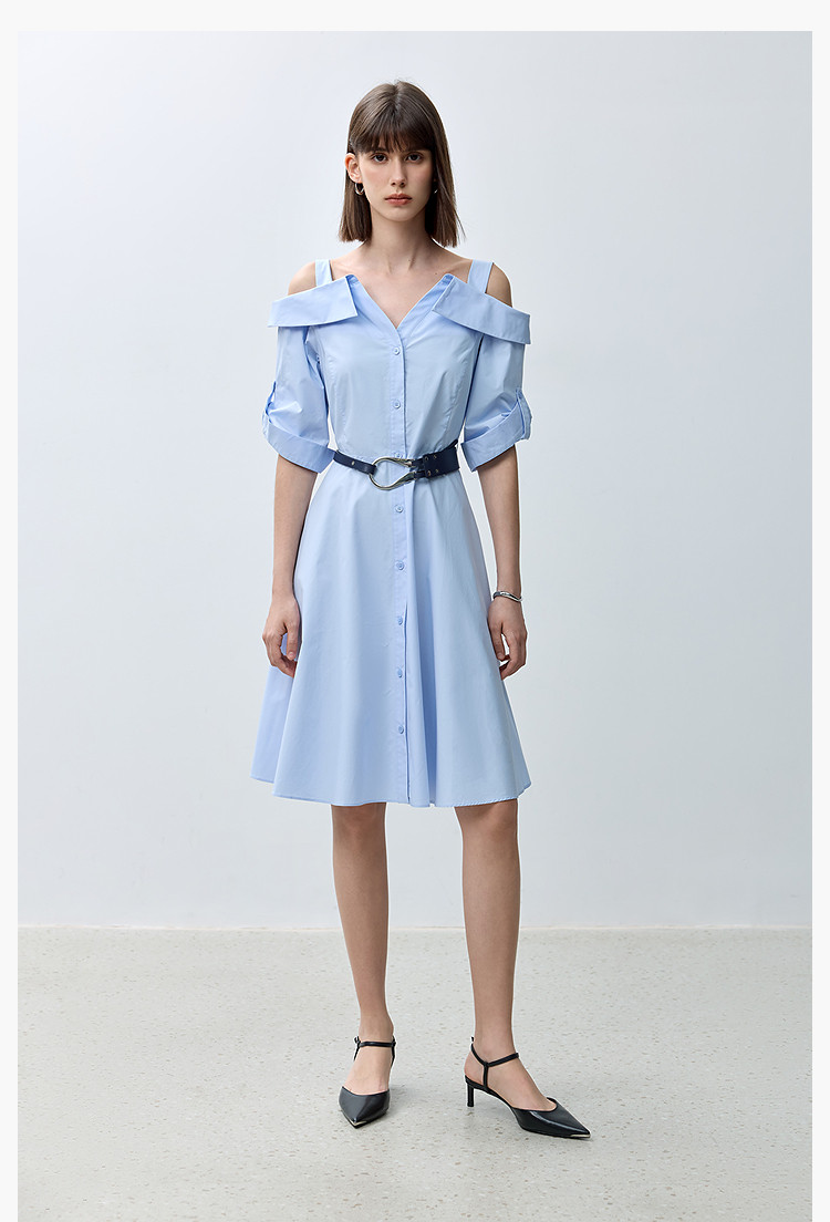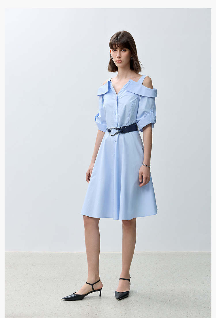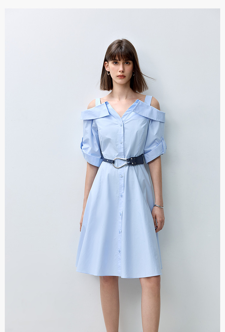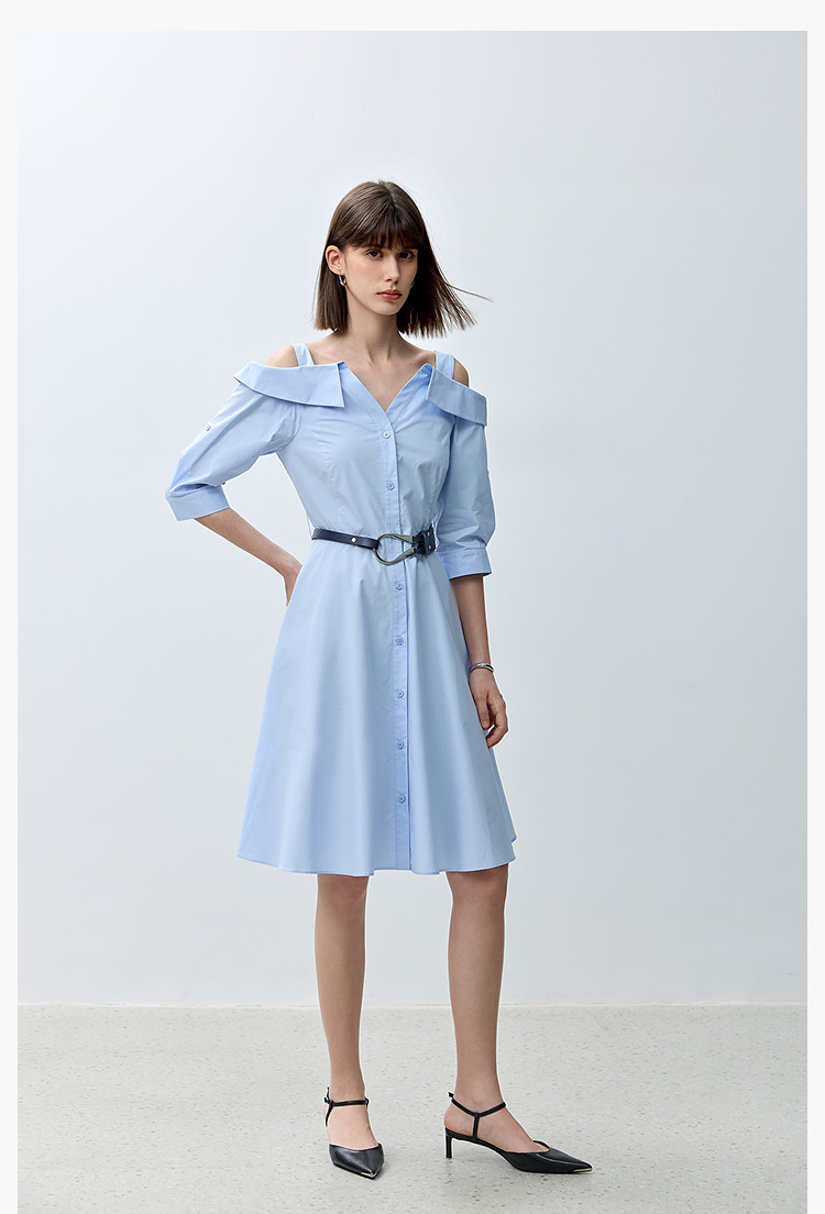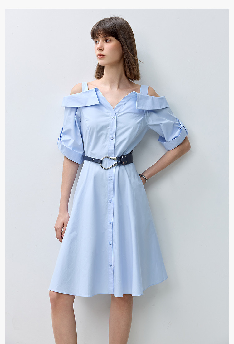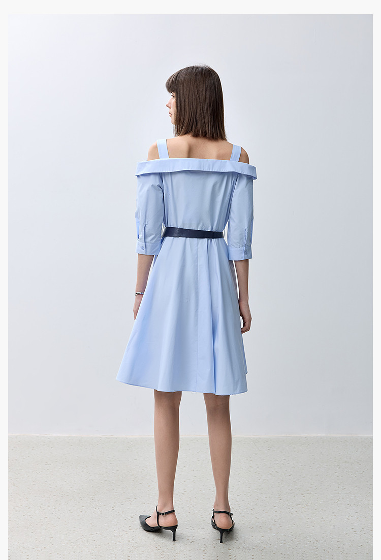 商品名称:夏款都市优雅气质设计感复古时尚显瘦通勤感蓝色连衣裙女 702747