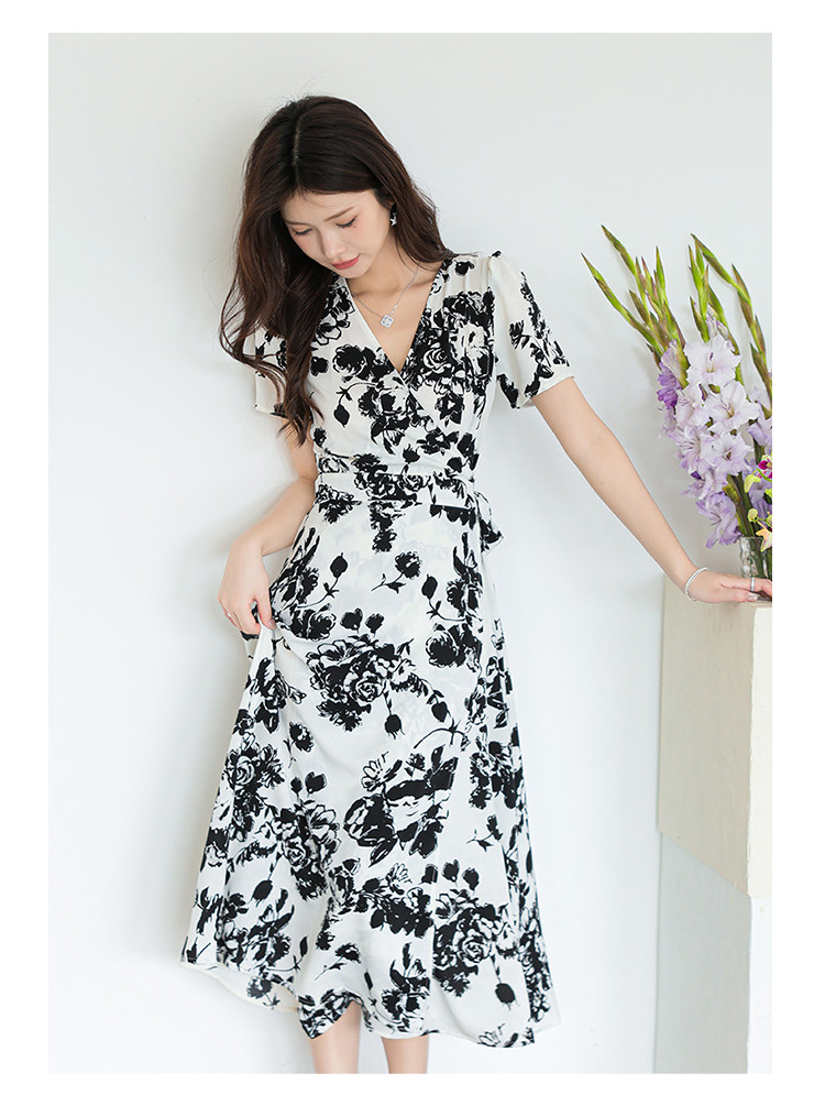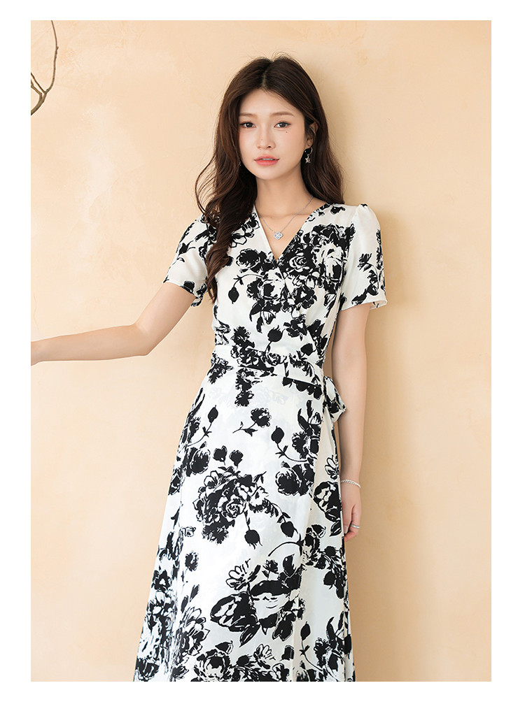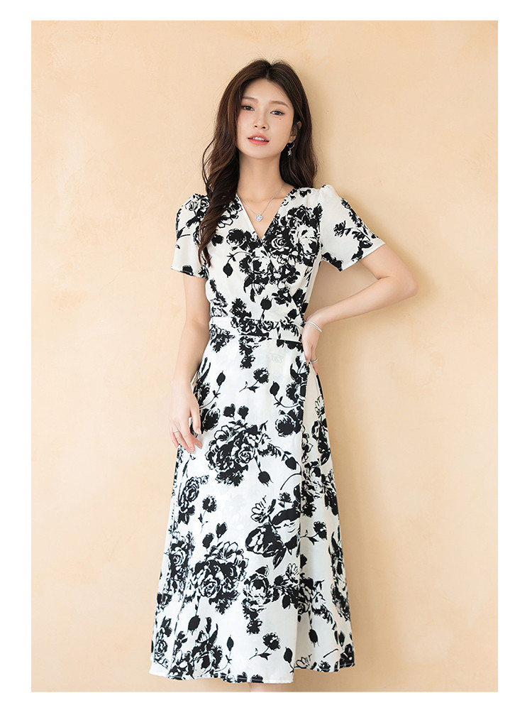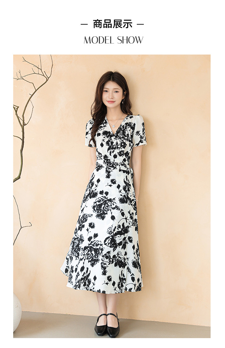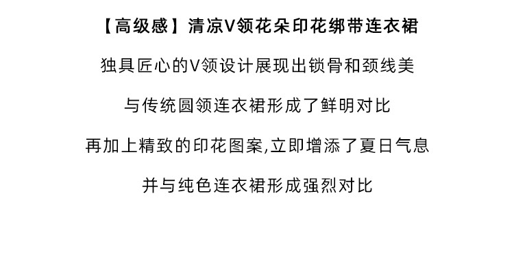 茶歇气质V领短袖精致一片式系带收腰显瘦碎花连衣裙女 190979