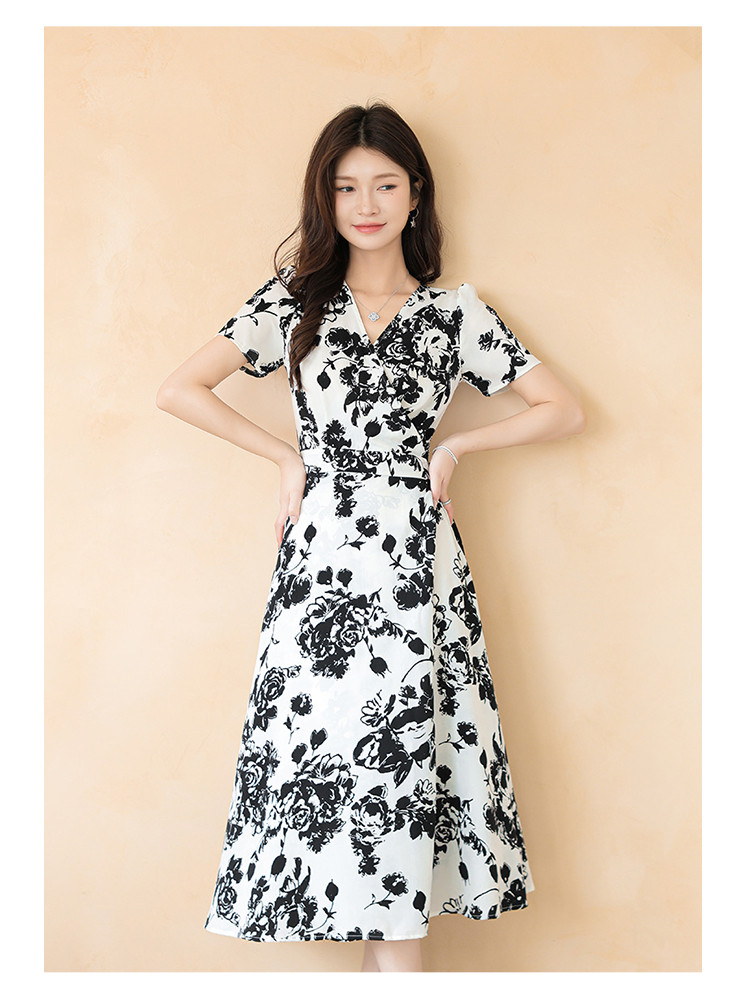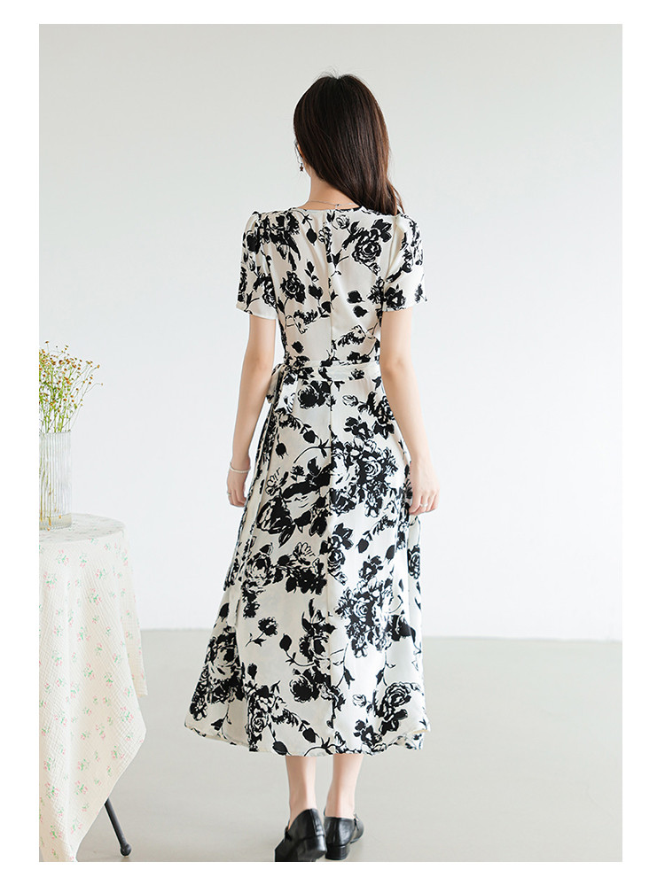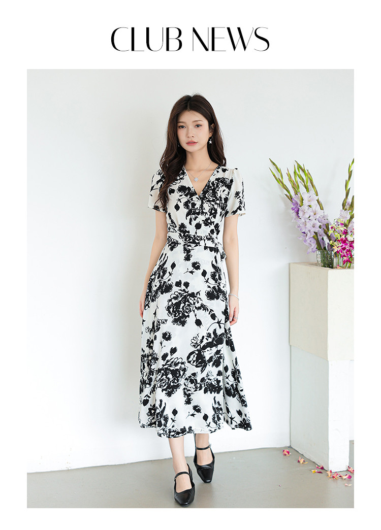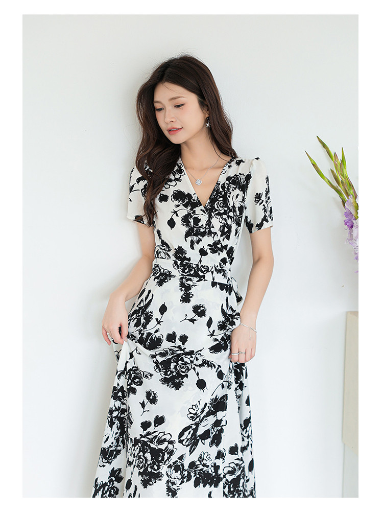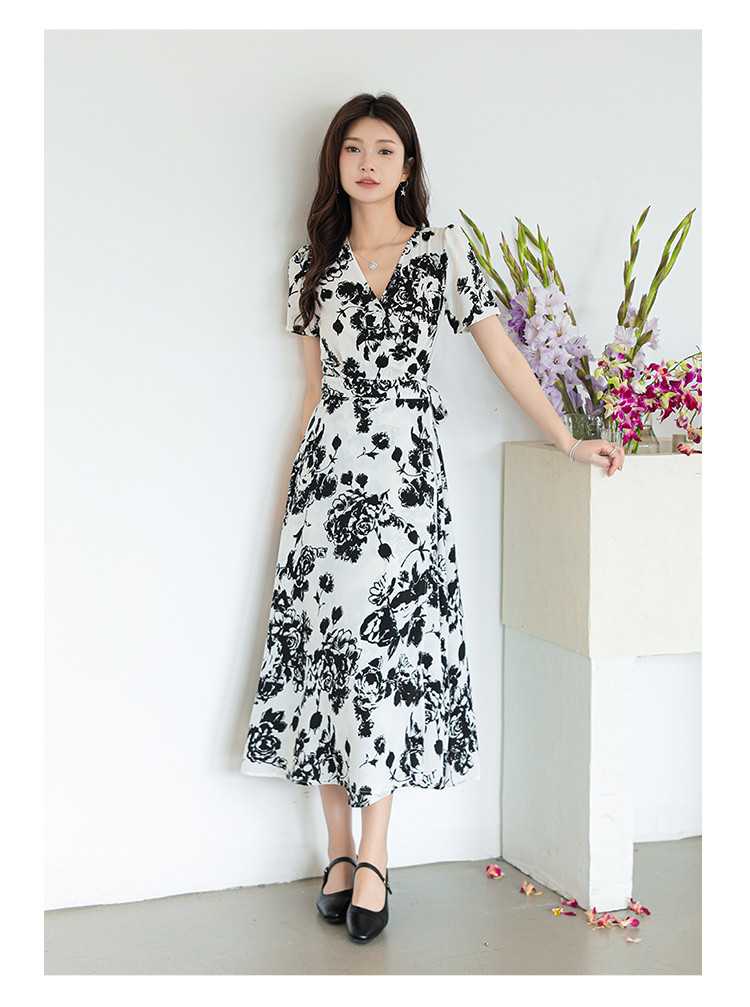 茶歇气质V领短袖精致一片式系带收腰显瘦碎花连衣裙女 190979