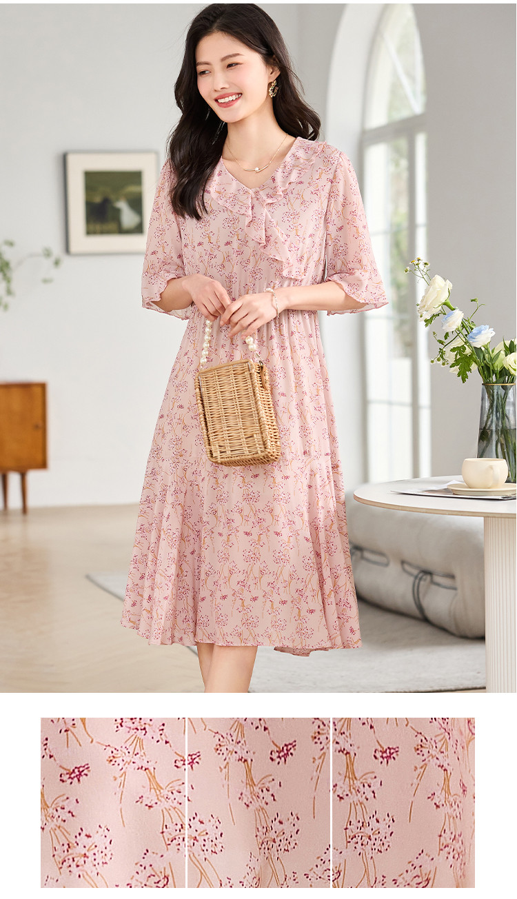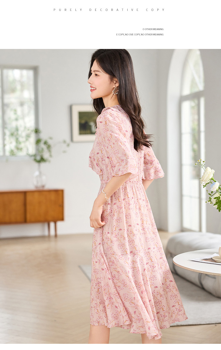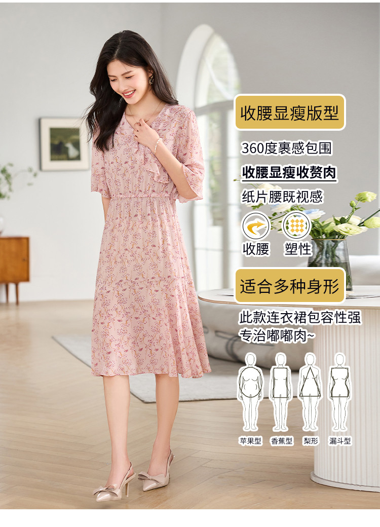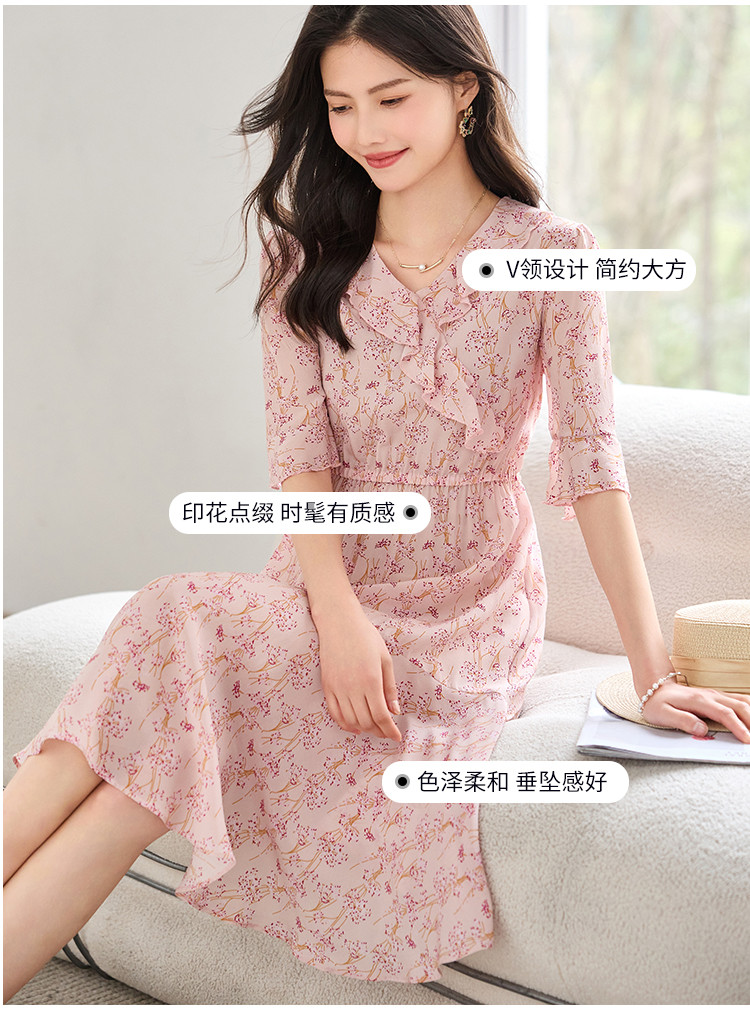 商品名称:浪漫印花2025夏季女装时尚真丝荷叶领桑蚕丝显瘦连衣裙 987224