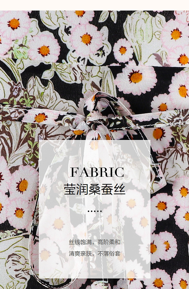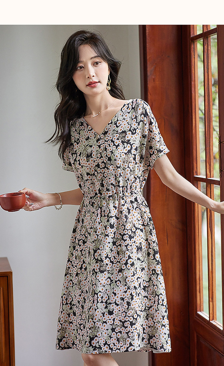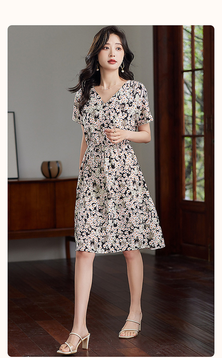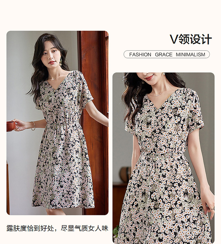 商品名称:【淑女慵懒OOTD】夏V领柔润真丝桑蚕丝舒适藏肉连衣裙 443201