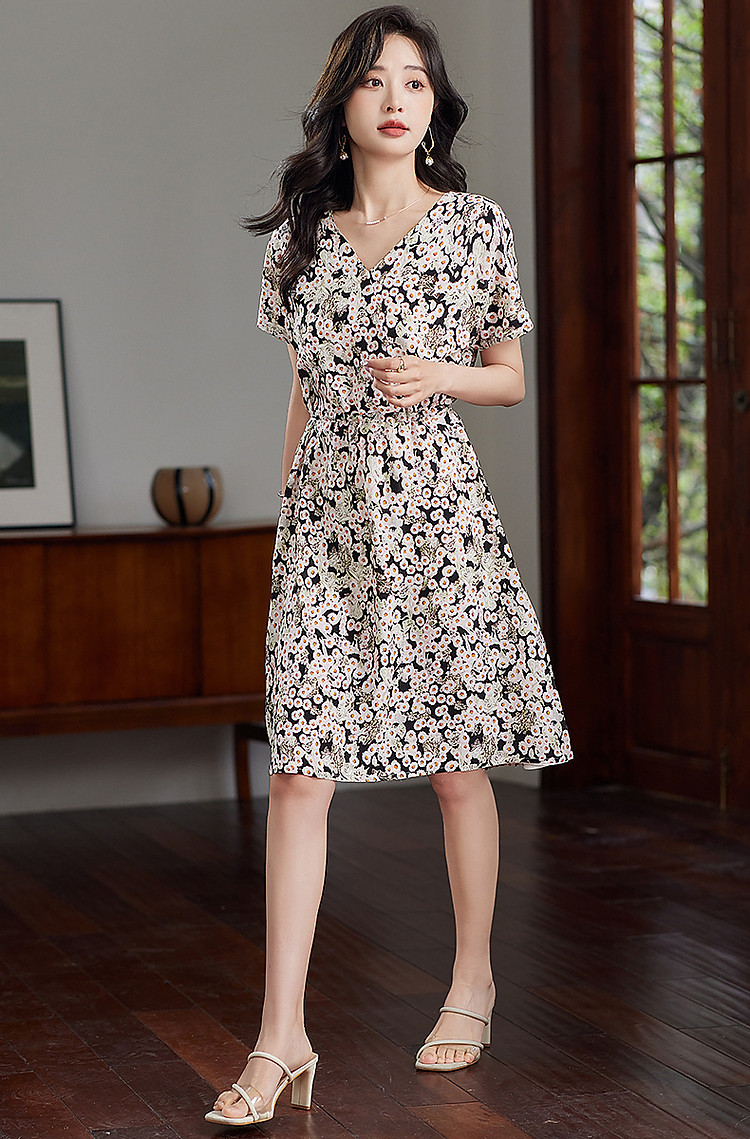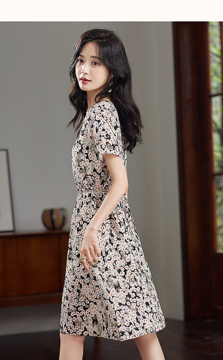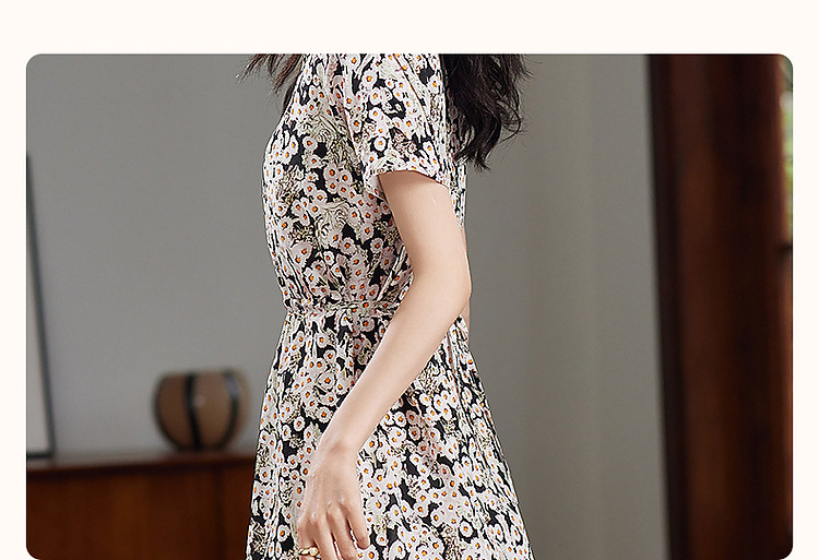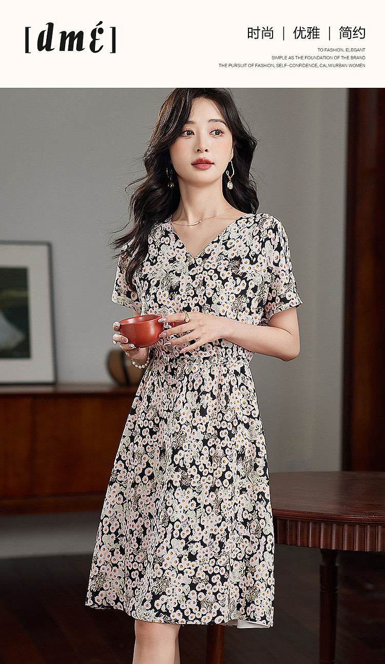 商品名称:【淑女慵懒OOTD】夏V领柔润真丝桑蚕丝舒适藏肉连衣裙 443201
