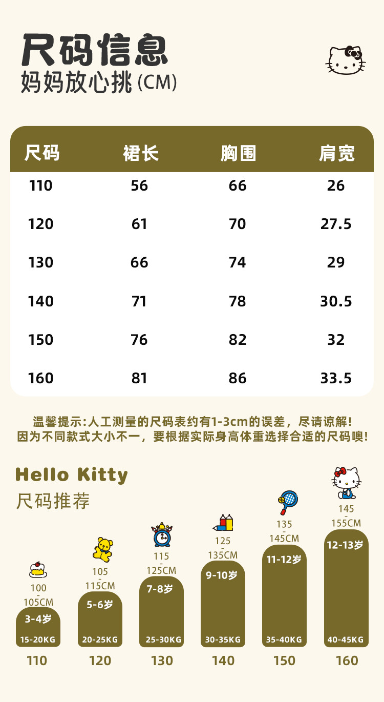 | 尺码 | 裙长(cm) | 肩宽(cm) | 身高(cm) | 适合年龄 | 胸围(cm) | 号型 |