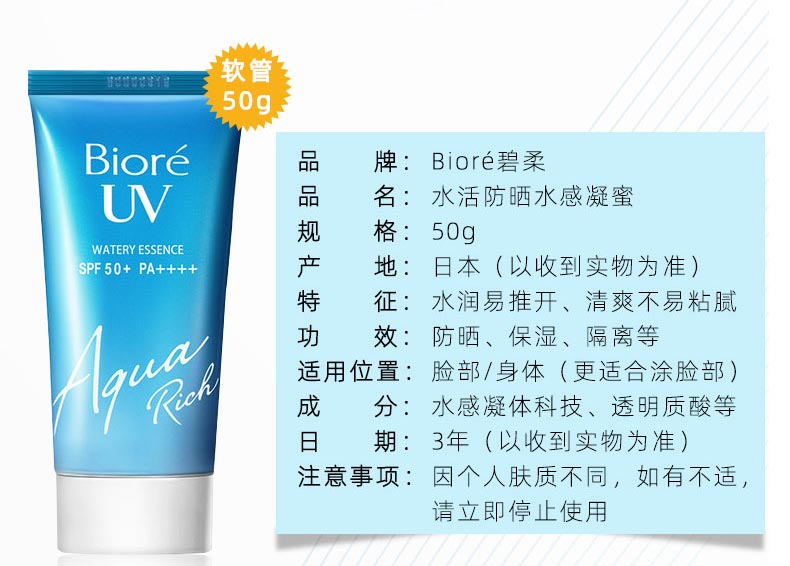 商品名称:碧柔Biore 防晒霜防晒乳 50g 水感遮阳UV隔离啫喱 SPF50+ PA++++