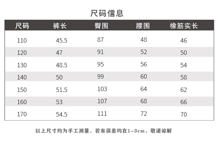 | 尺码 | 身高(cm) | 腰围(cm) | 裤长(cm) | 臀围(cm) | 适合年龄 | 号型 |