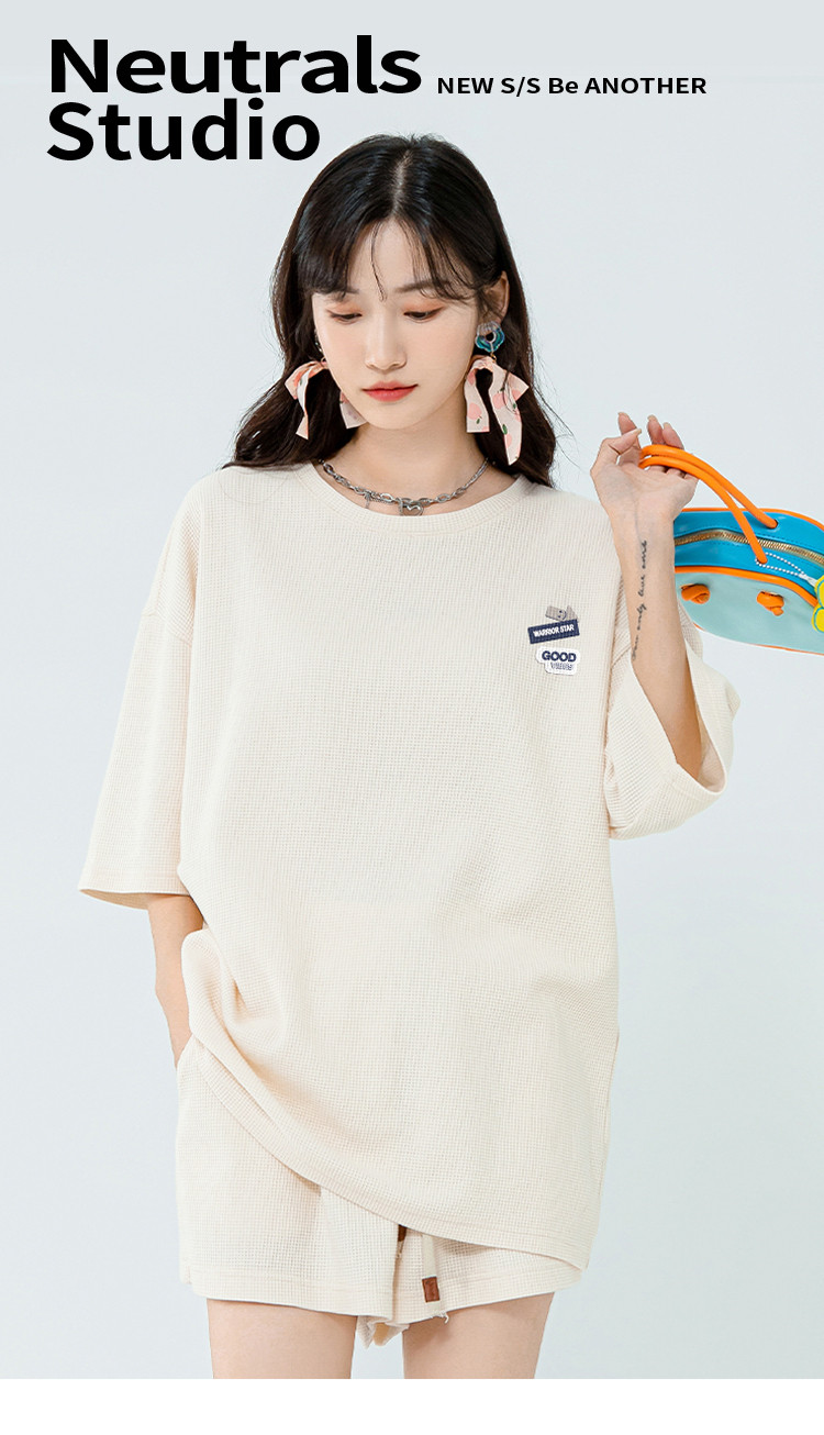 商品名称:【女装】华夫格运动套装女夏季宽松重磅中长T三分短裤两件套 757971