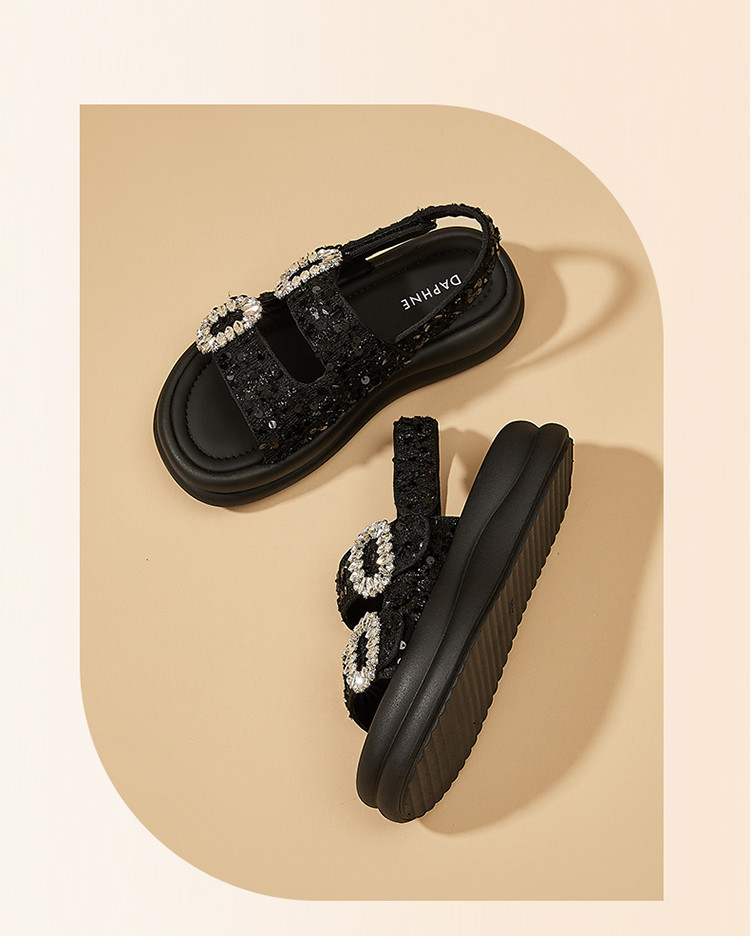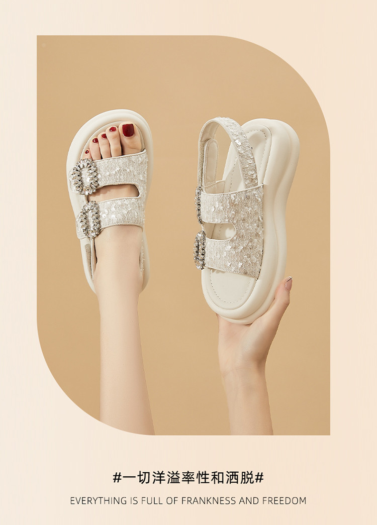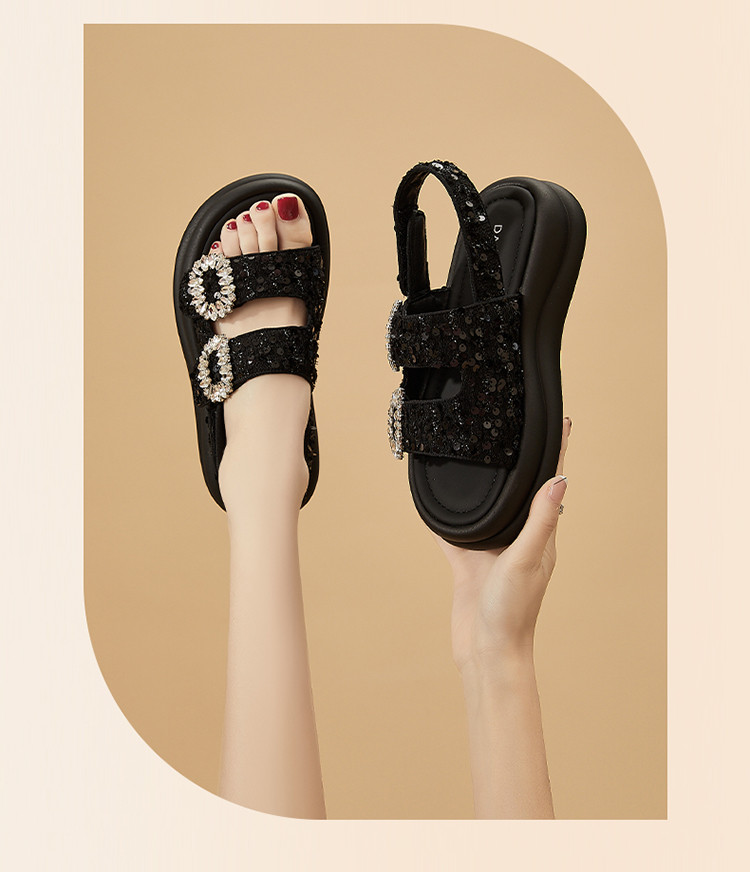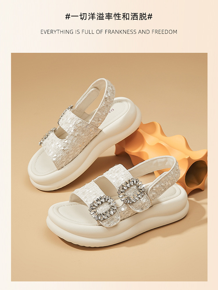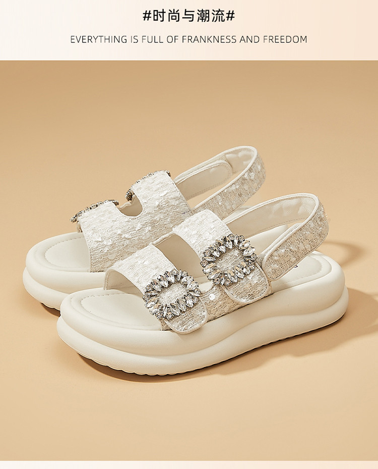 2025夏季闪耀水钻亮片设计厚底凉鞋纯色百搭透气魔术贴女鞋 991770