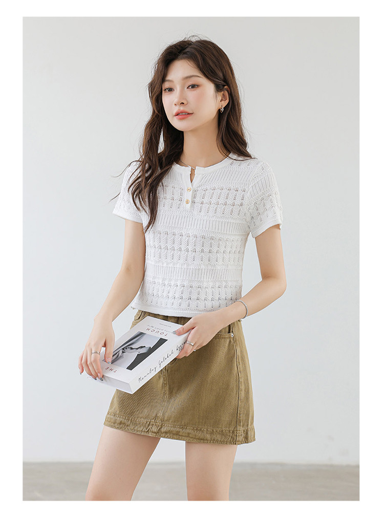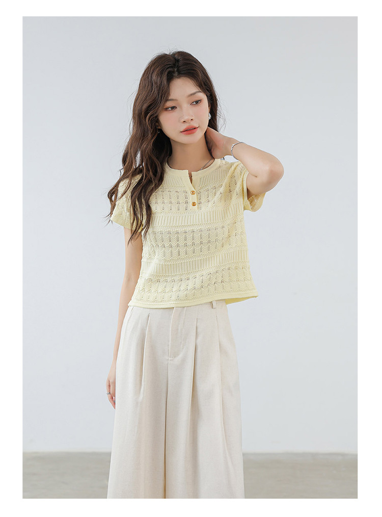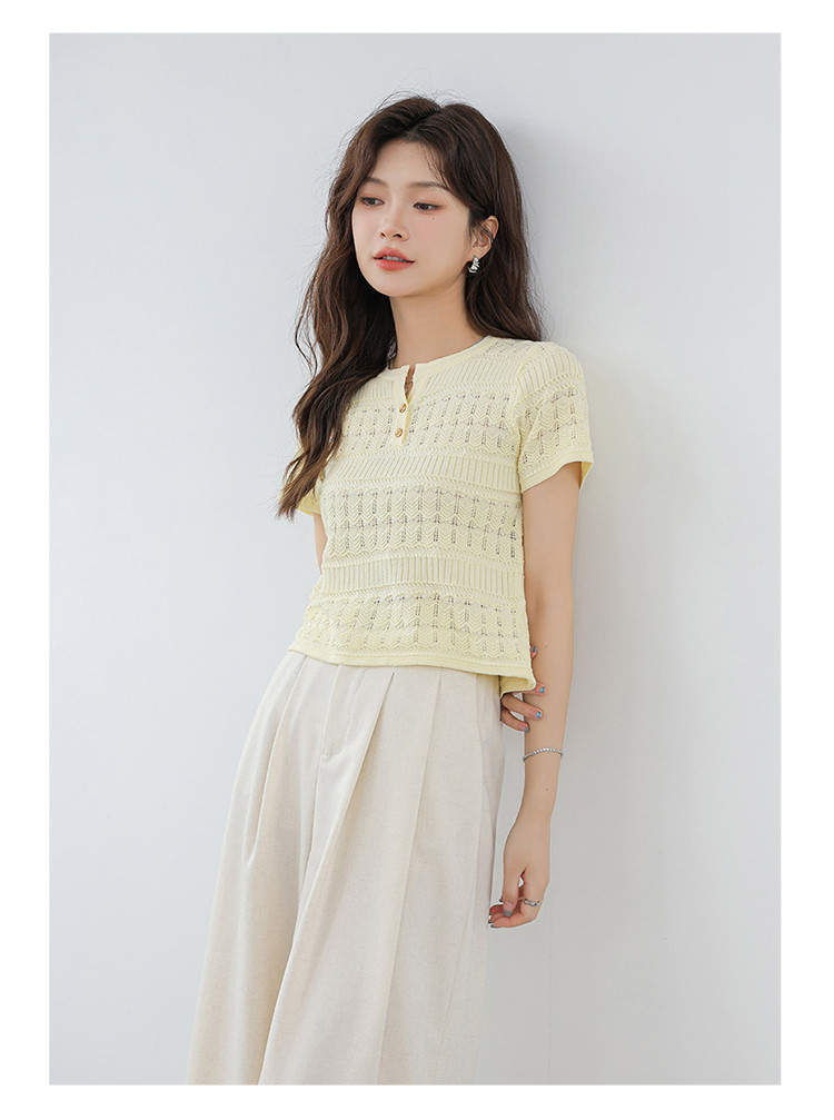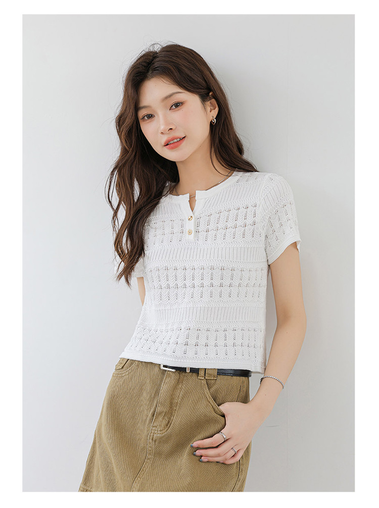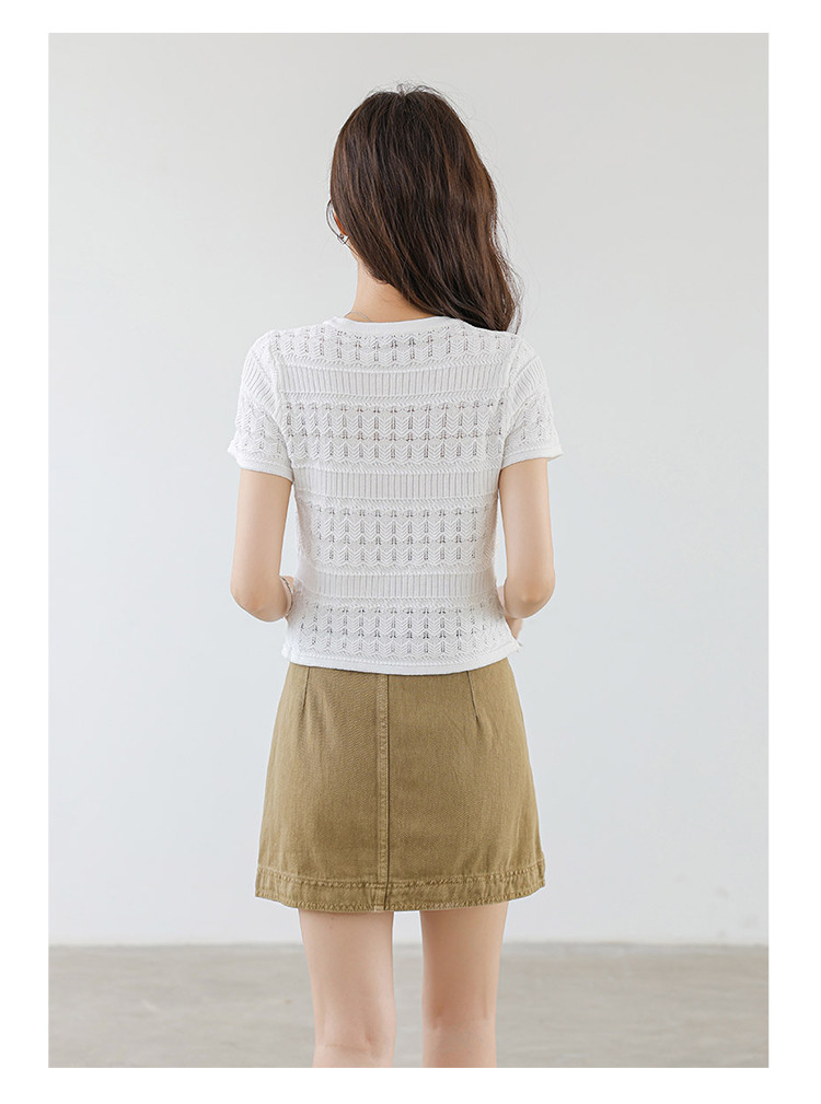 商品名称:法式镂空冰丝针织短袖法式高级小众设计款小金扣上衣女 191811