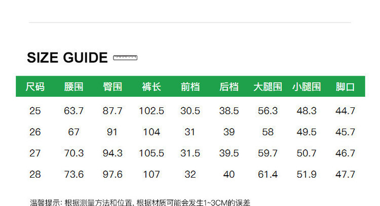 | 尺码 | 大腿围(cm) | 裤脚围(cm) | 前浪(cm) | 后浪(cm) | 腰围(cm) | 裤长(cm) | 膝围(cm) | 臀围(cm) | 号型 |