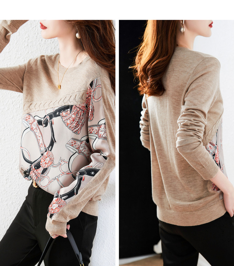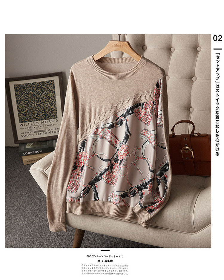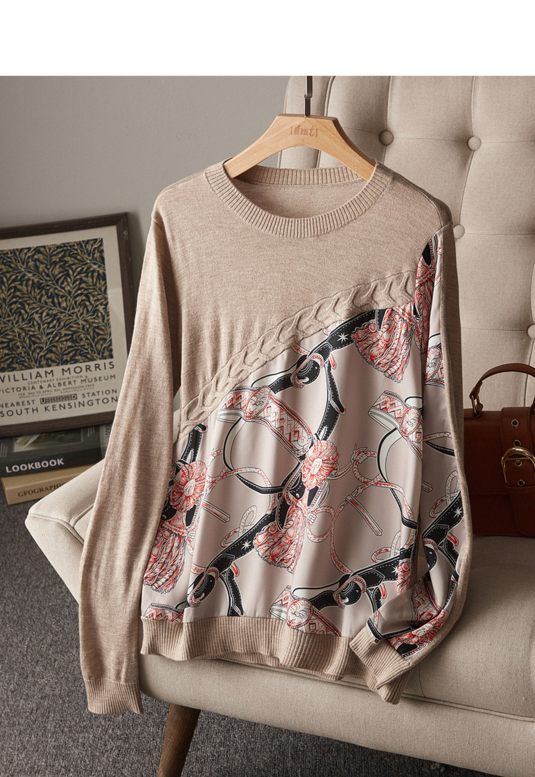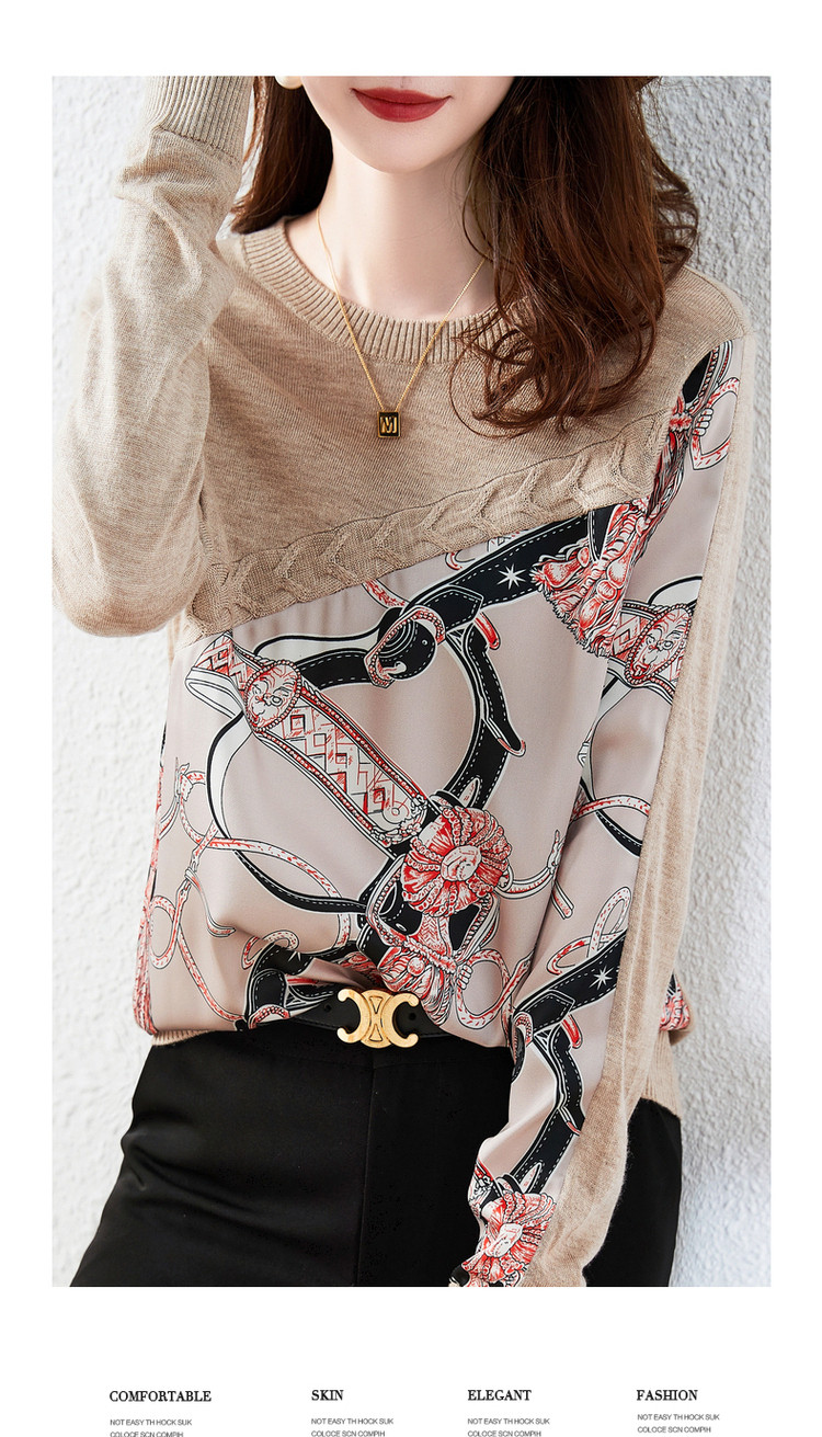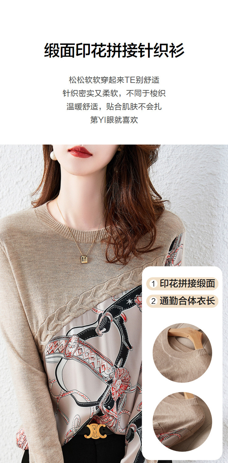 商品名称:【缎面印花拼接毛衣】春秋新圆领宽松合体通勤女式针织衫女 465473
