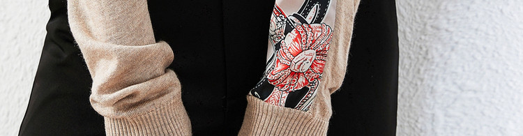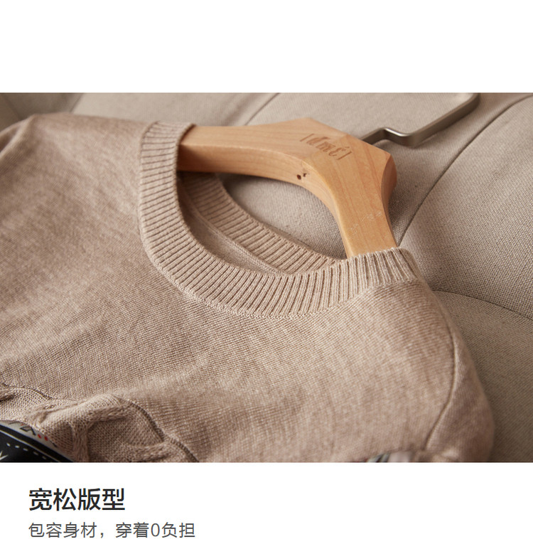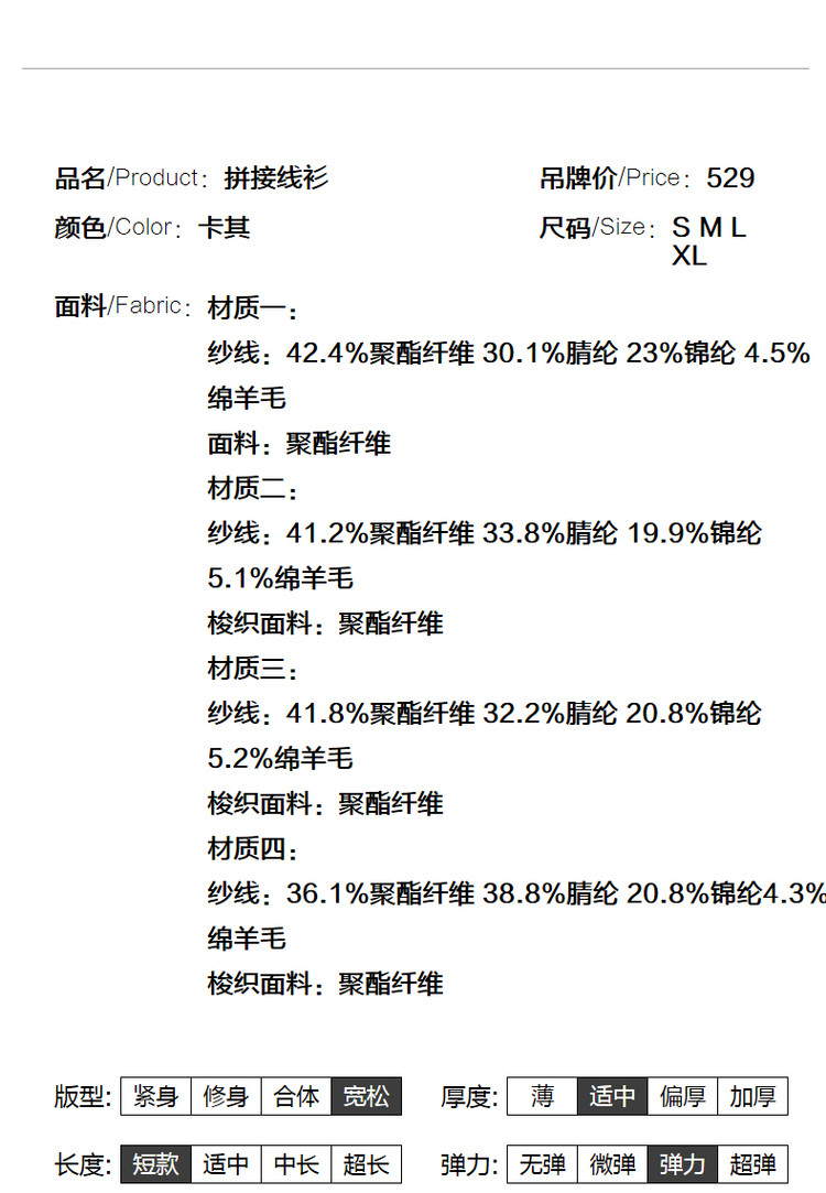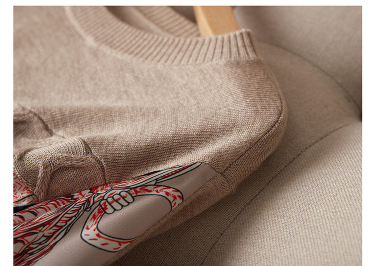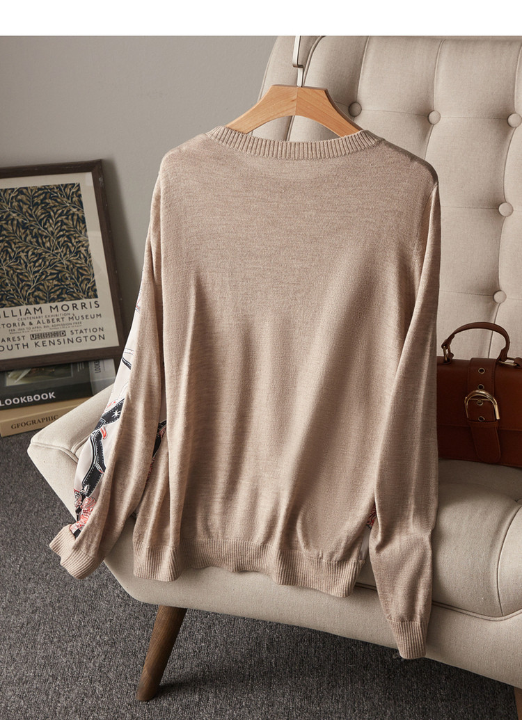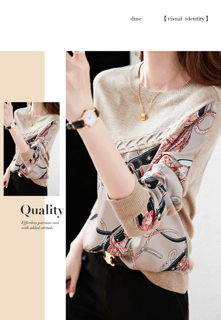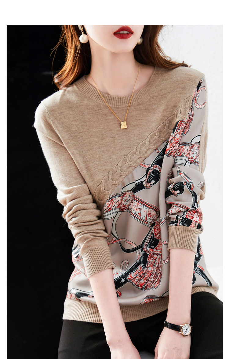 商品名称:【缎面印花拼接毛衣】春秋新圆领宽松合体通勤女式针织衫女 465473