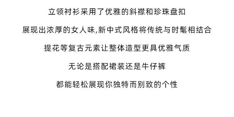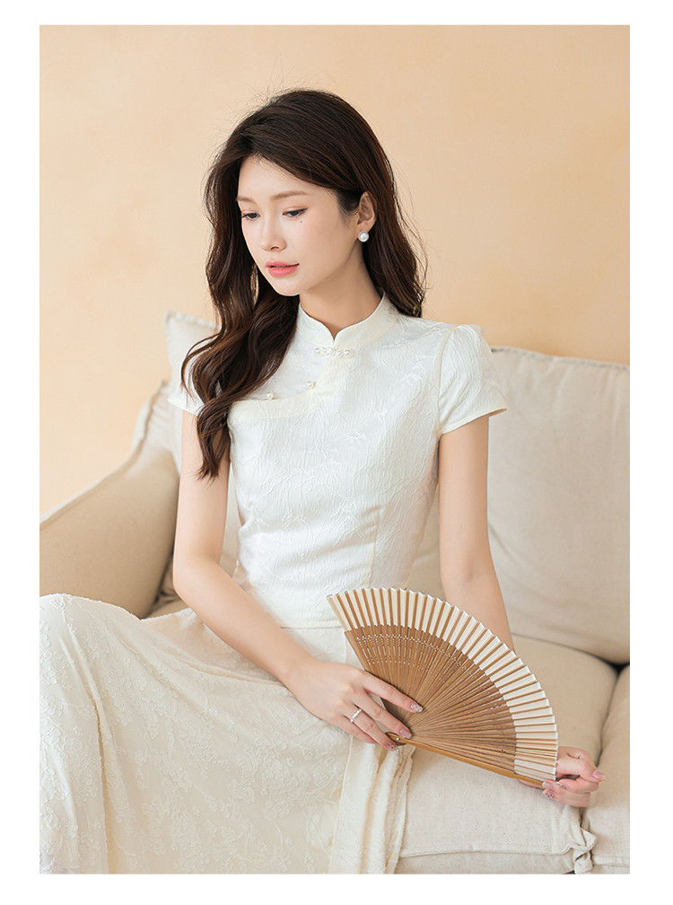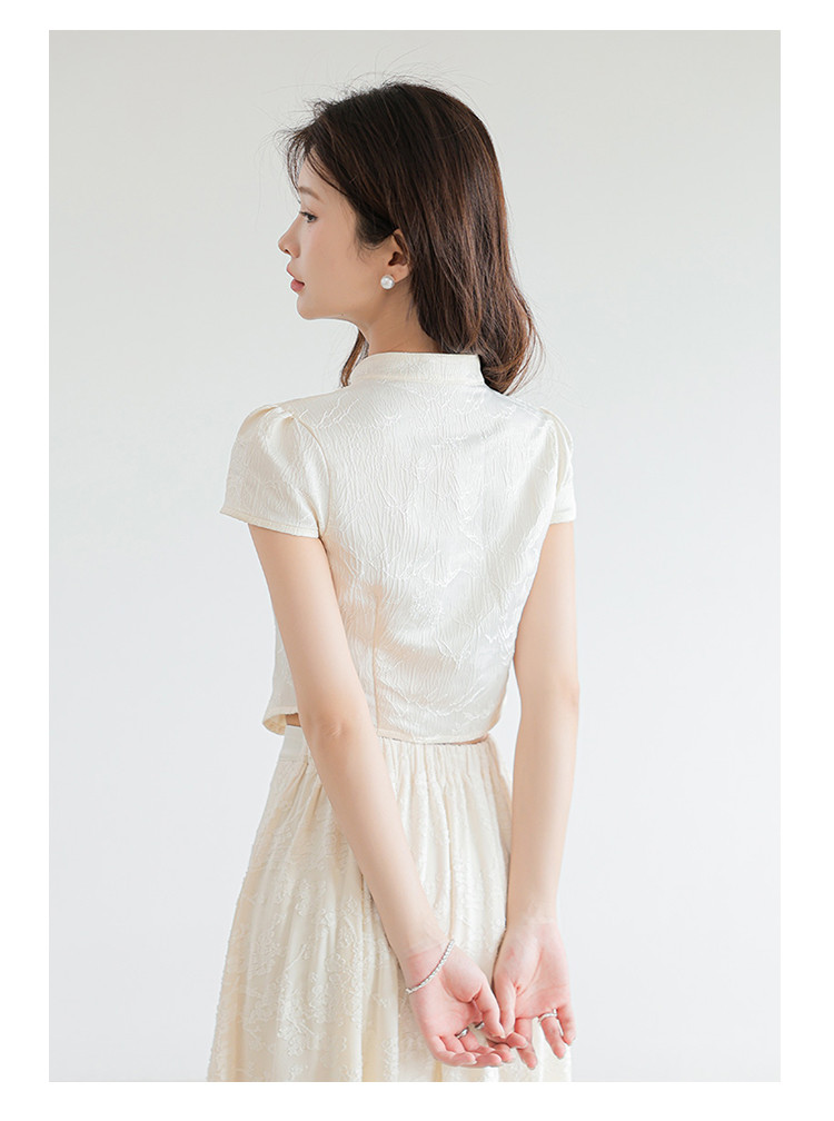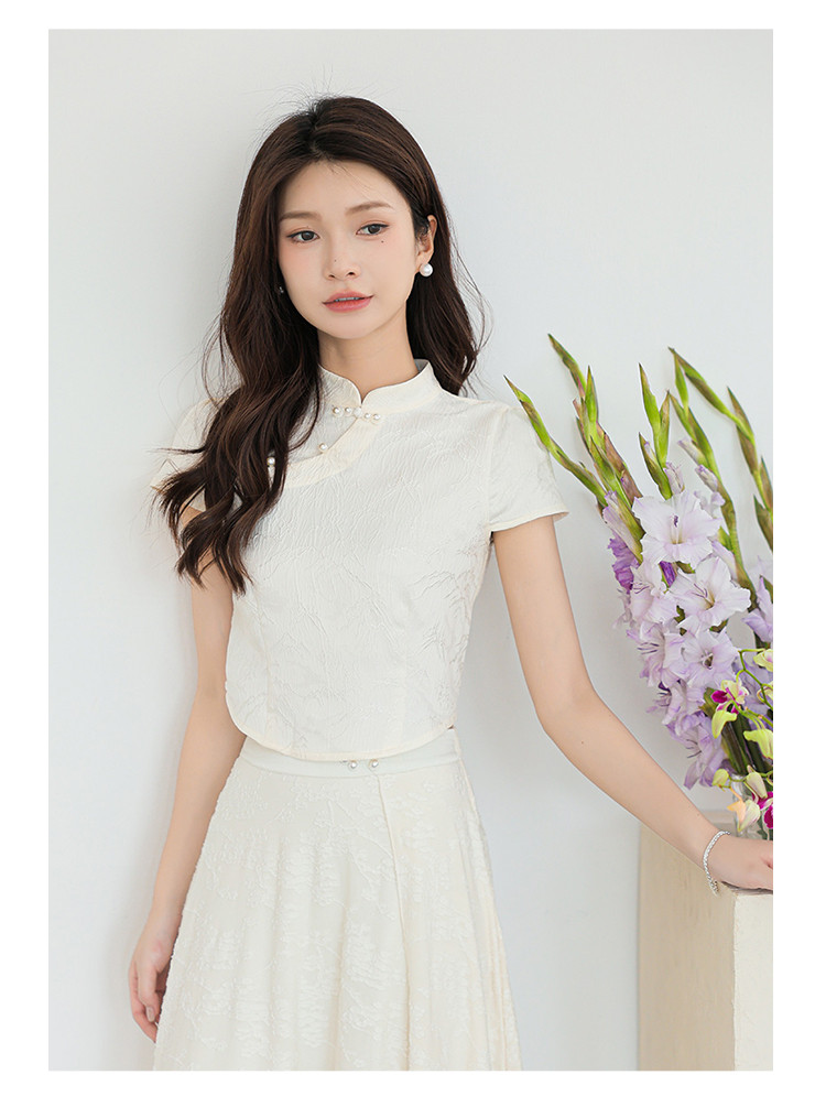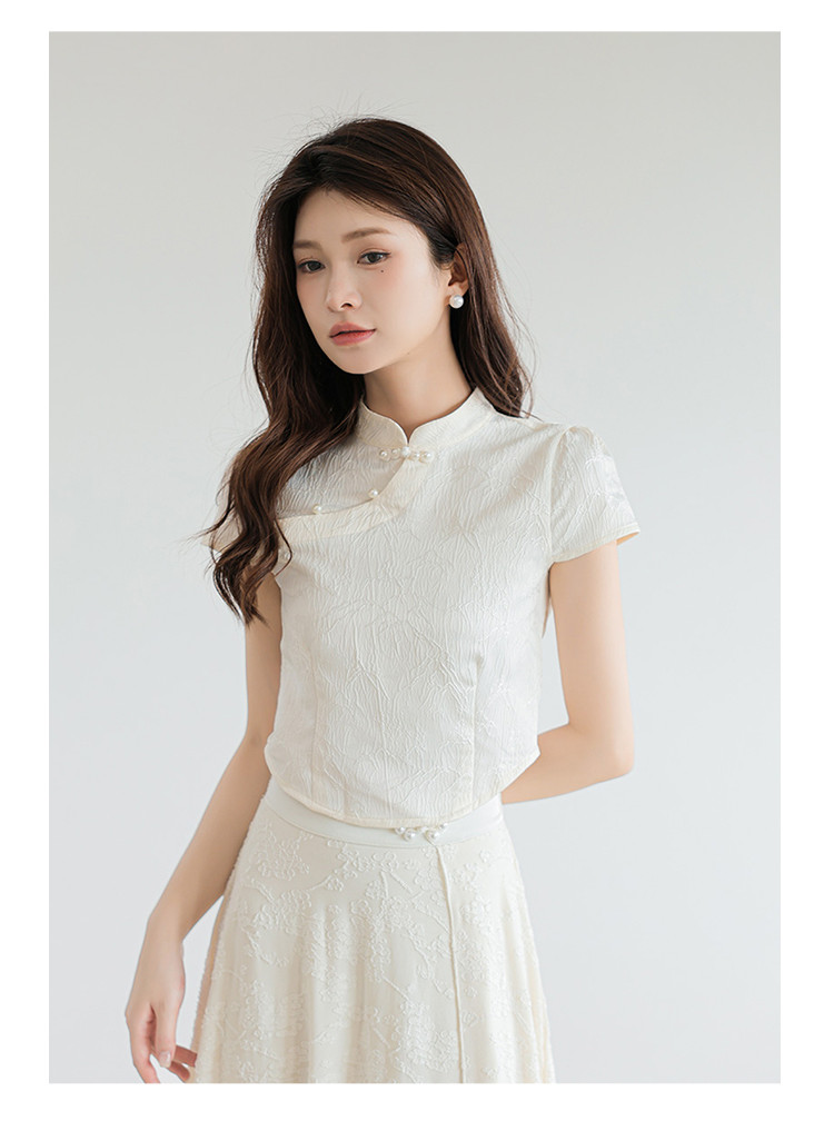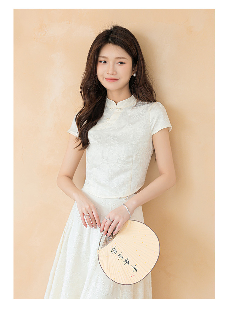 商品名称:新中式国风缎面短袖立领斜襟上衣珍珠扣提花气质温柔衬衫女 203267