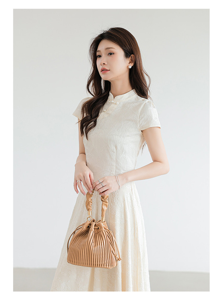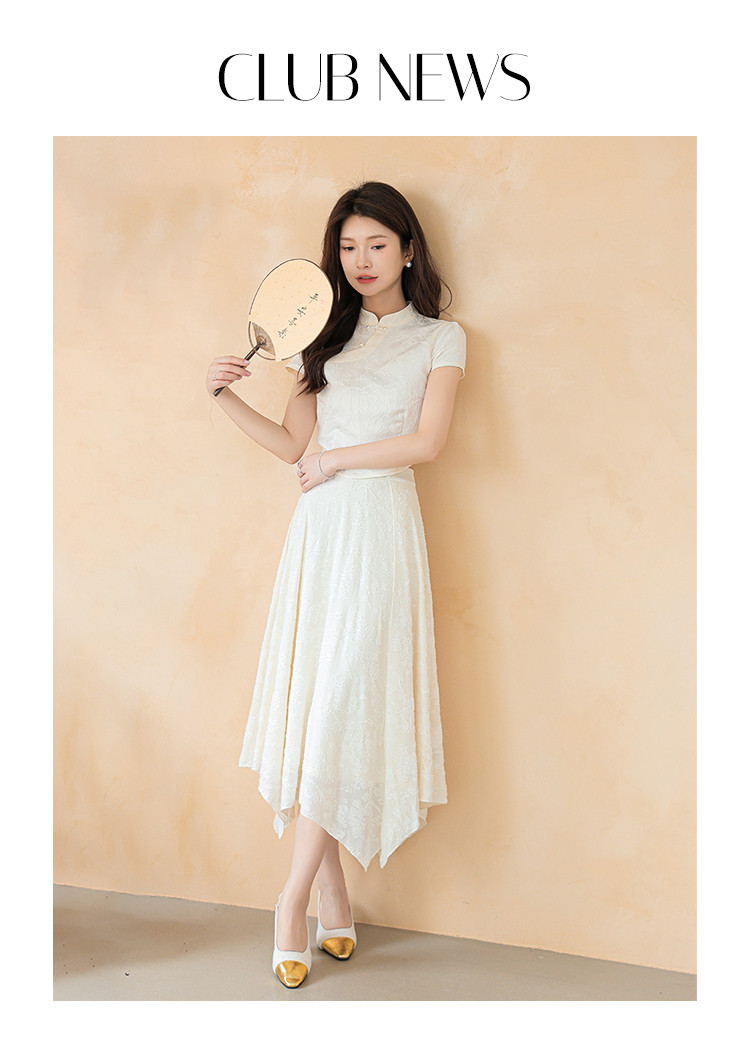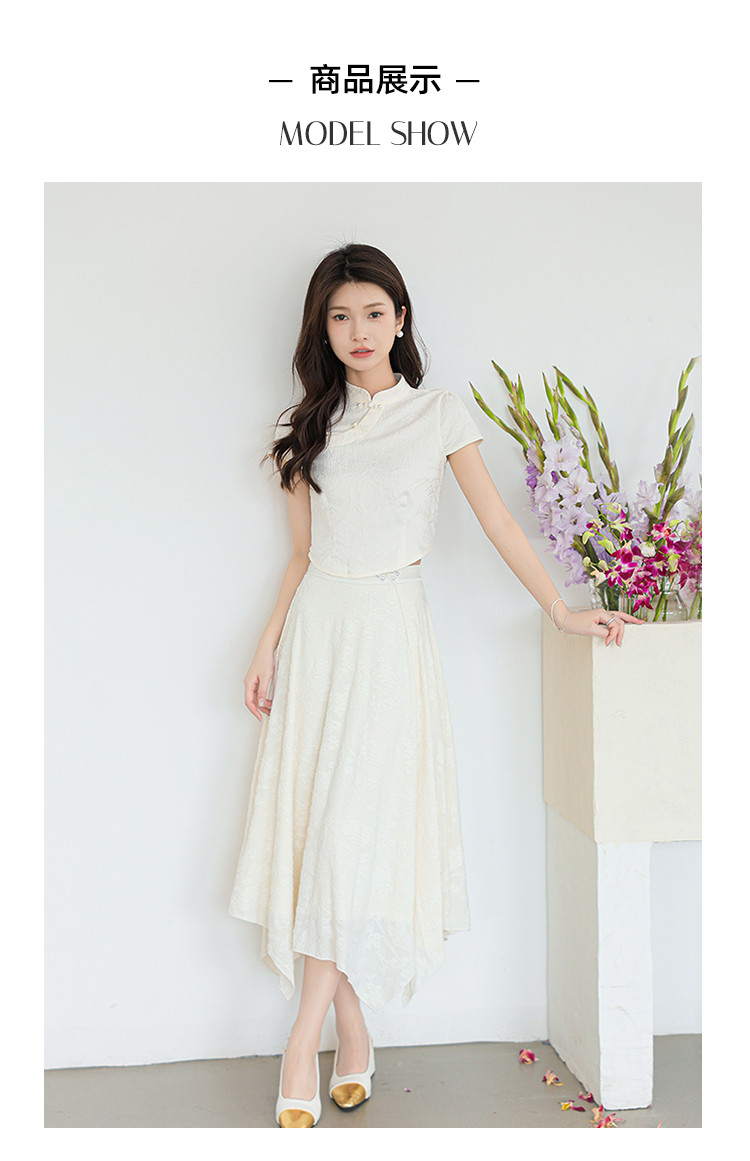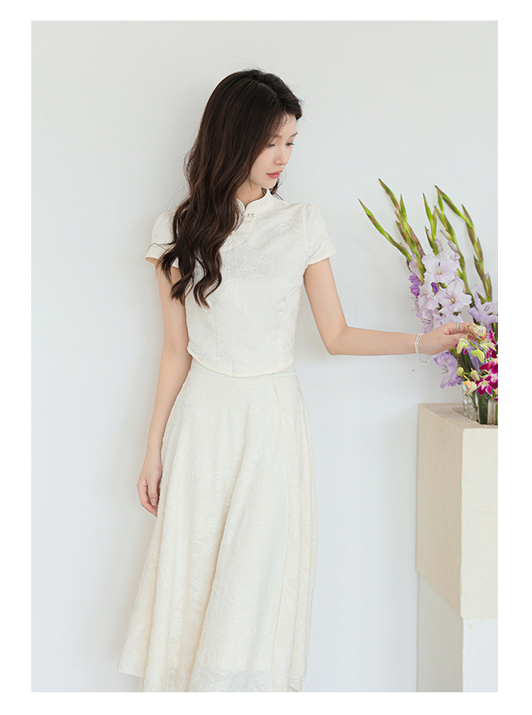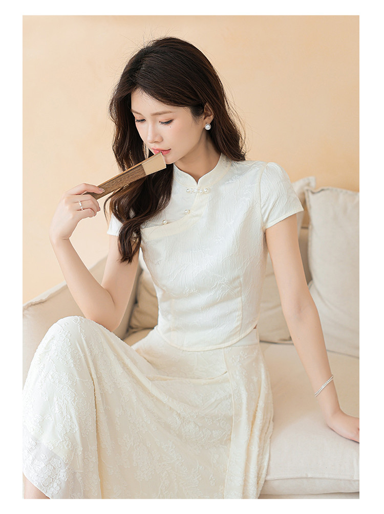 商品名称:新中式国风缎面短袖立领斜襟上衣珍珠扣提花气质温柔衬衫女 203267