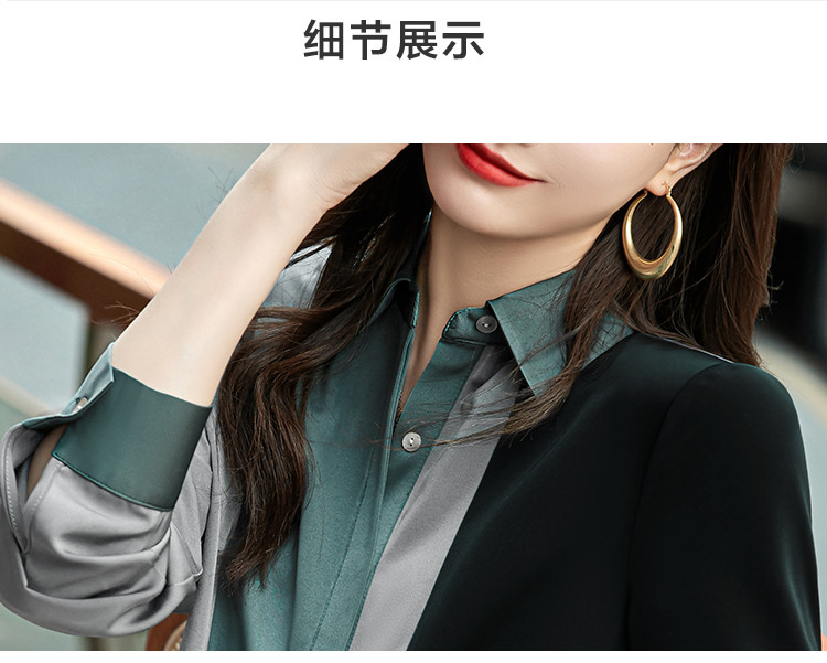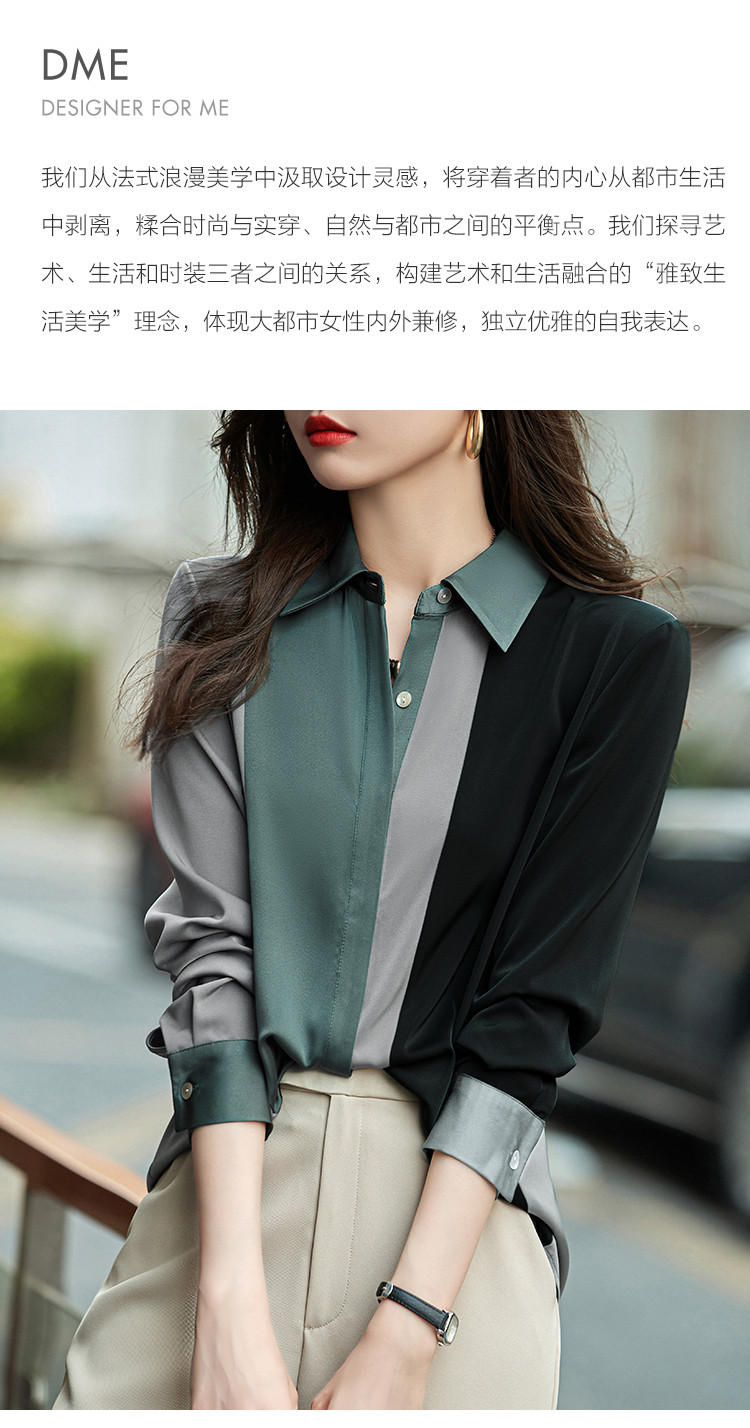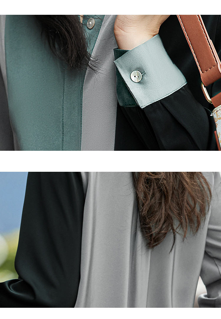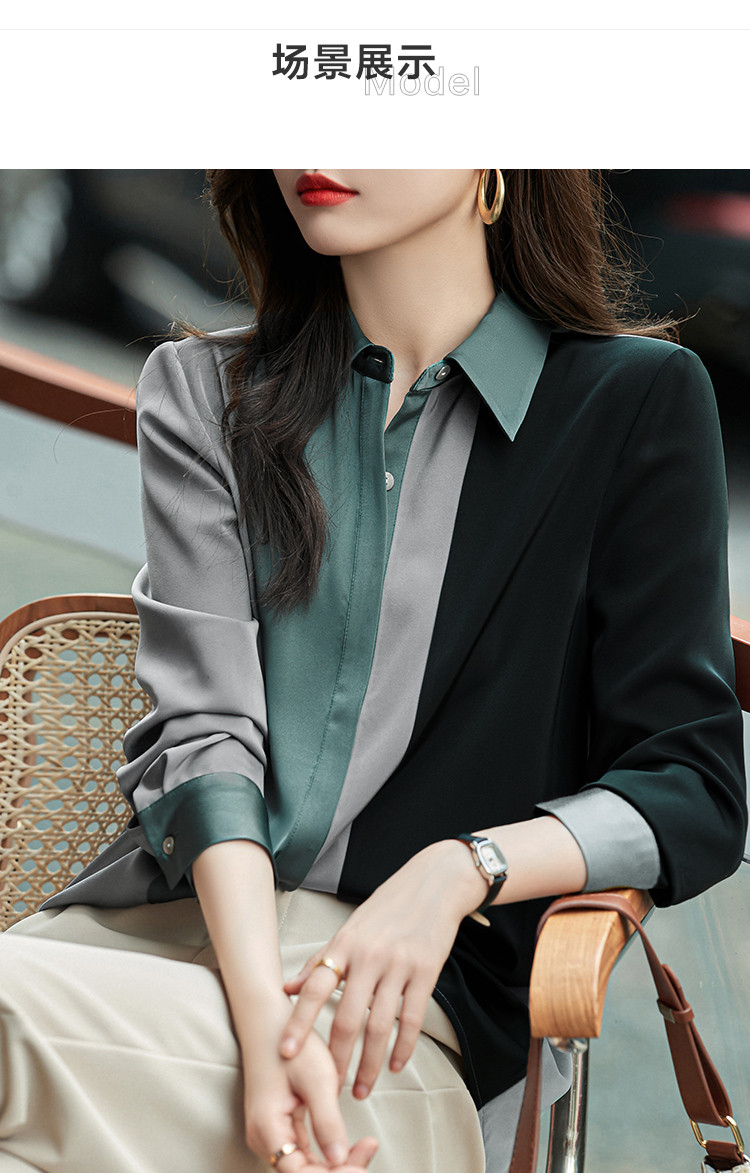 【缎面雪纺衬衫】秋款直筒长袖几何印花拼色衬衣女装上衣 057217