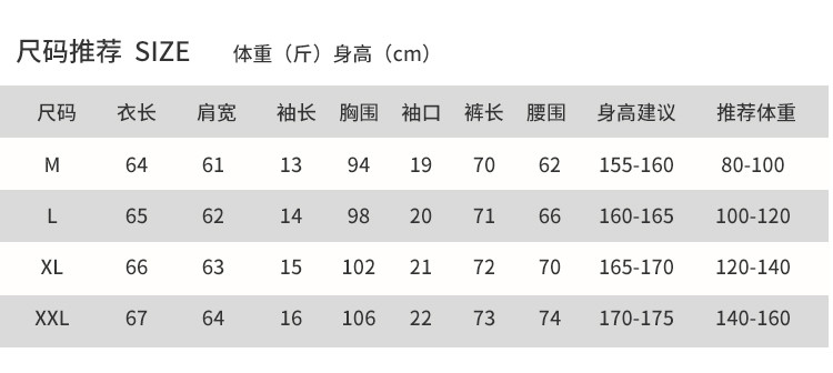 | 尺码 | 肩宽(cm) | 袖长(cm) | 上装号型 | 下装号型 | 衣长(cm) | 身高(cm) | 腰围(cm) | 裤长(cm) | 体重(kg) | 胸围(cm) | 号型 |