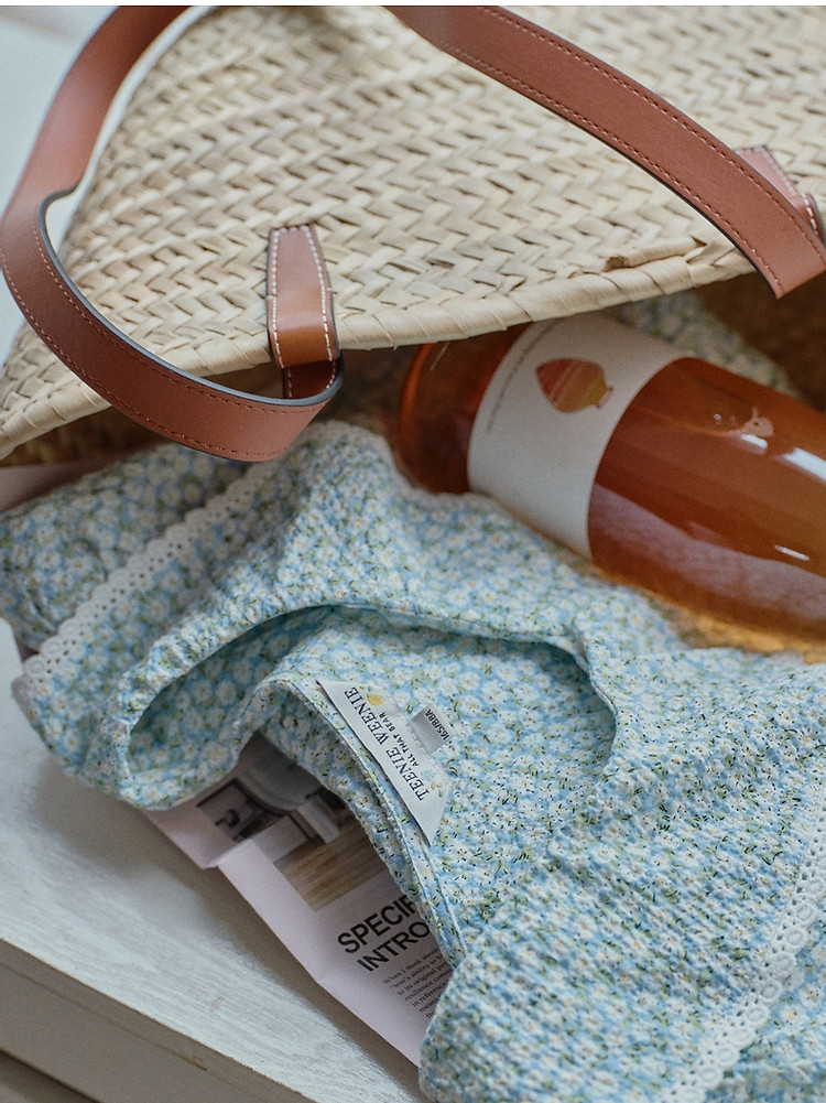 小熊荷叶边法式田园碎花连衣裙夏装收腰茶歇裙紫色女 352257