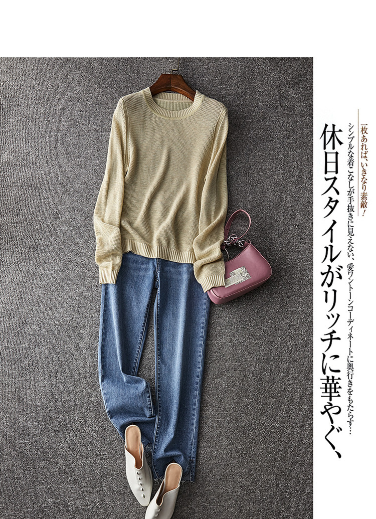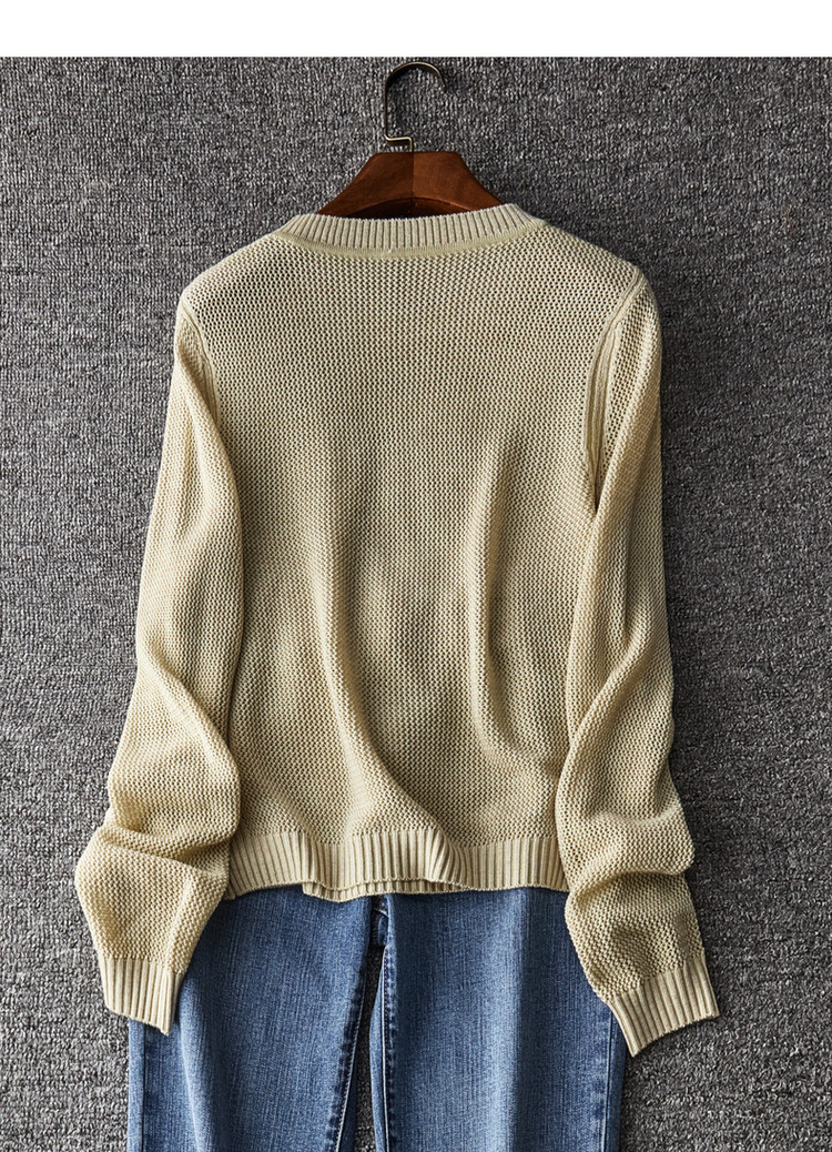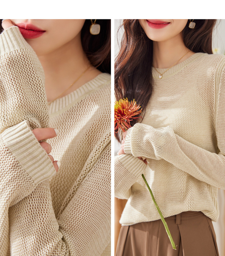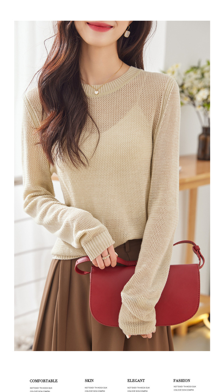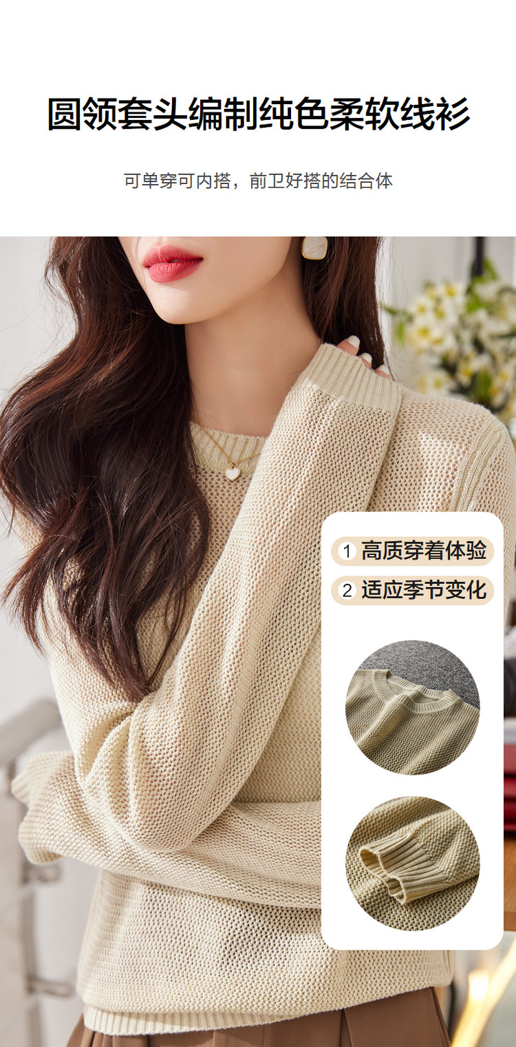 商品名称:【含绵羊毛】春季通勤圆领长袖镂空针织合体毛衣女春秋款 601409