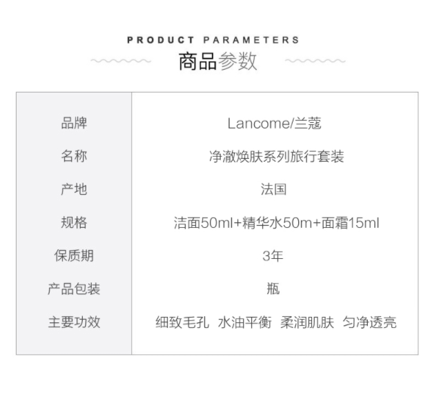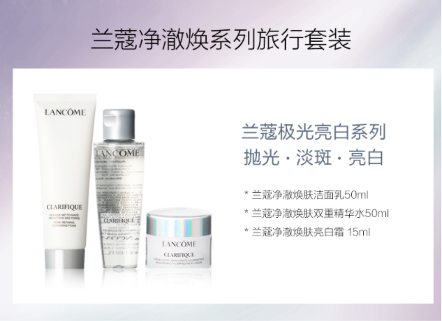 商品名称:Lancome/兰蔻 净澈焕肤中样旅行套装 极光洁面50ml+水50ml+面霜15ml
