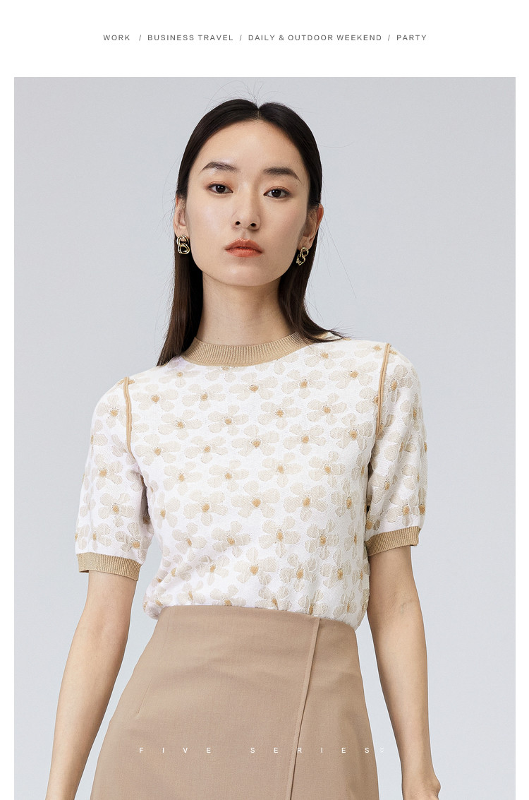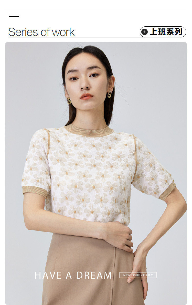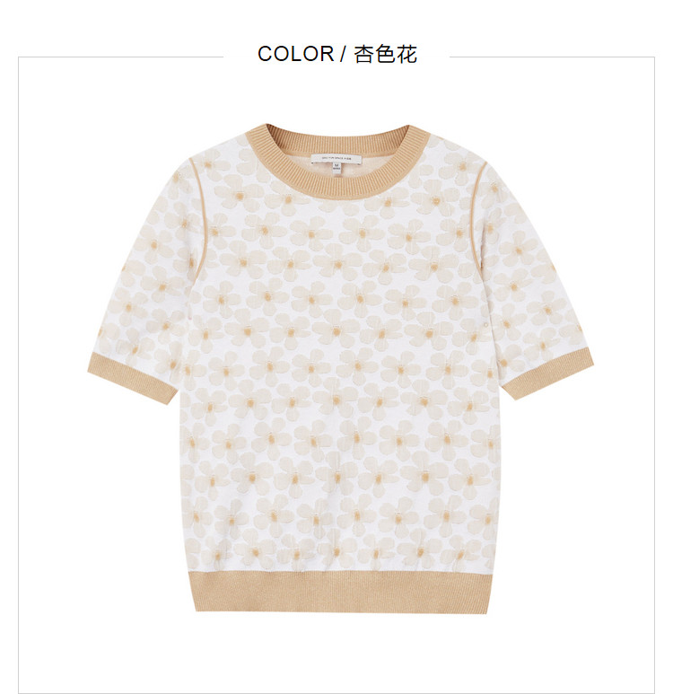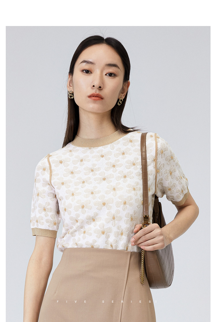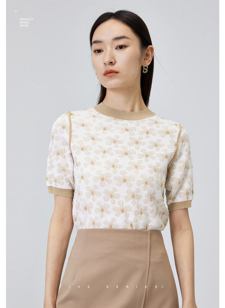 商品名称:圆领短袖T恤女夏款设计感百搭时尚薄针织衫女淑女气质花朵上衣女 159811