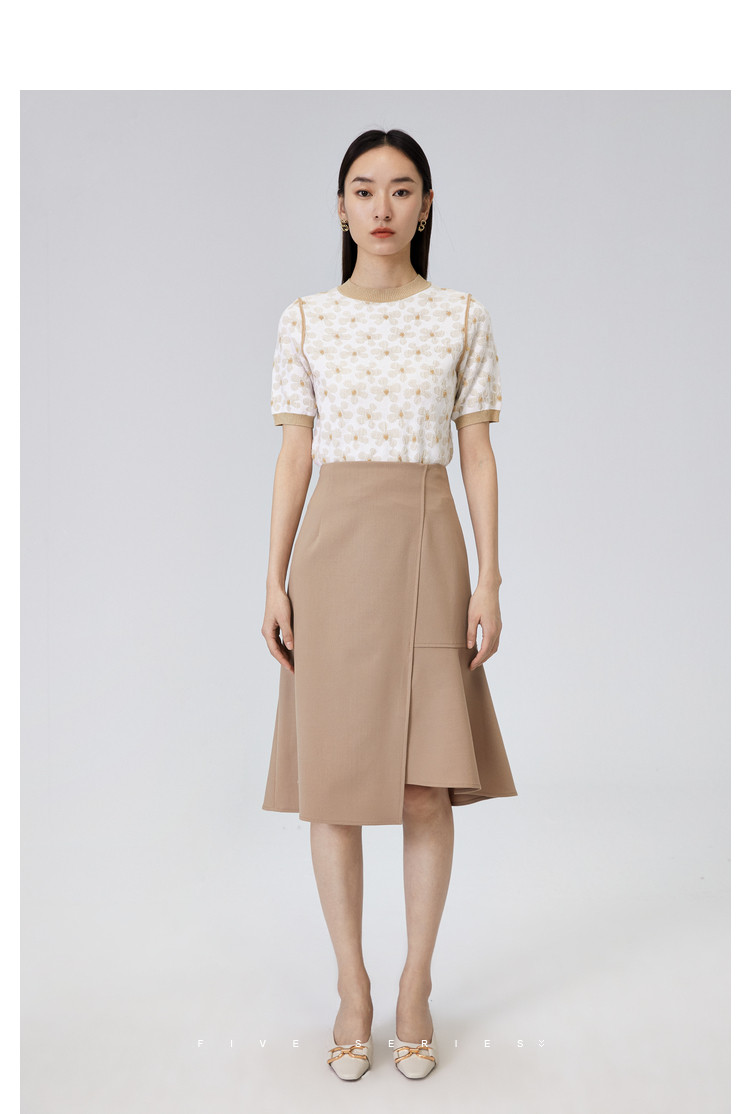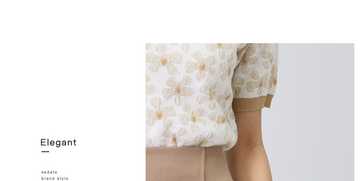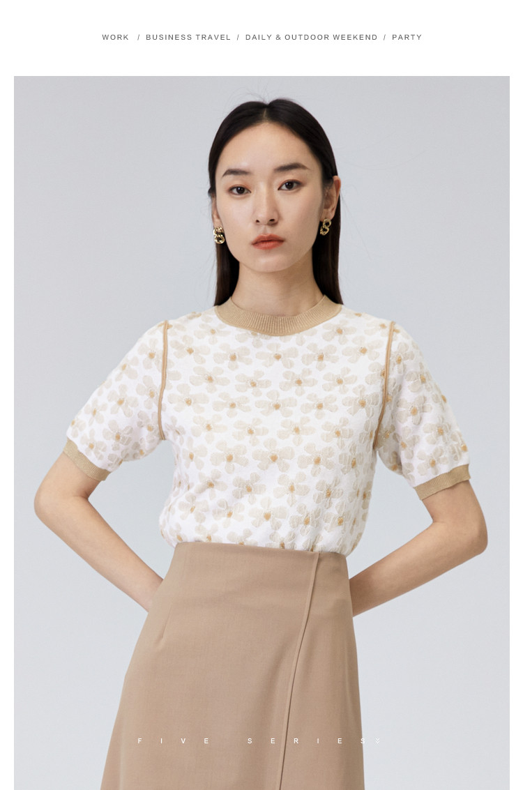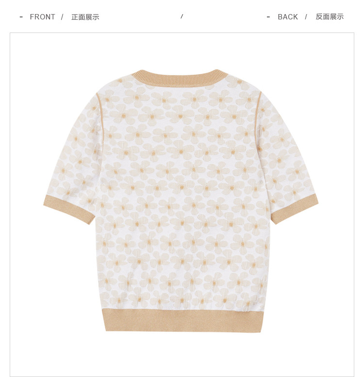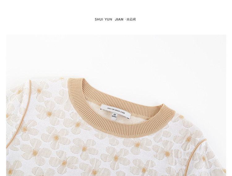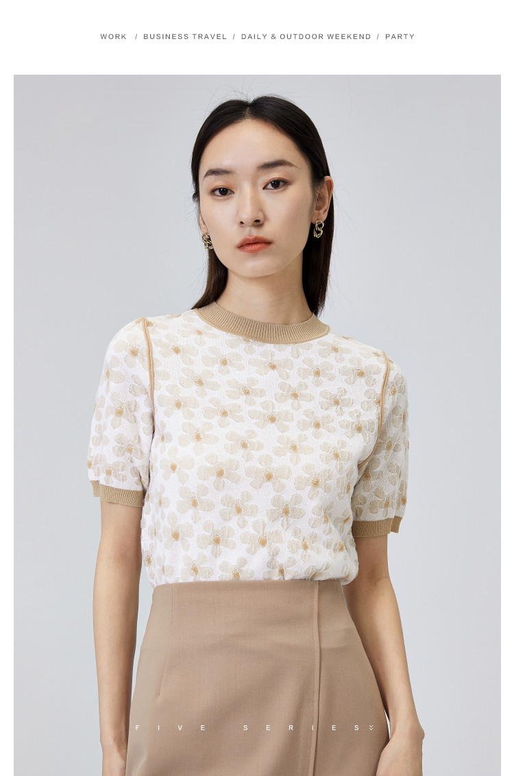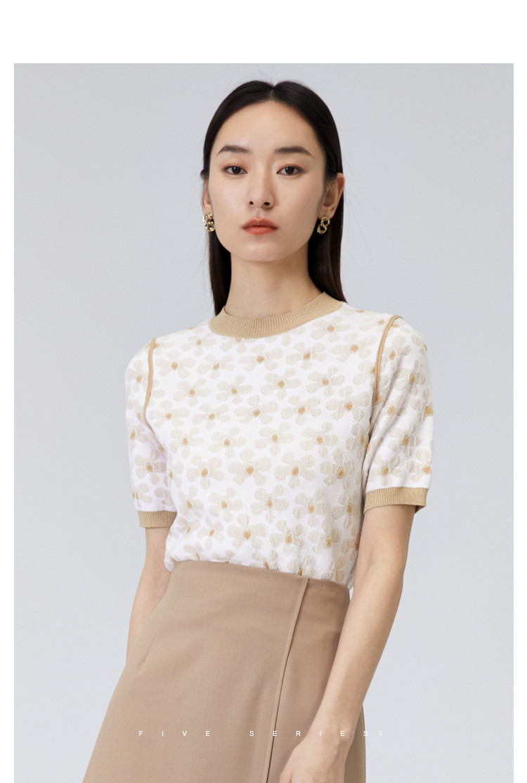 商品名称:圆领短袖T恤女夏款设计感百搭时尚薄针织衫女淑女气质花朵上衣女 159811