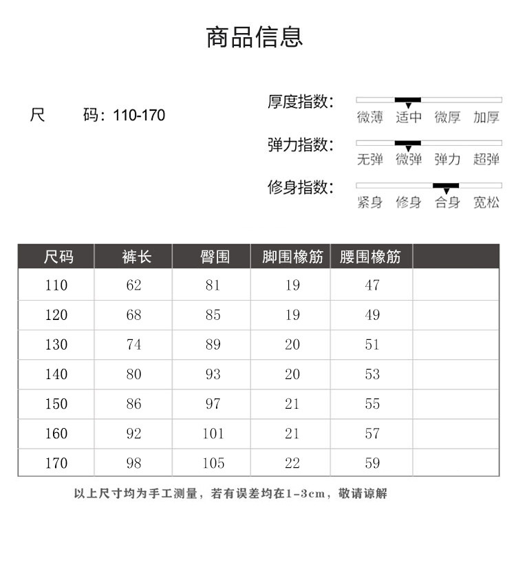 | 尺码 | 身高(cm) | 腰围(cm) | 裤长(cm) | 臀围(cm) | 适合年龄 | 号型 |