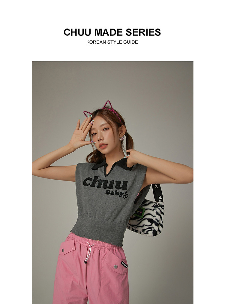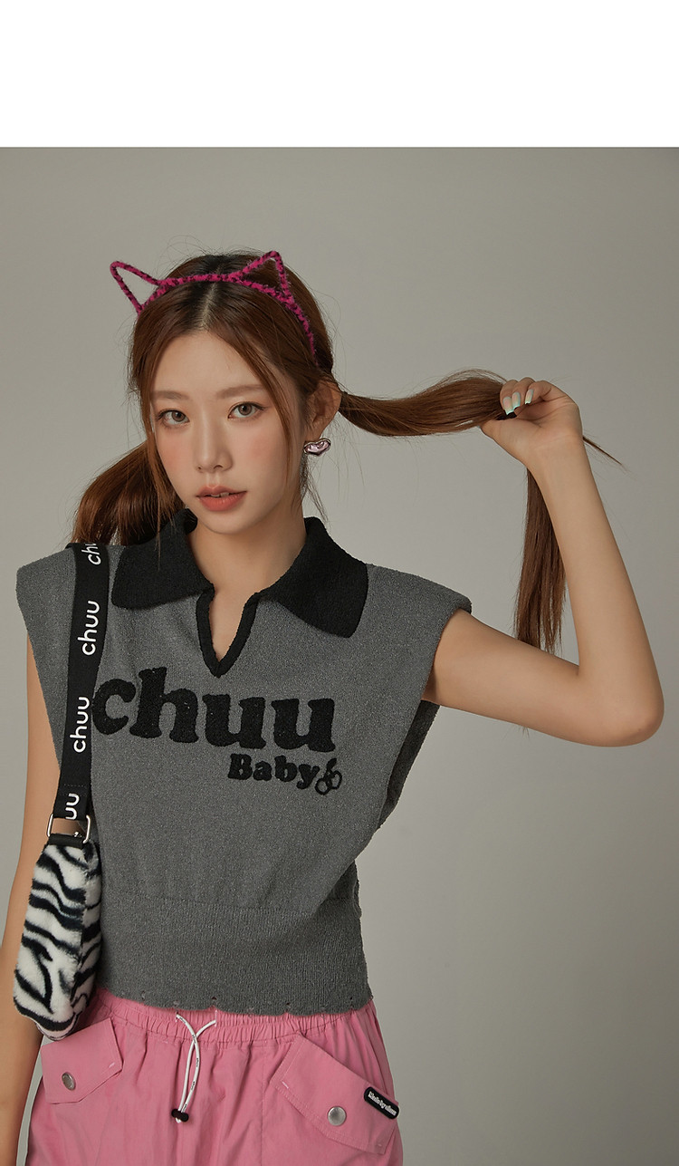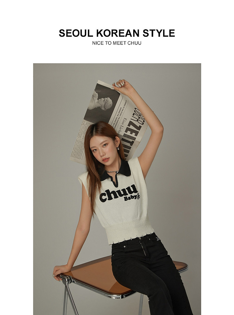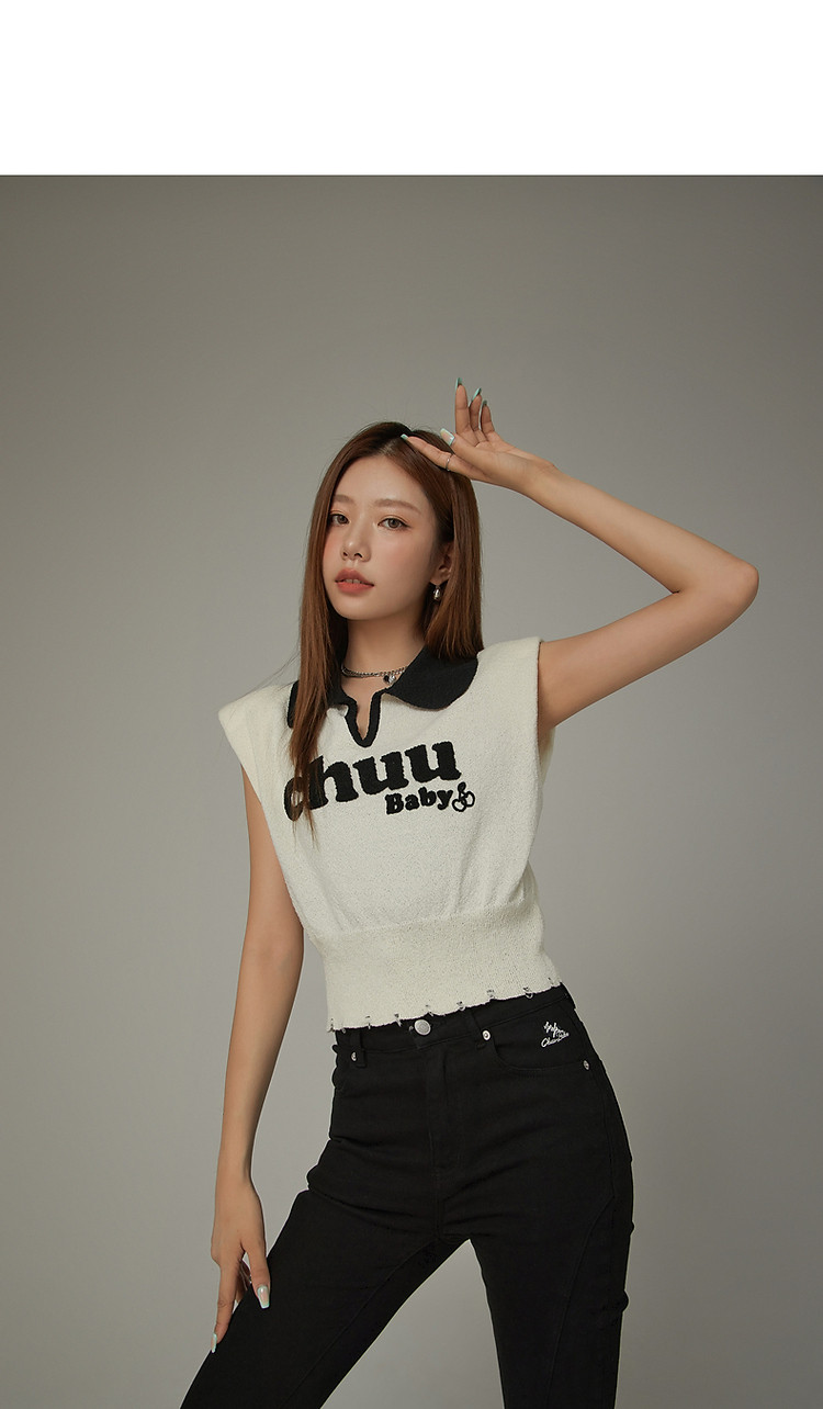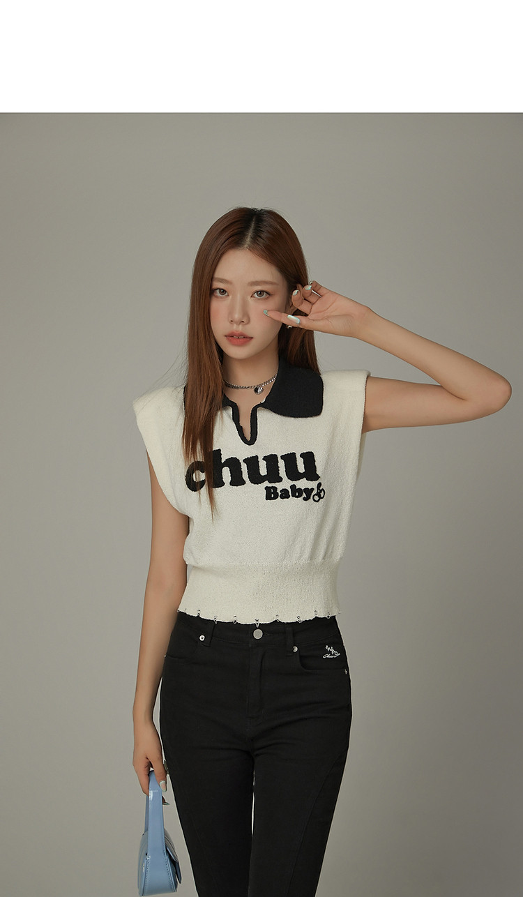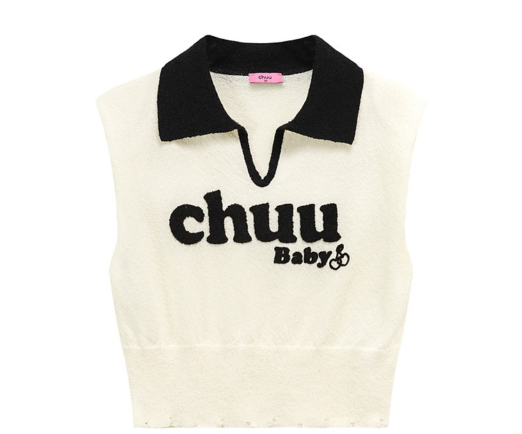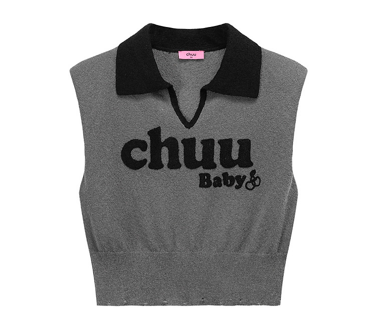 商品名称:CHUU马甲针织衫女春秋小樱桃字母提花做旧破洞上衣 045011