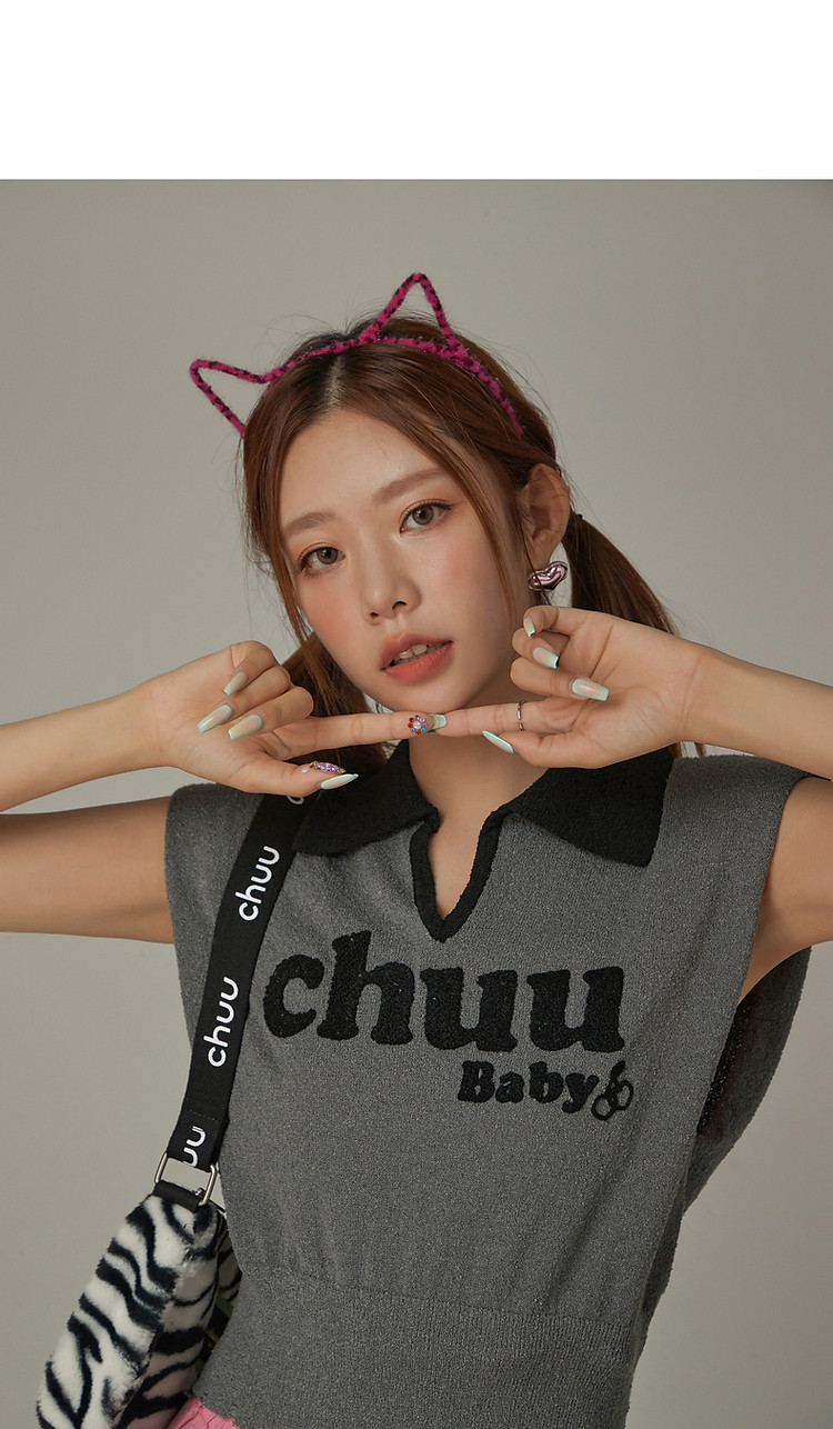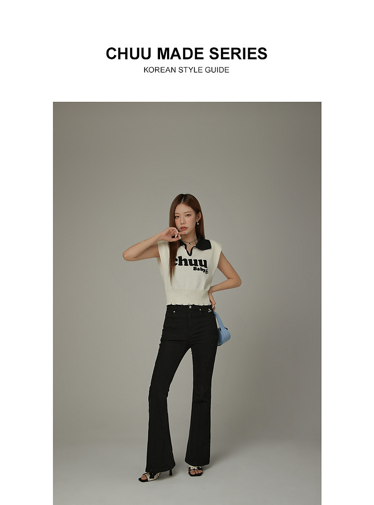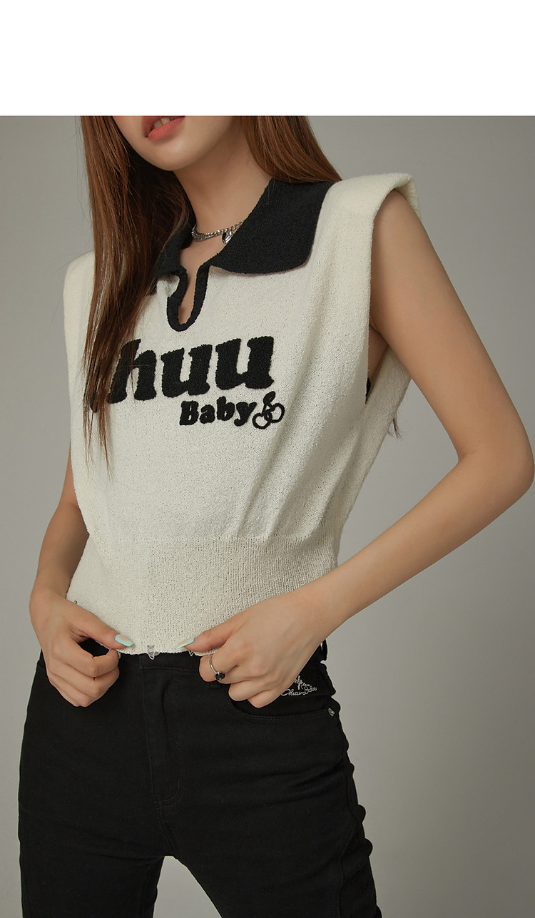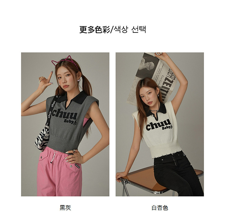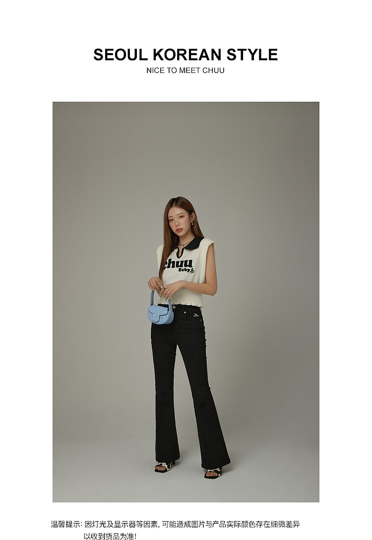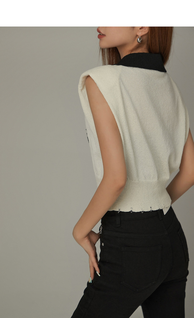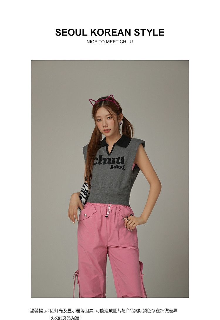 商品名称:CHUU马甲针织衫女春秋小樱桃字母提花做旧破洞上衣 045011
