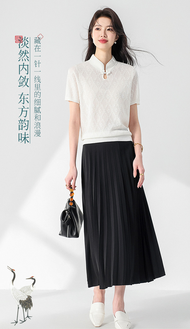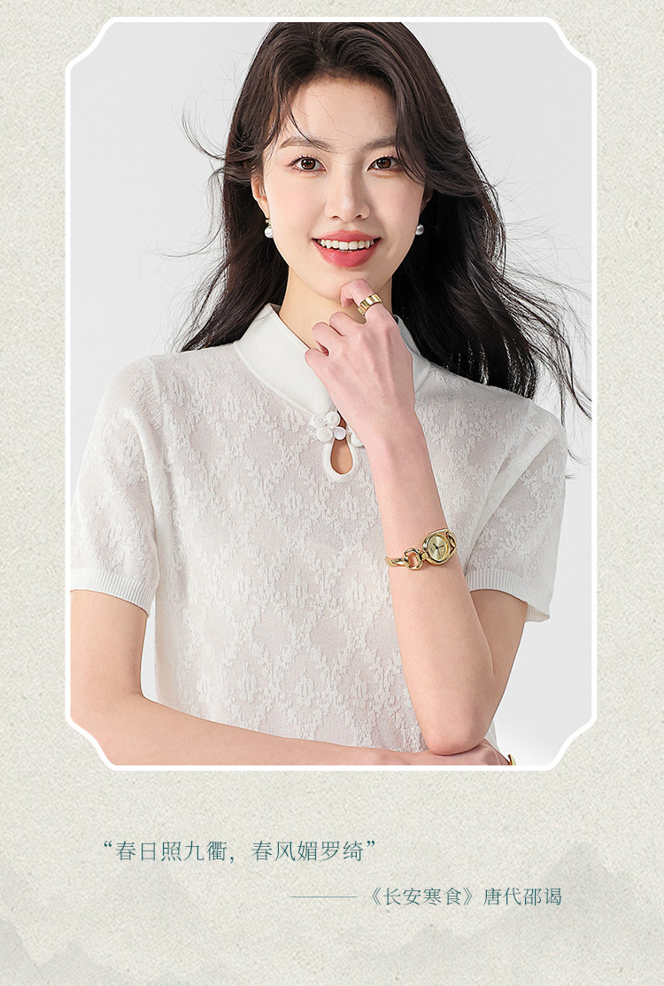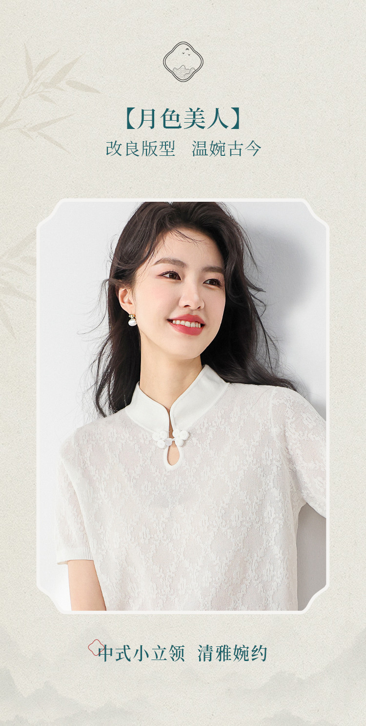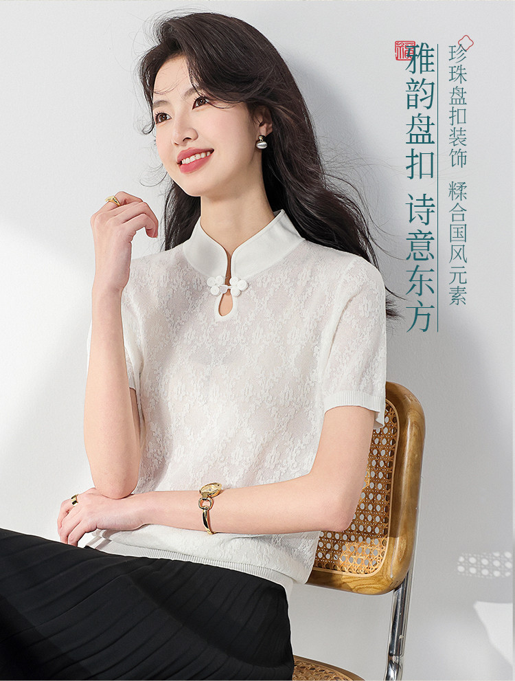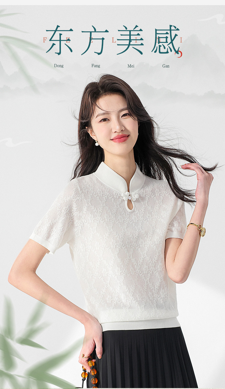 国风~轻薄透气含桑蚕丝立领打底衫短袖T恤针织衫女夏妈妈装上衣 293267