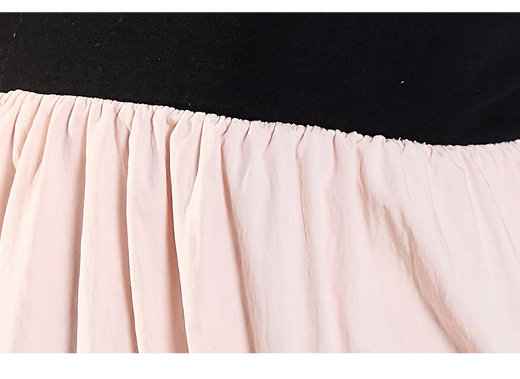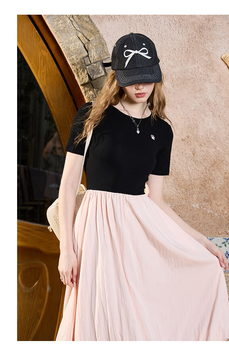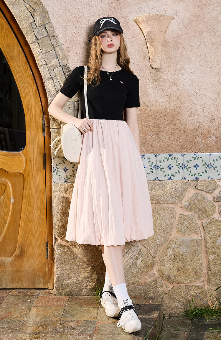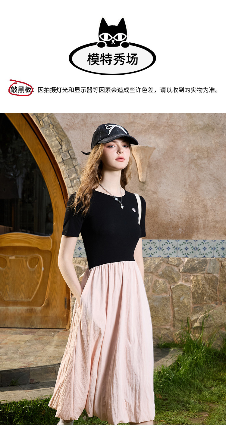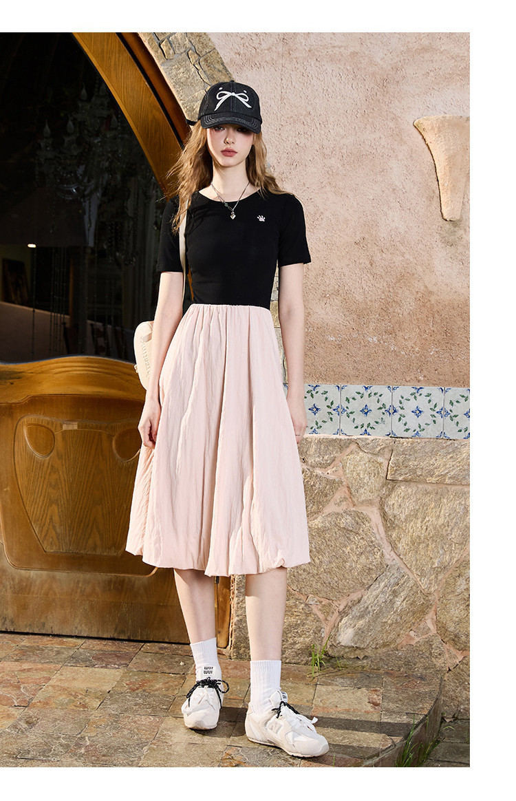 针织拼接假两件法式设计花苞中长裙夏季气质短袖连衣裙 179997