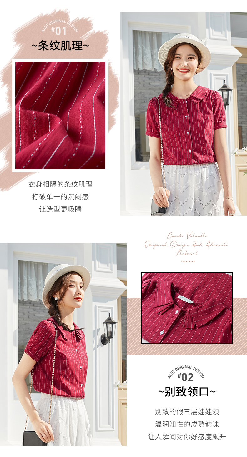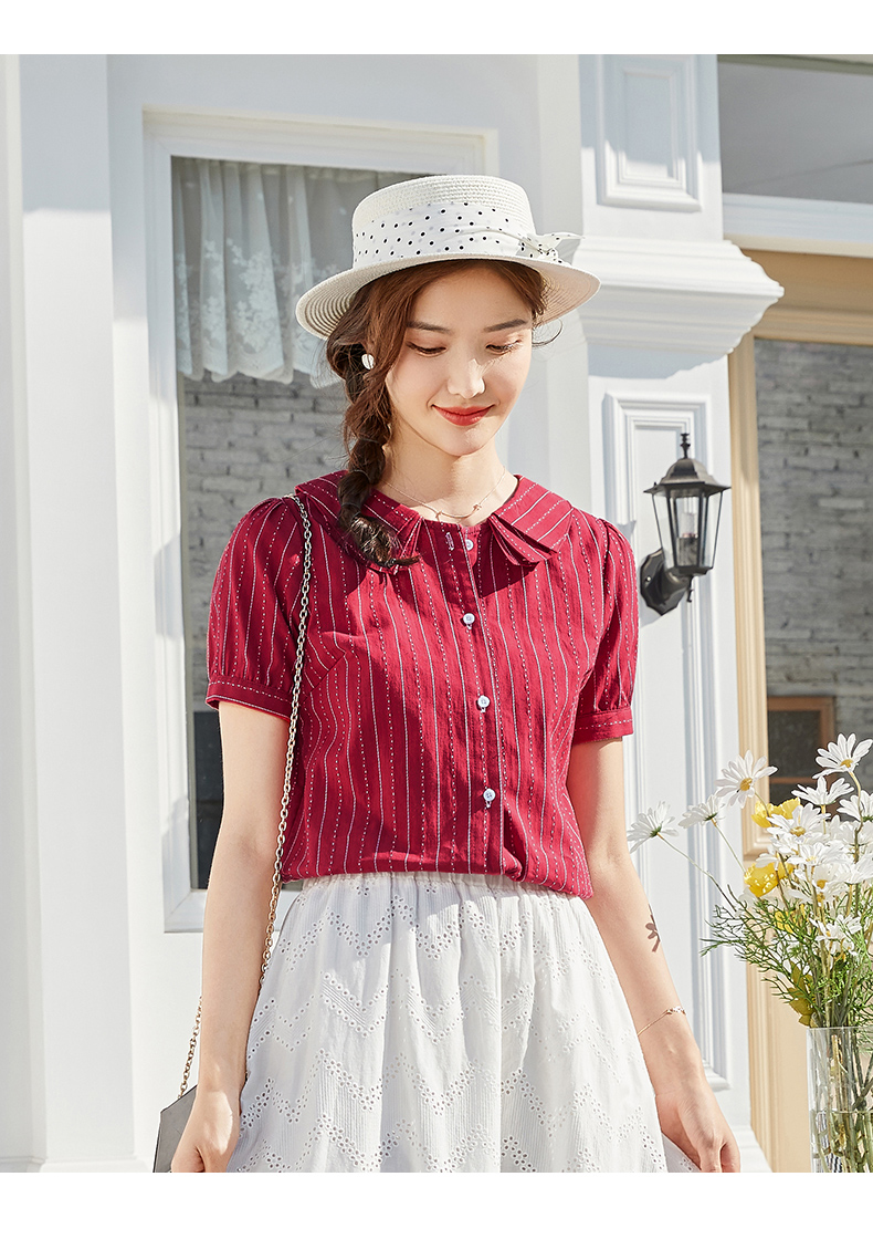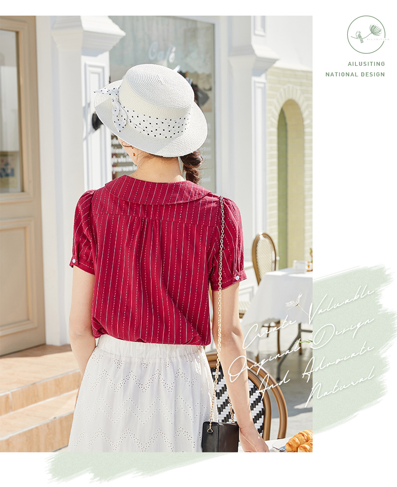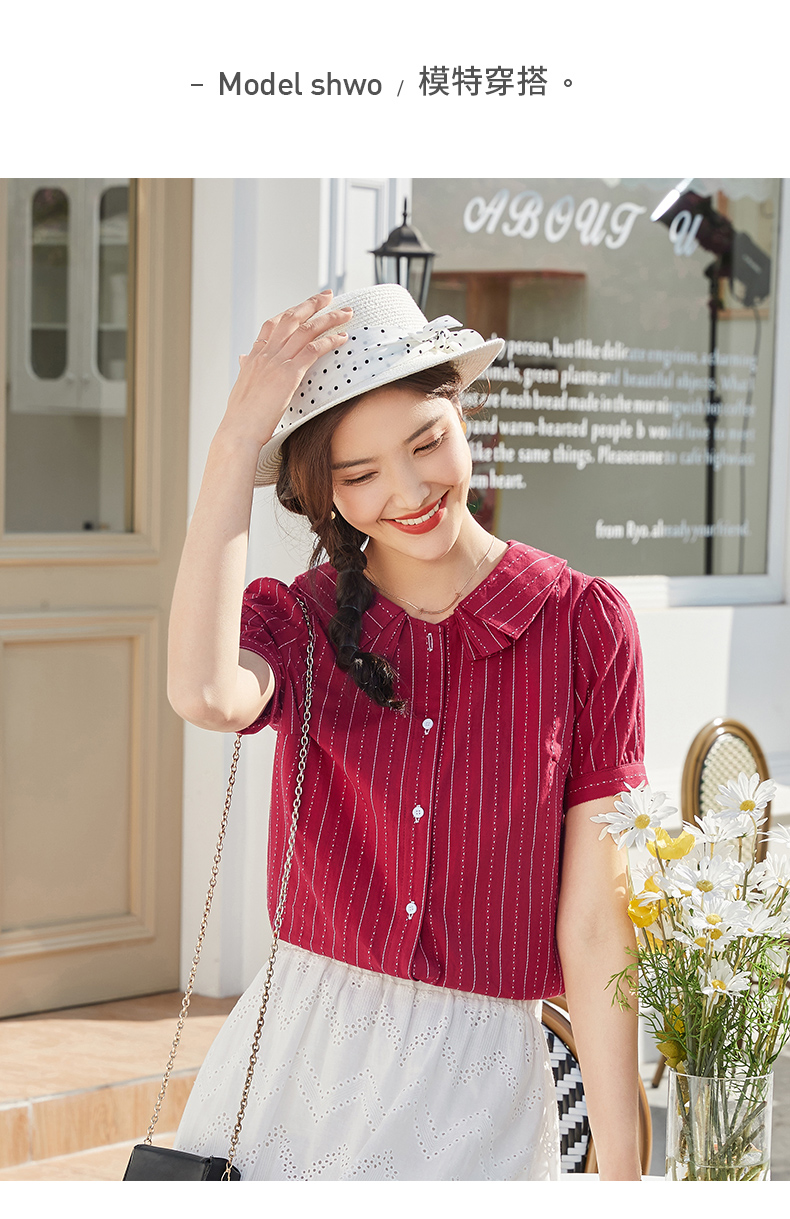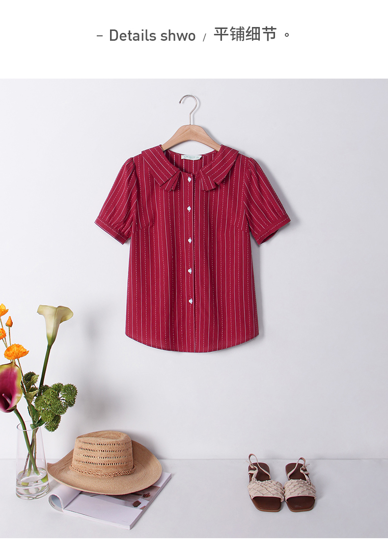 商品名称:艾路丝婷纯棉短袖衬衫女2021夏装新款韩版宽松上衣娃娃领条纹衬衣
