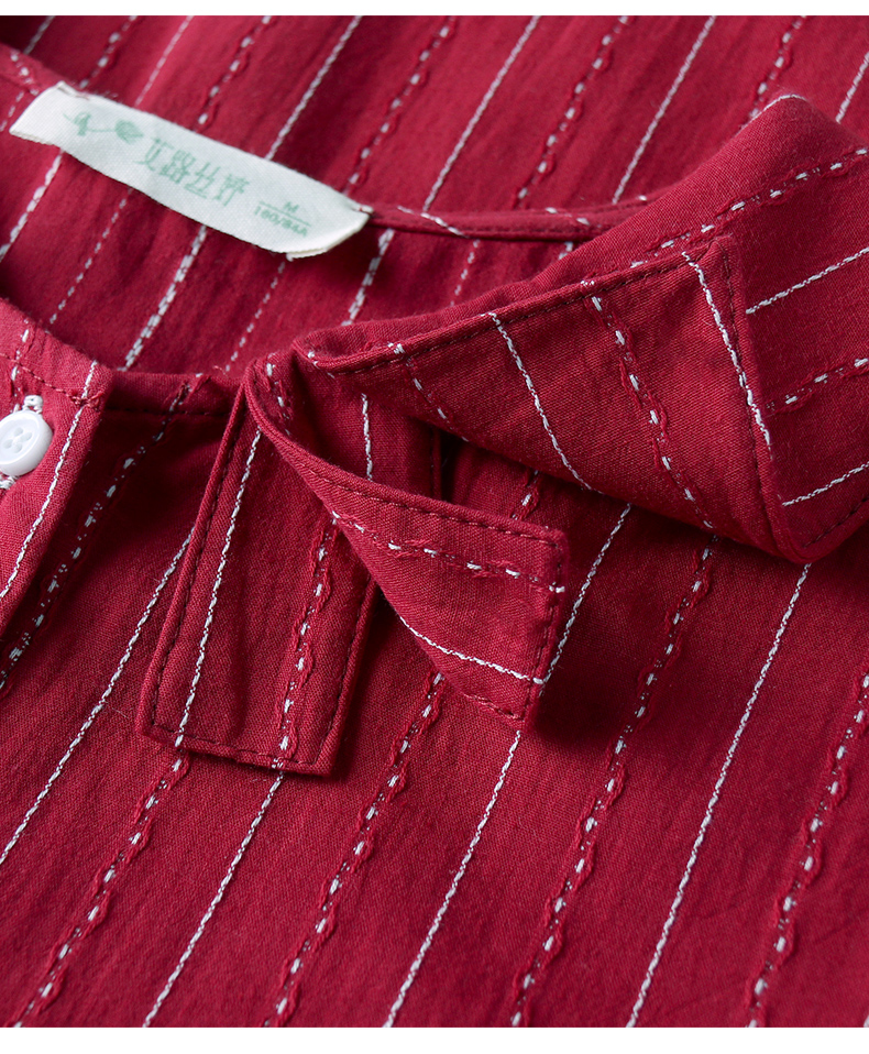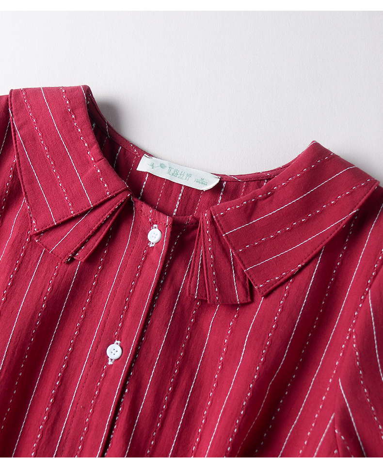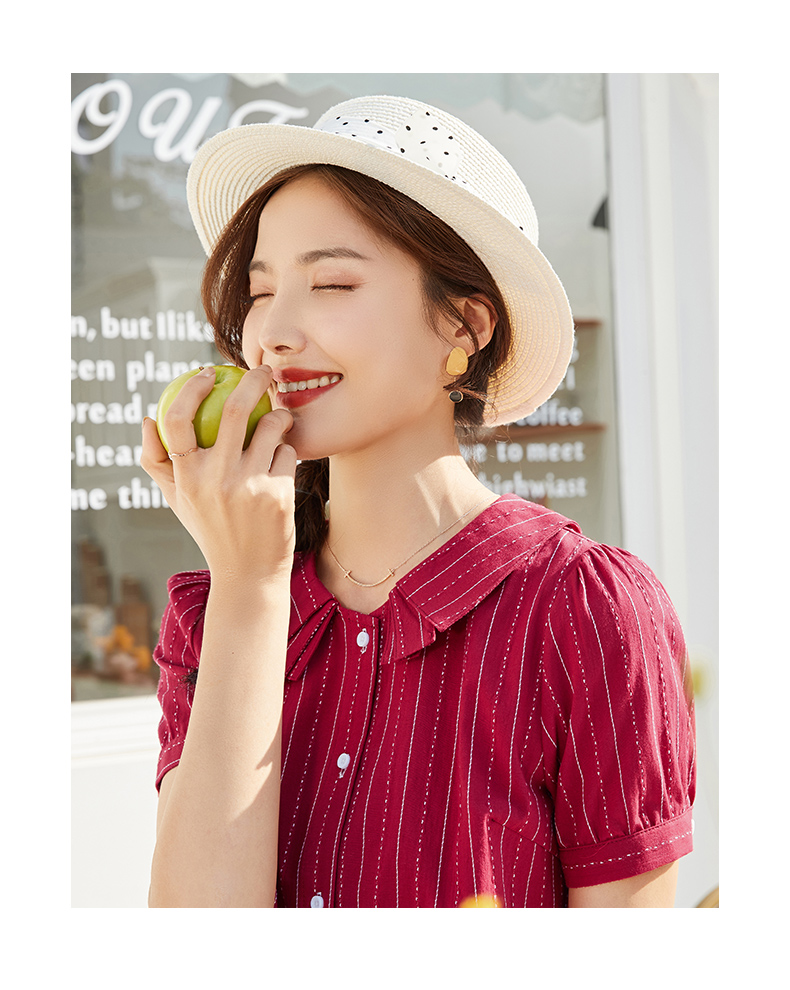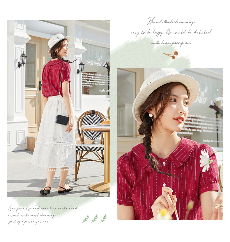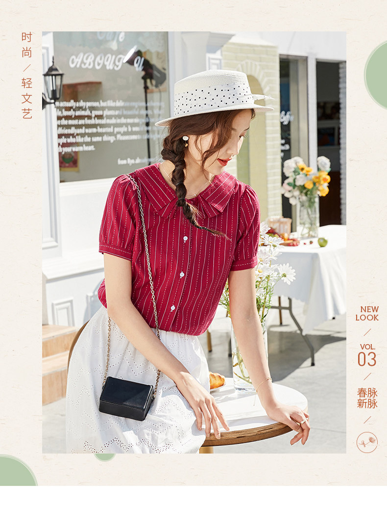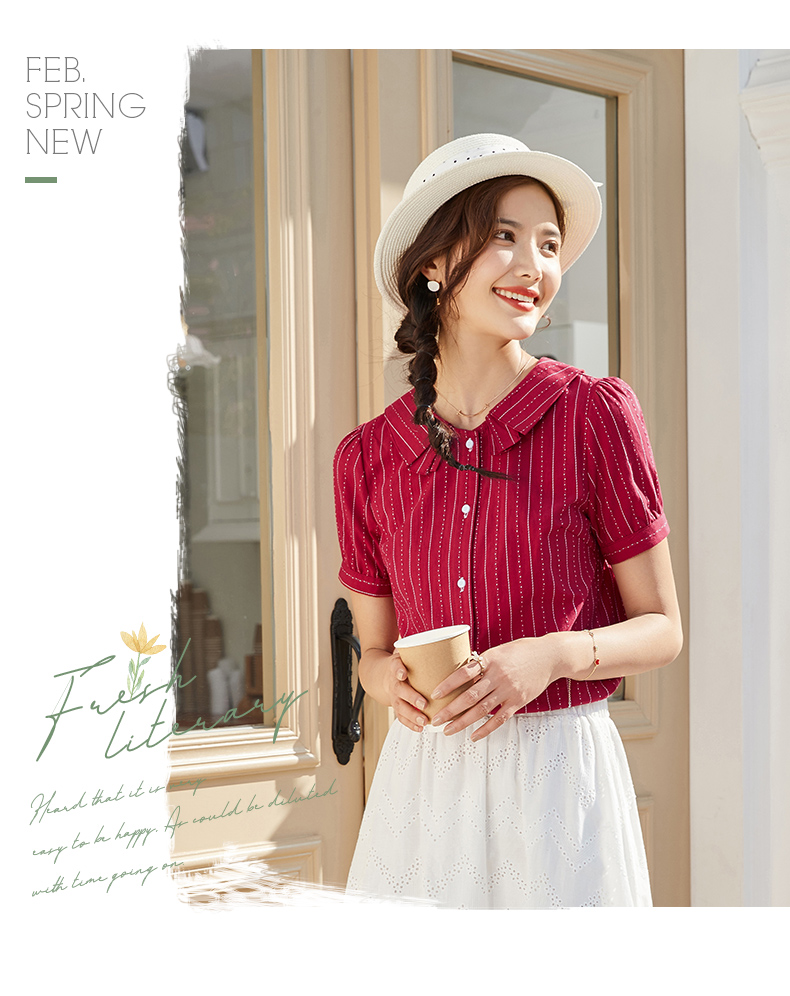 商品名称:艾路丝婷纯棉短袖衬衫女2021夏装新款韩版宽松上衣娃娃领条纹衬衣