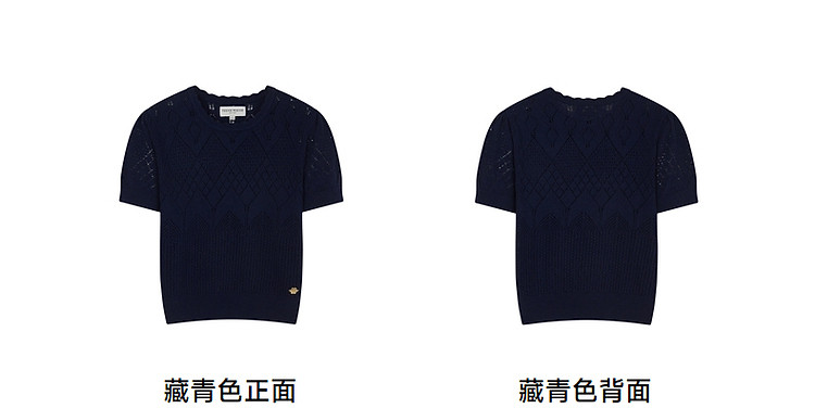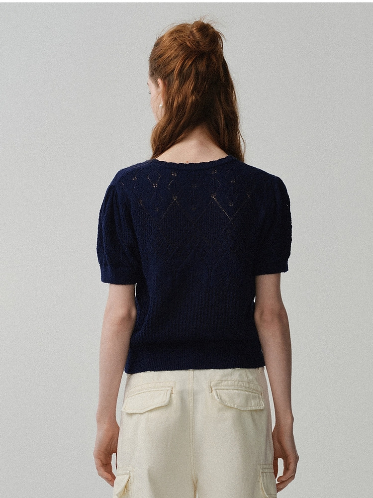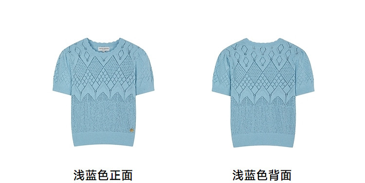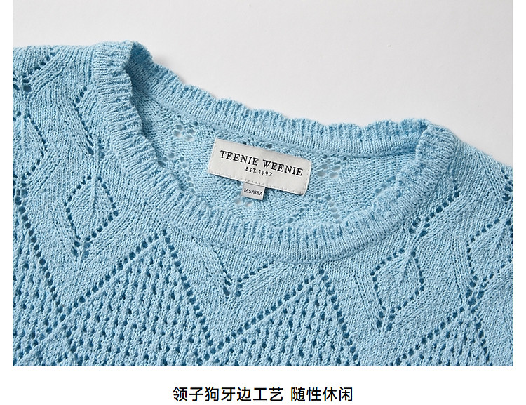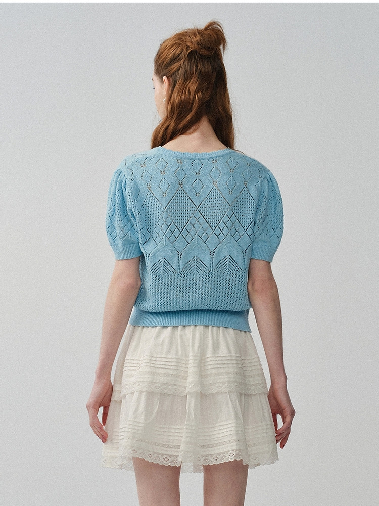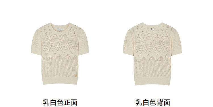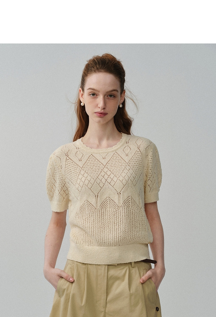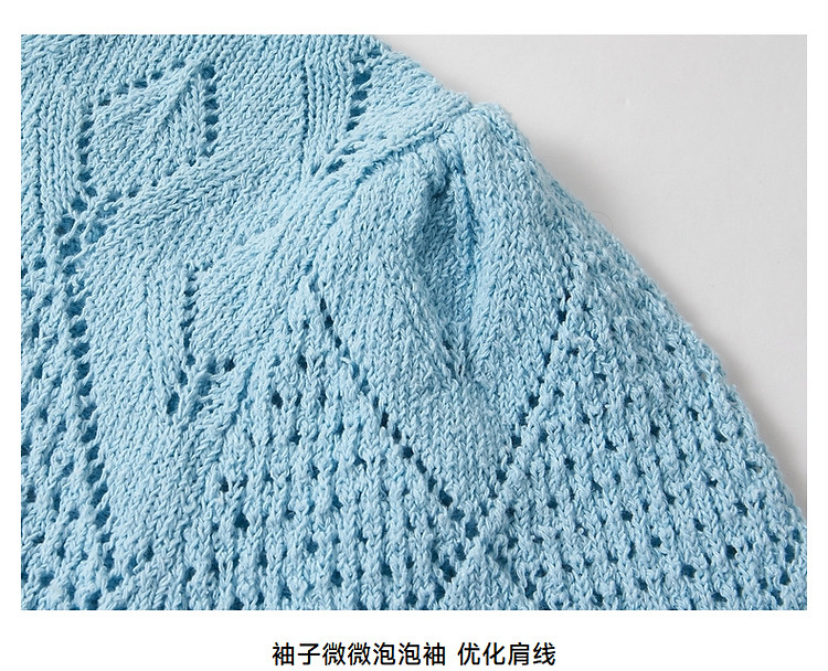 商品名称:小熊针织T恤春夏镂空钩花泡泡袖套头短款时髦学院风通勤上衣女装 632129