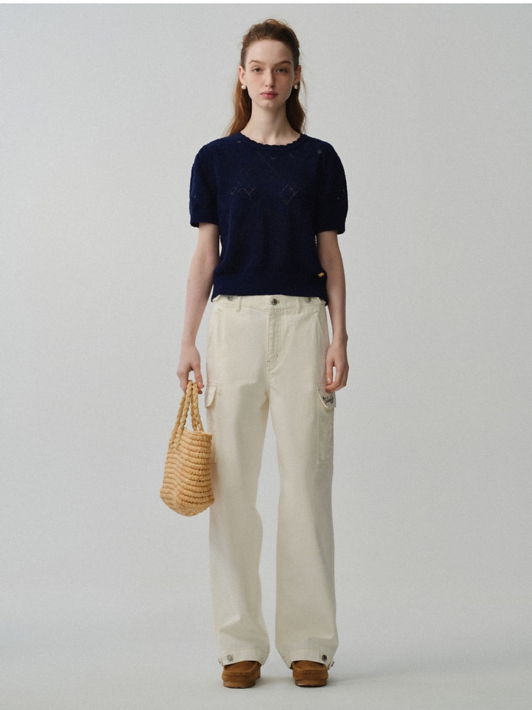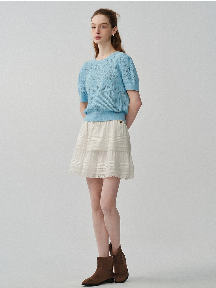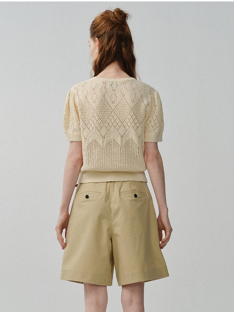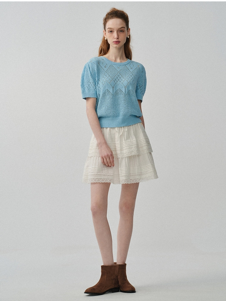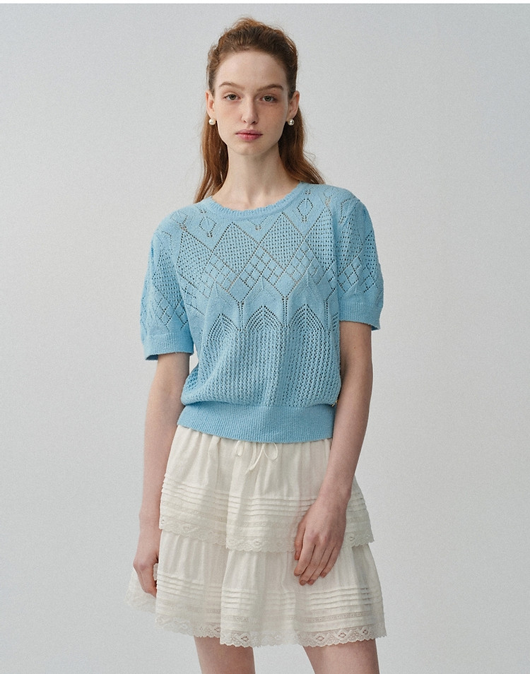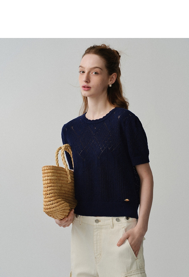 商品名称:小熊针织T恤春夏镂空钩花泡泡袖套头短款时髦学院风通勤上衣女装 632129