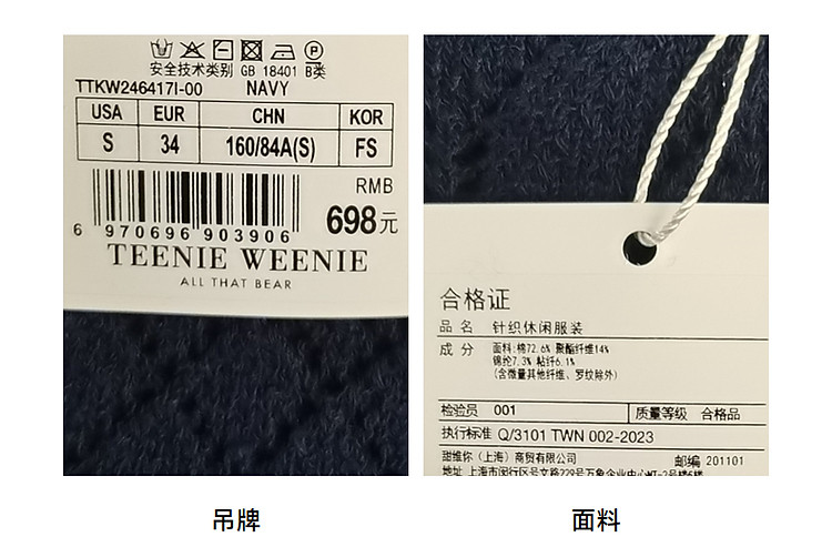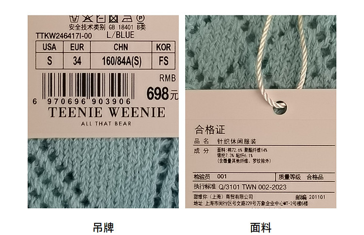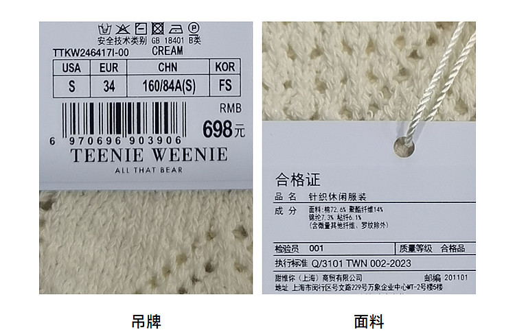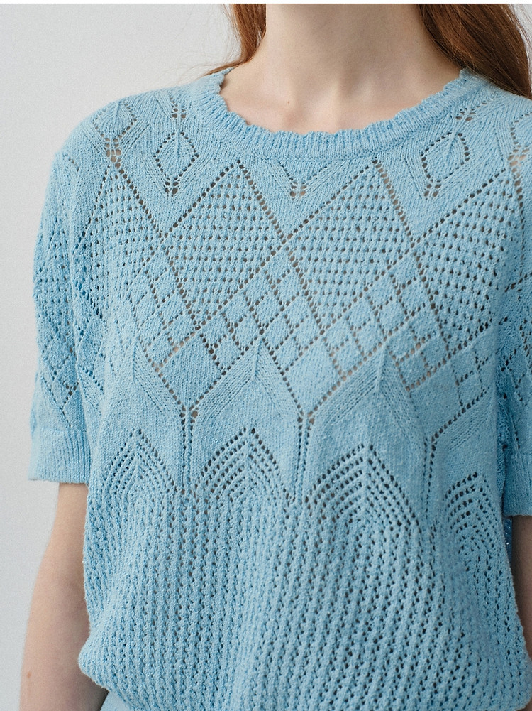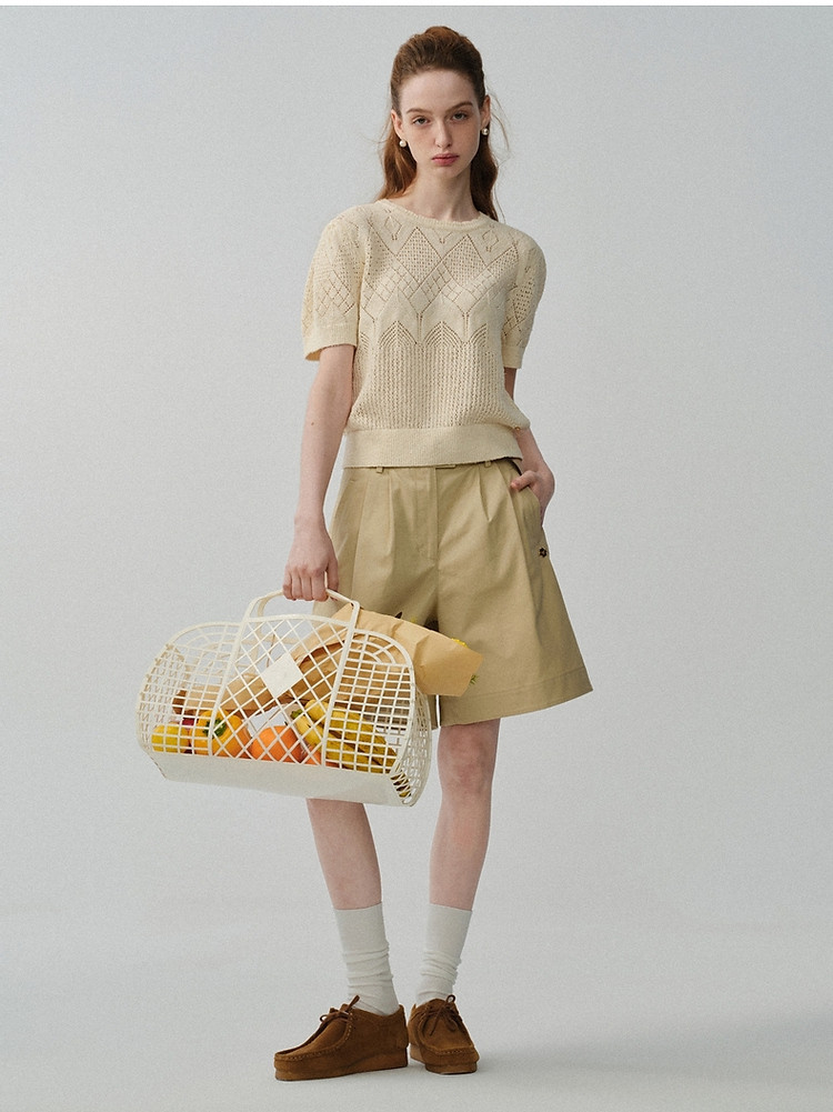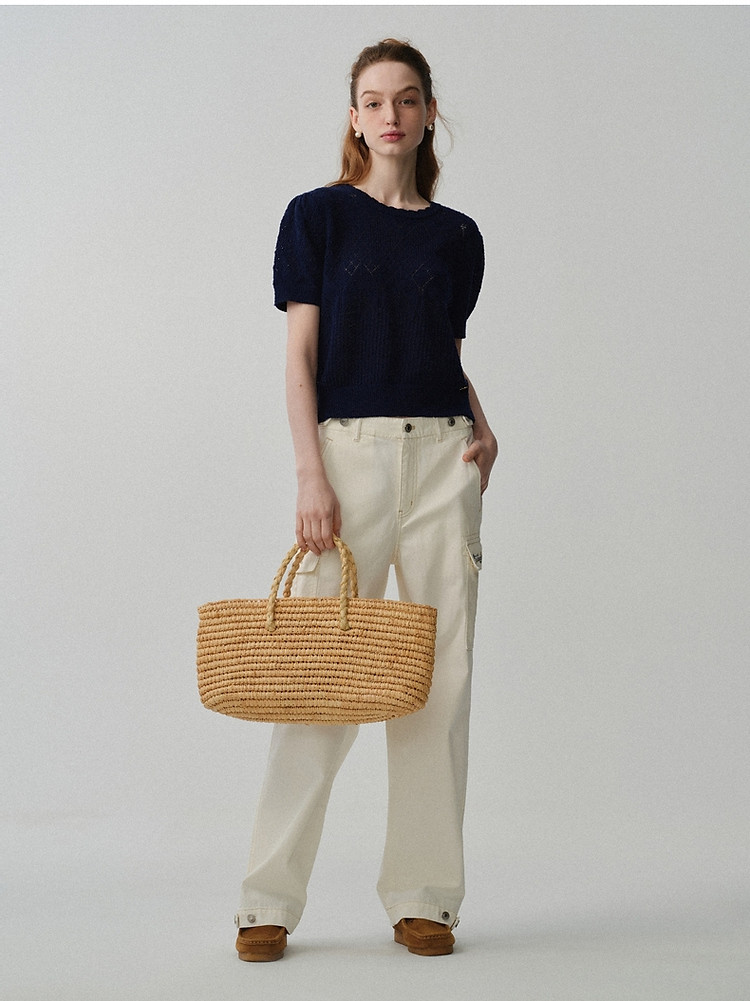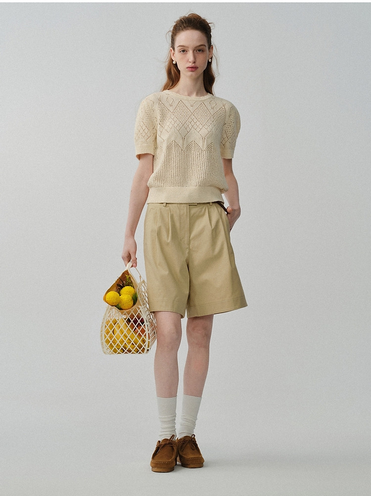 商品名称:小熊针织T恤春夏镂空钩花泡泡袖套头短款时髦学院风通勤上衣女装 632129