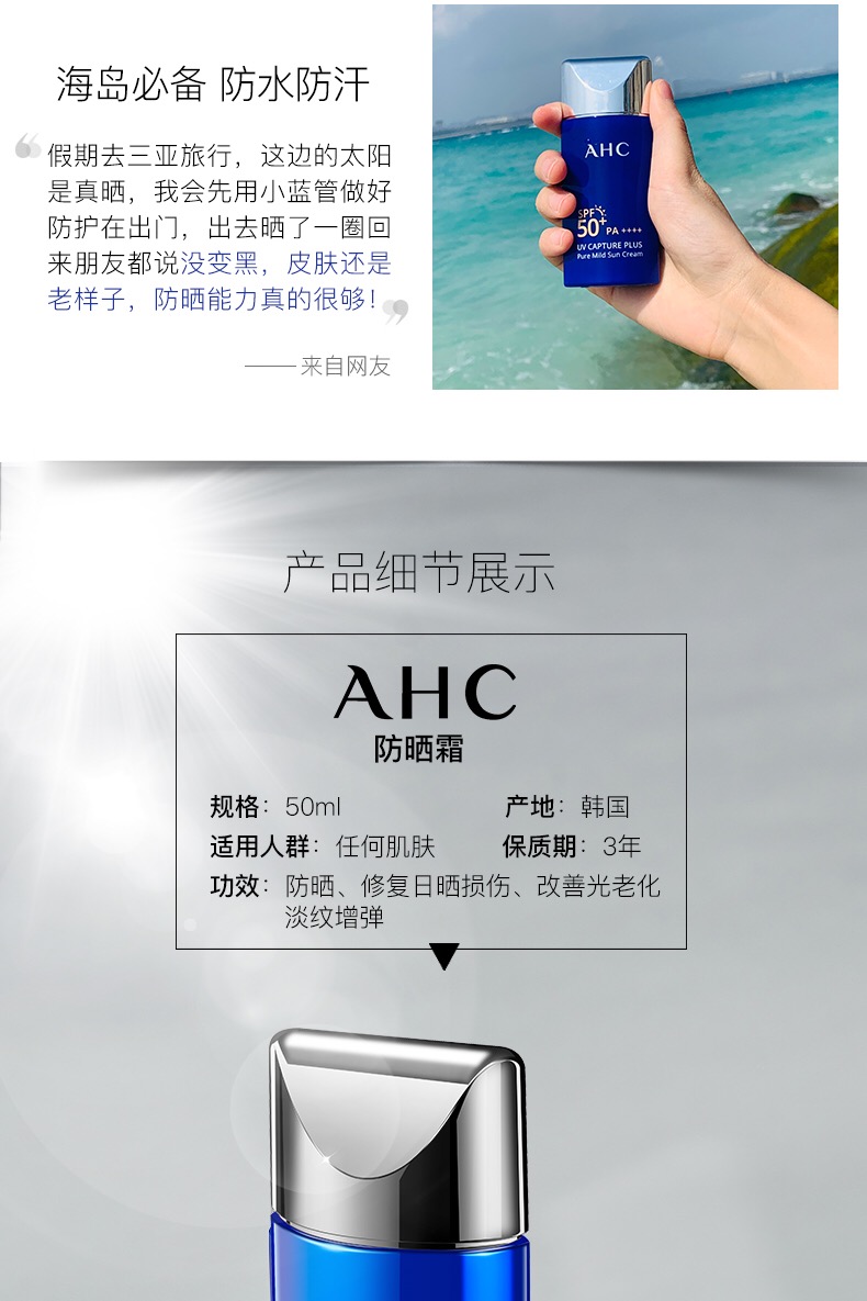 商品名称:AHC/爱和纯 小蓝瓶防晒霜 50ml/90ml SPF50+ 全身可用 防水防汗 清爽不油腻