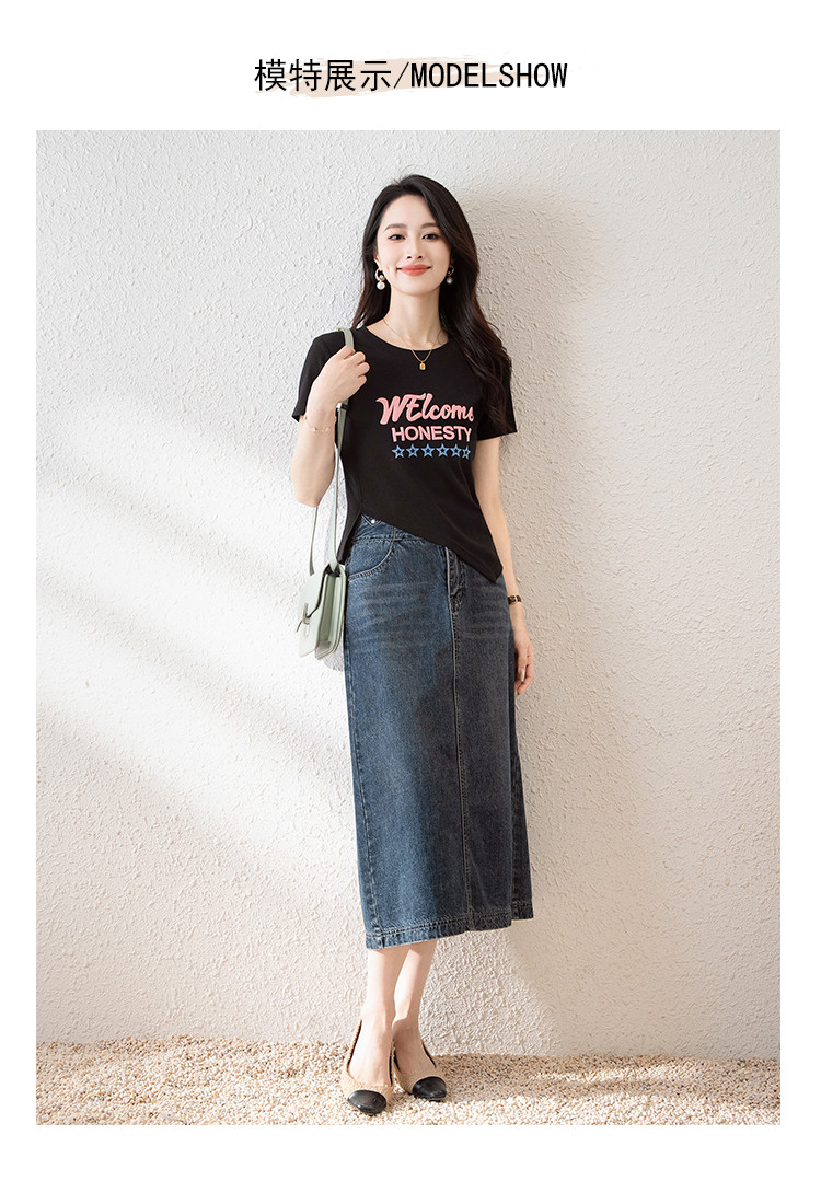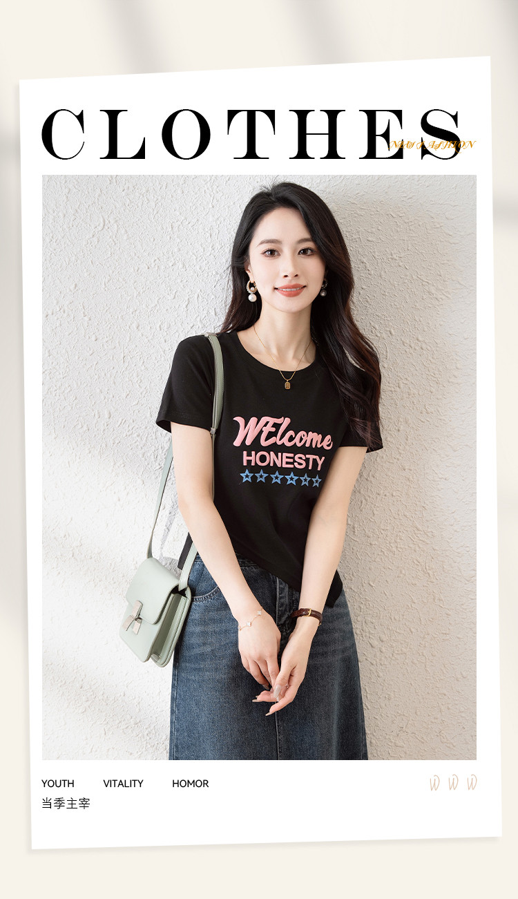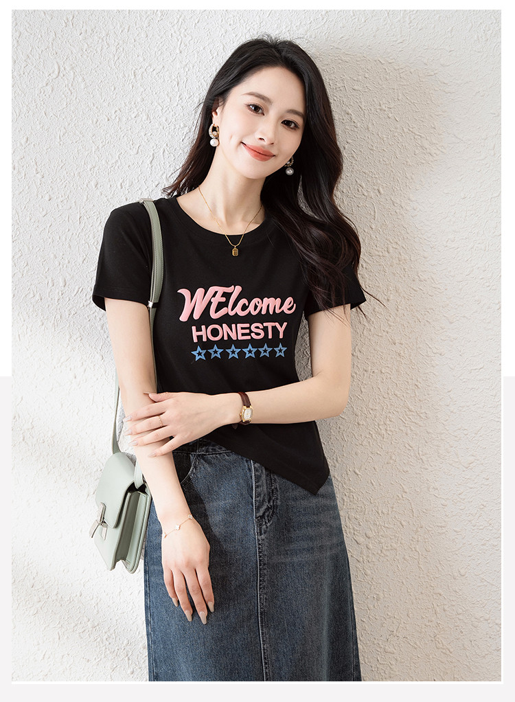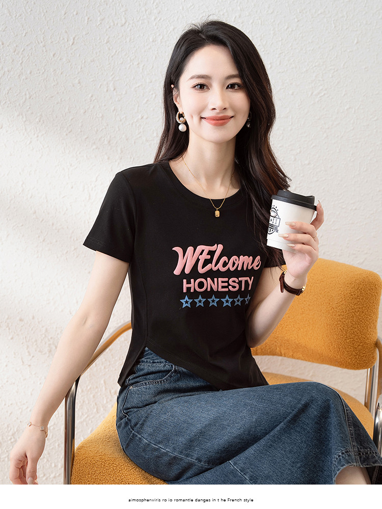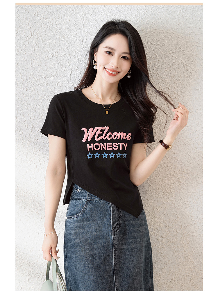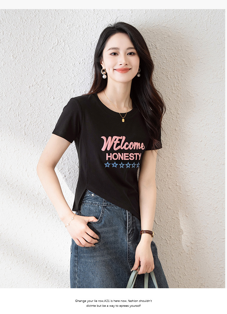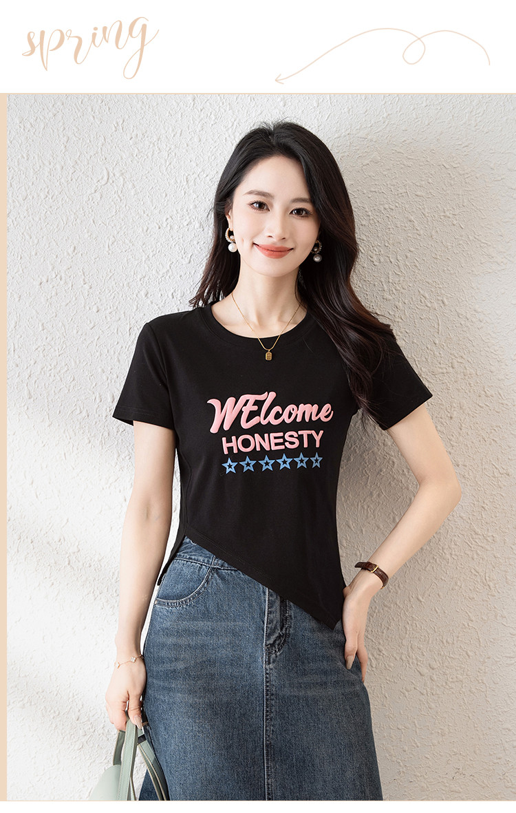 商品名称:时尚潮流不规则夏季短袖T恤女高弹舒适休闲百搭修身显瘦印花上衣 797057