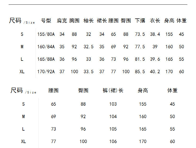 | 尺码 | 肩宽(cm) | 袖长(cm) | 上装号型 | 下装号型 | 衣长(cm) | 腰围(cm) | 裤长(cm) | 臀围(cm) | 胸围(cm) | 号型 |