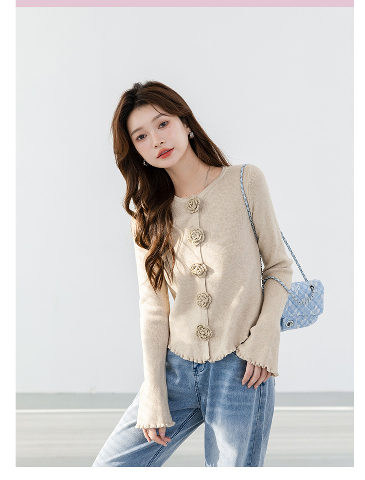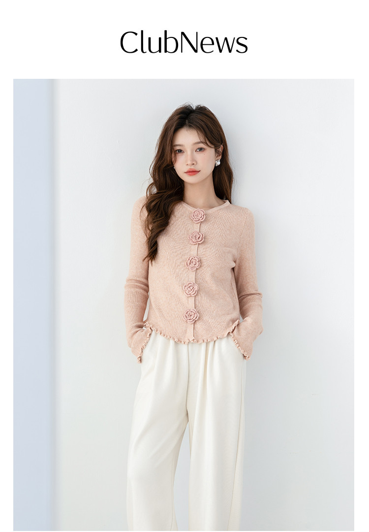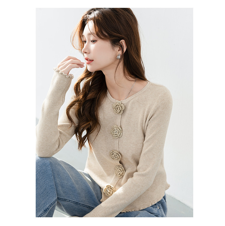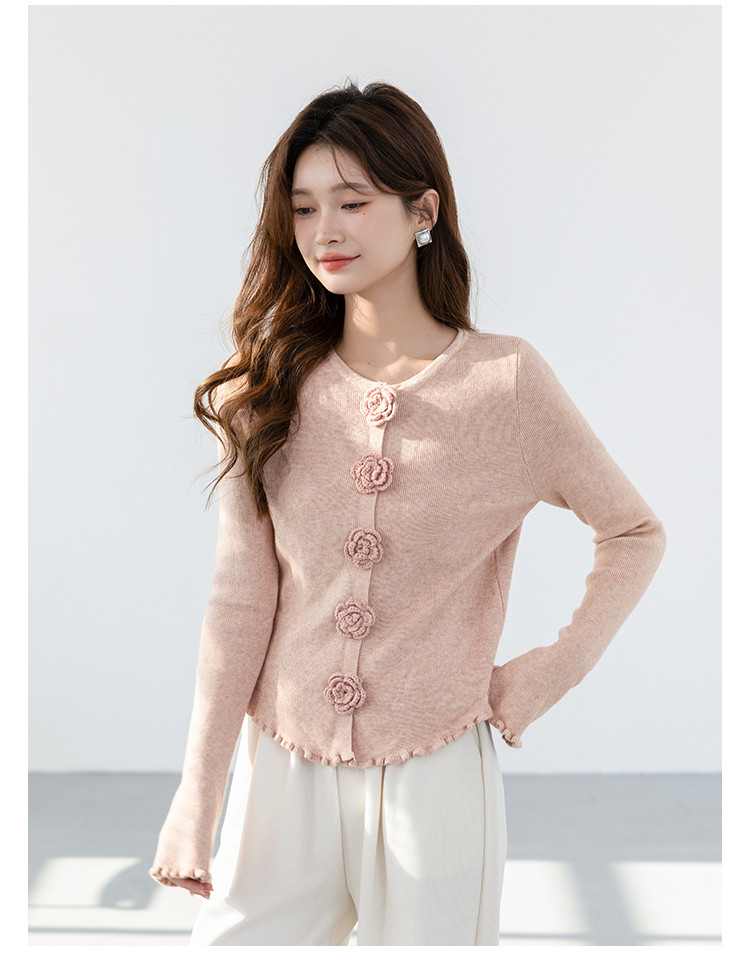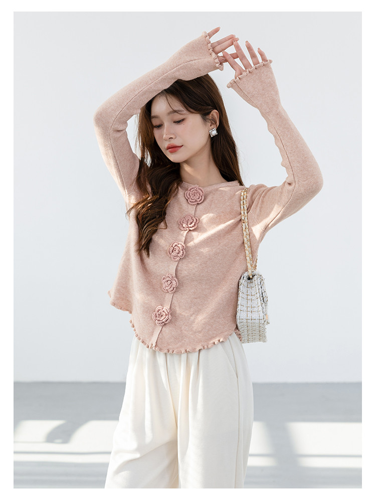 甜美圆领玫瑰花朵波浪花边气质显瘦百搭针织衫 546755