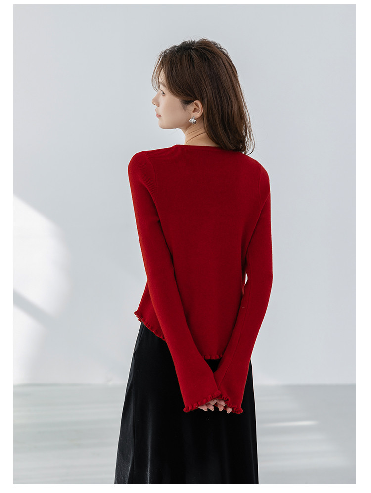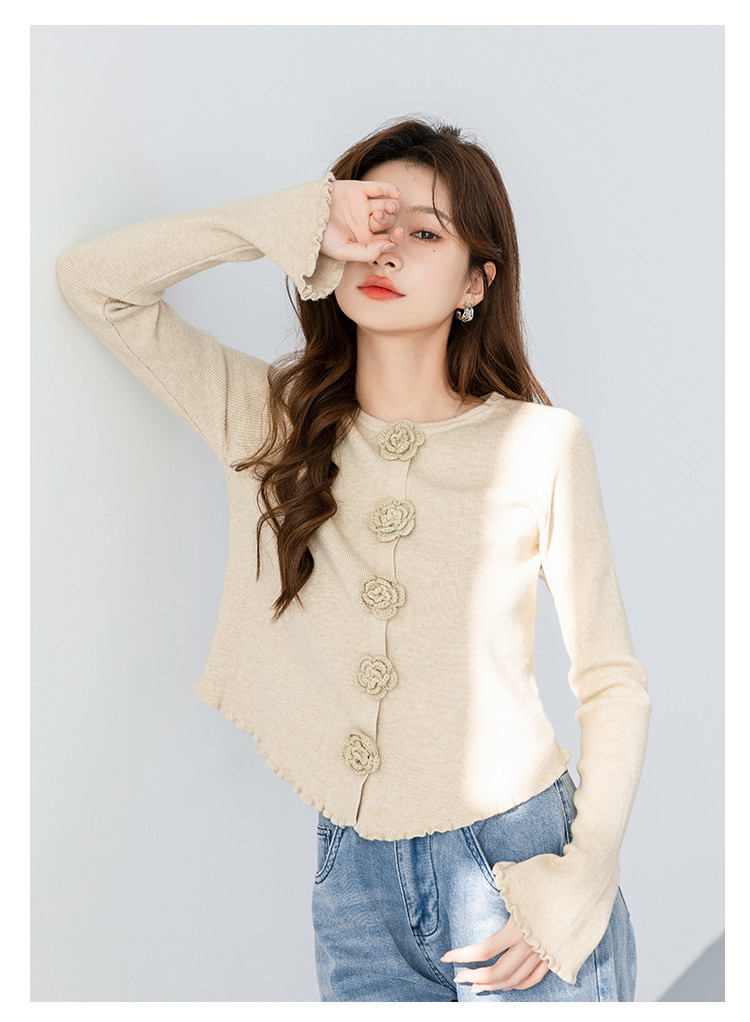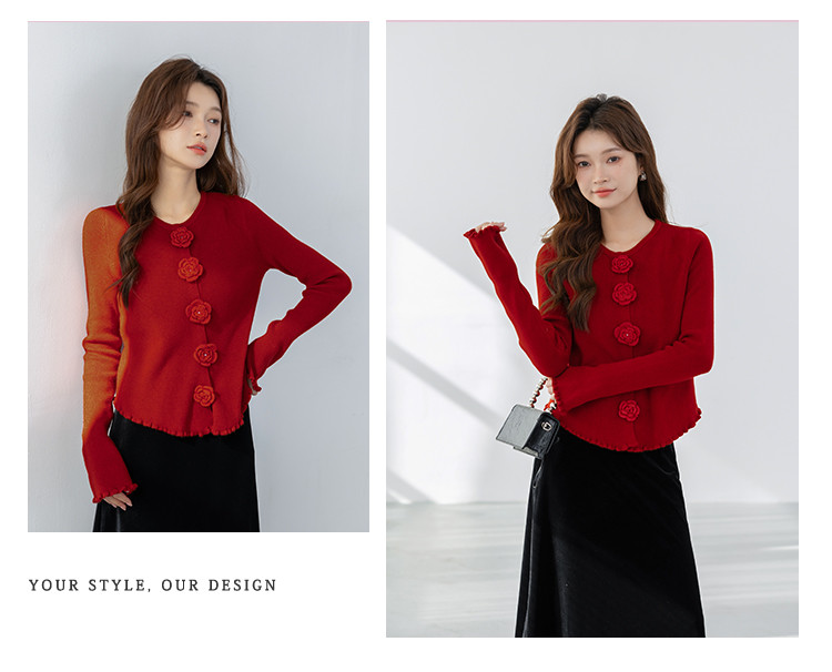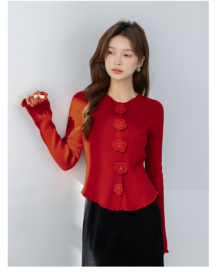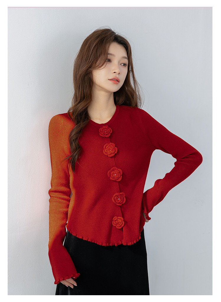 甜美圆领玫瑰花朵波浪花边气质显瘦百搭针织衫 546755
