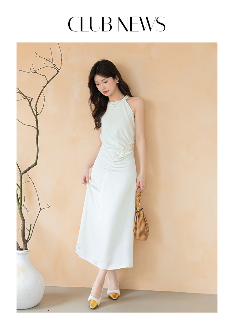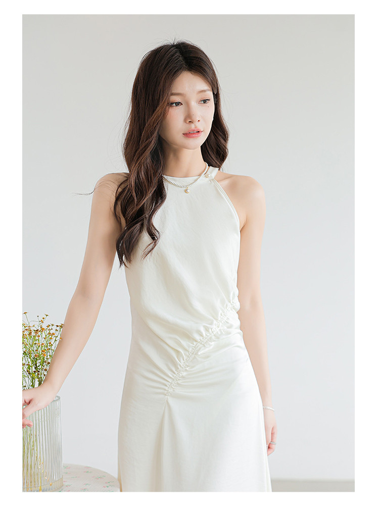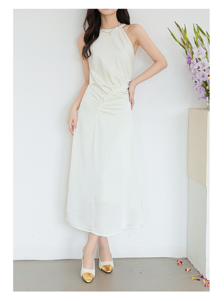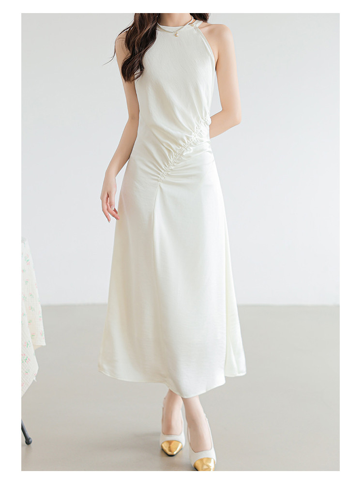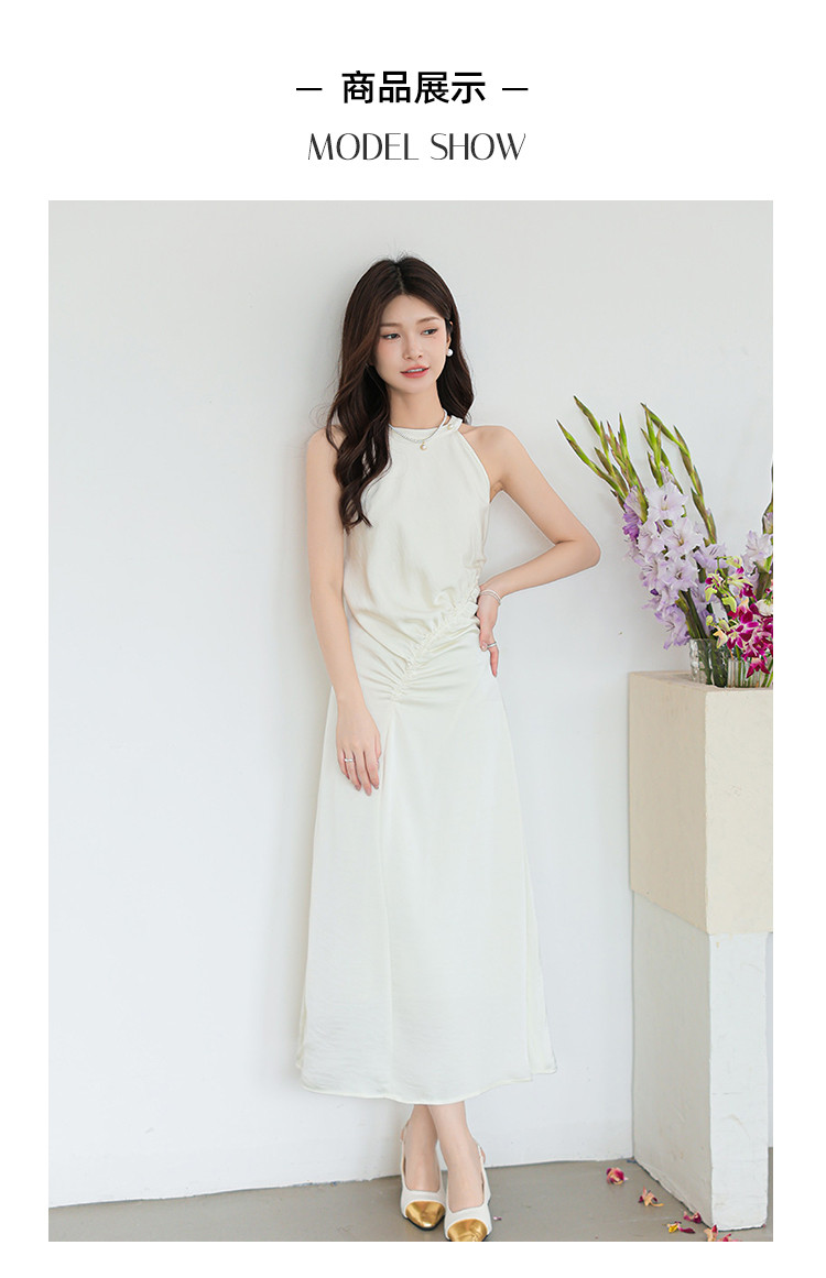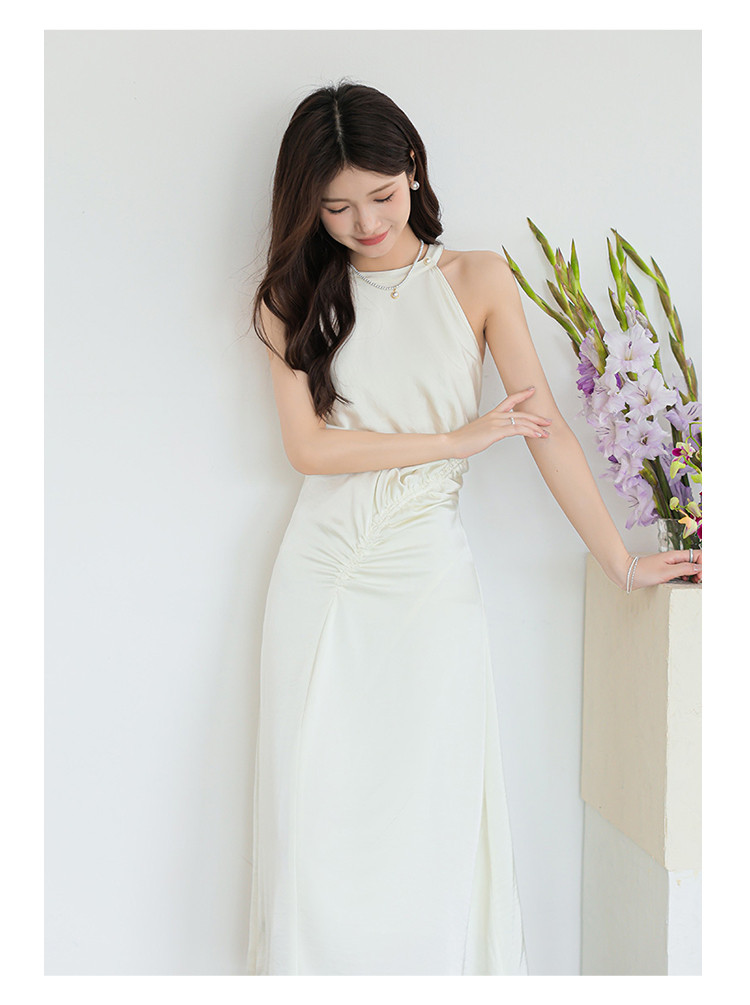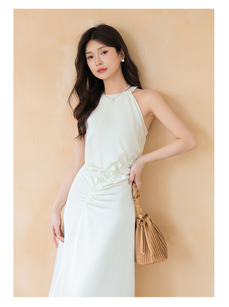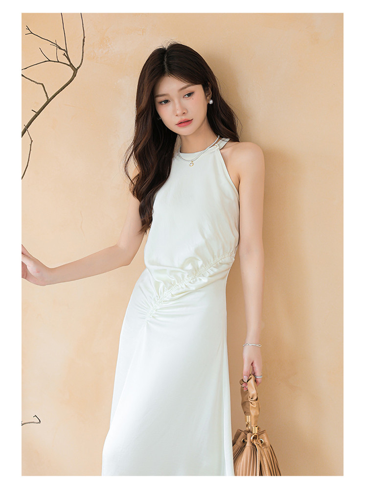 商品名称:浪漫气质缎面挂脖优雅小女人小众设计感收褶显瘦连衣裙女 375299