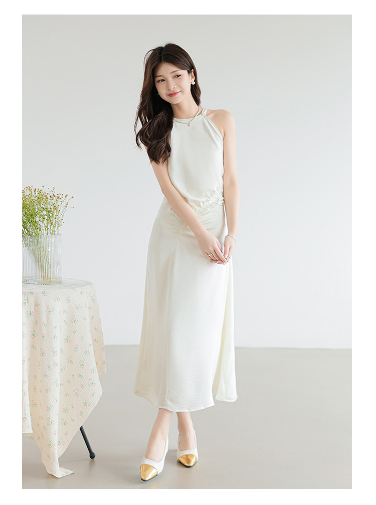 浪漫气质缎面挂脖优雅小女人小众设计感收褶显瘦连衣裙女 375299