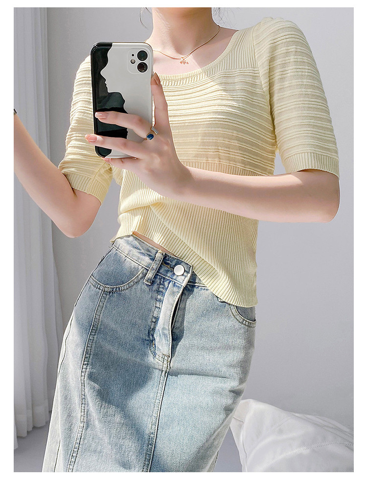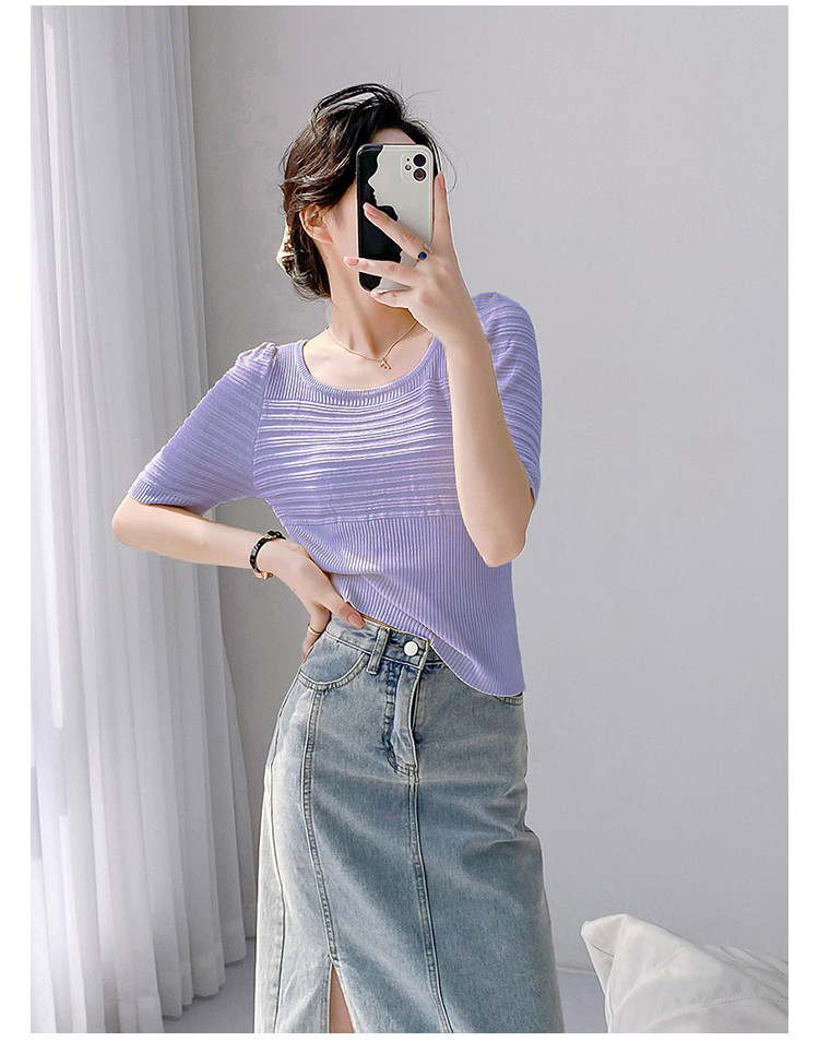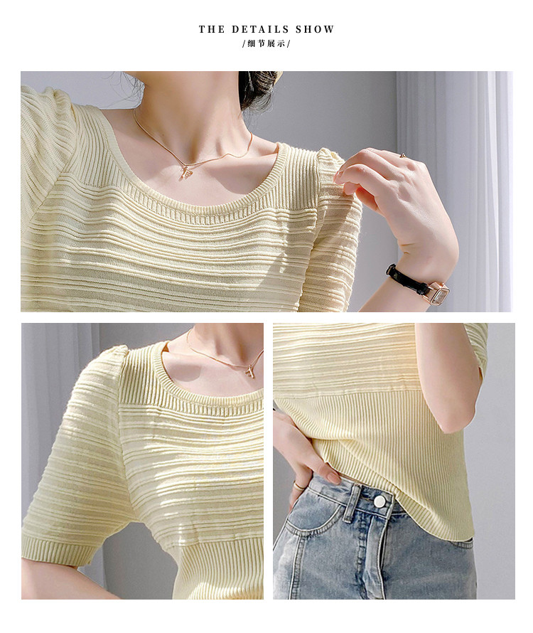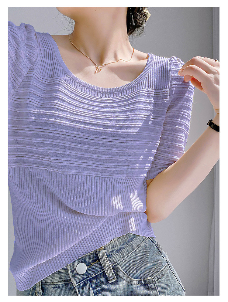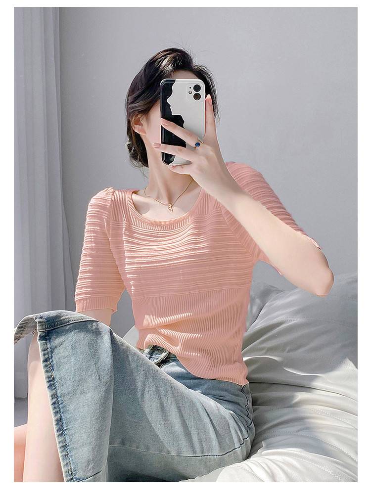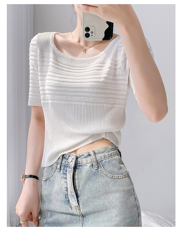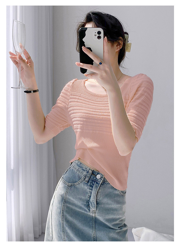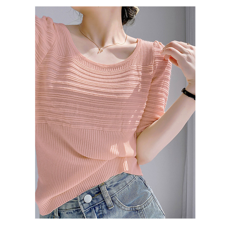 法式淑女短袖针织衫女设计感圆领气质短款打底外穿上衣女 053955