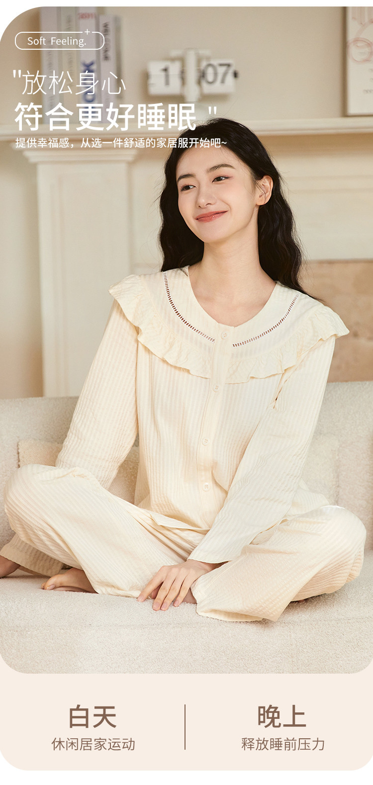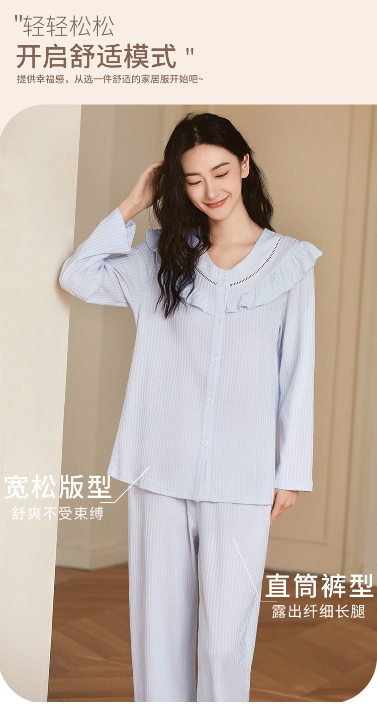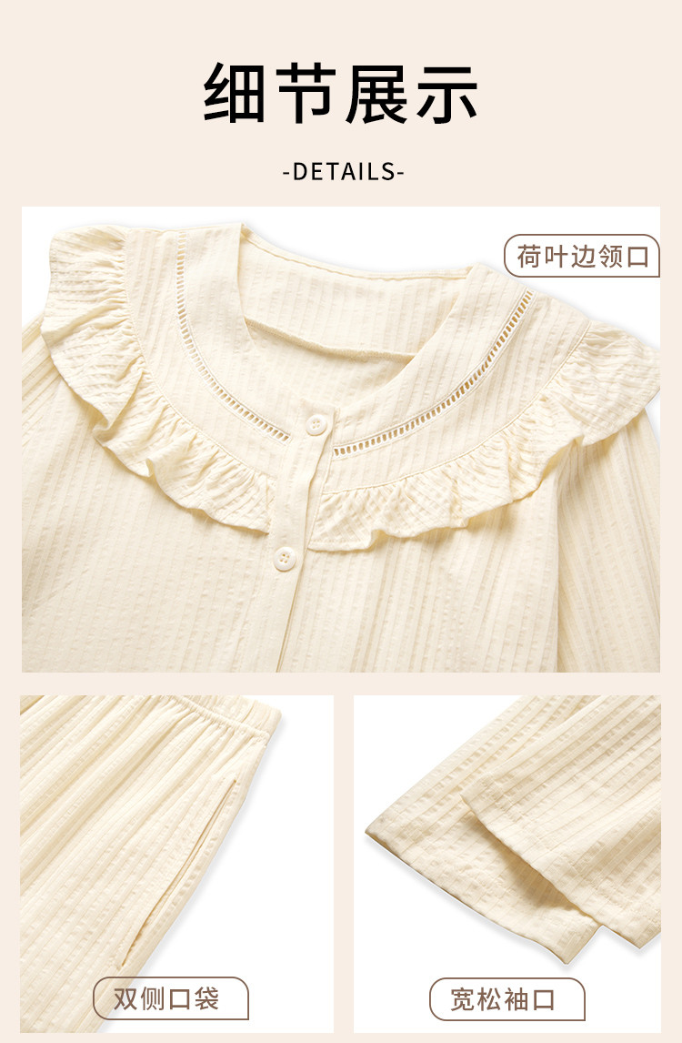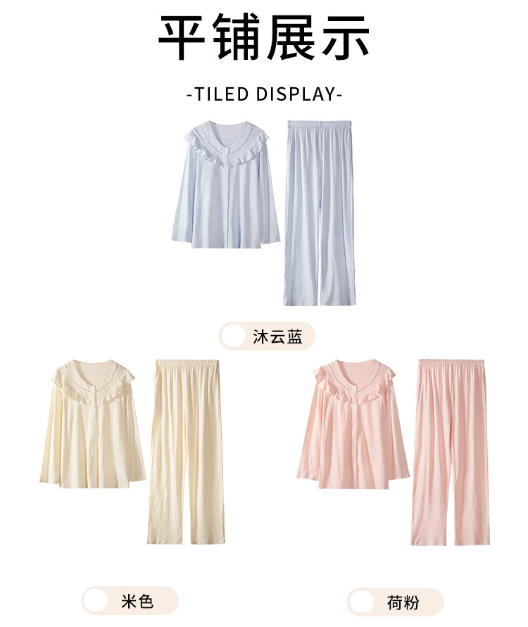 商品名称:【100%棉】荷叶边长袖舒适套装睡衣女纯棉女士家居服舒适柔软 038731