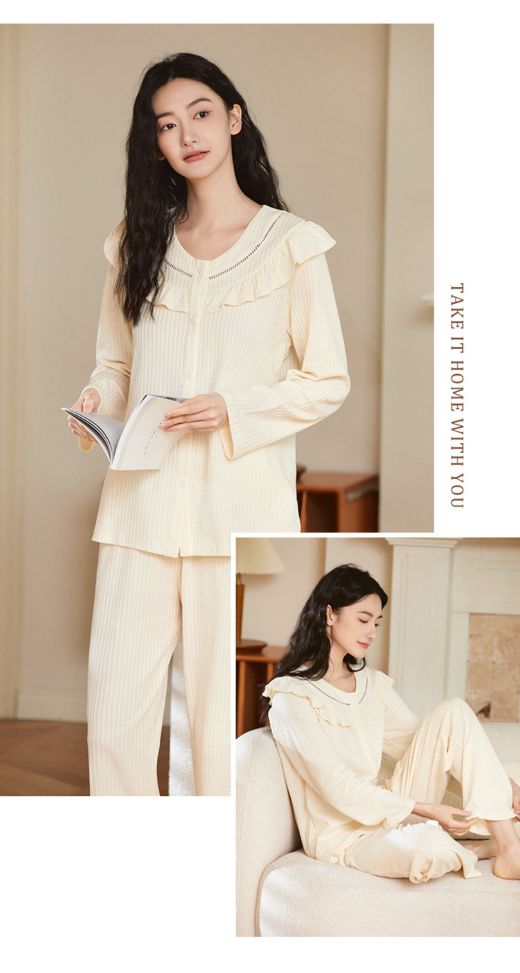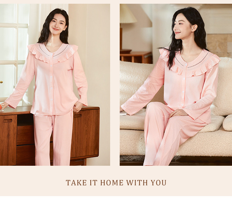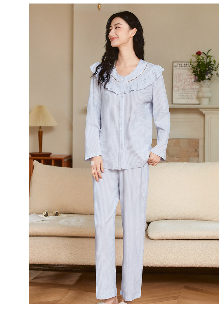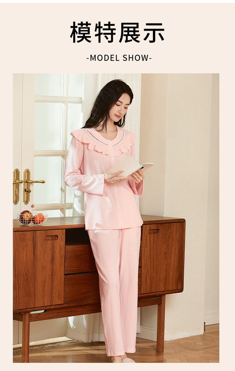 商品名称:【100%棉】荷叶边长袖舒适套装睡衣女纯棉女士家居服舒适柔软 038731