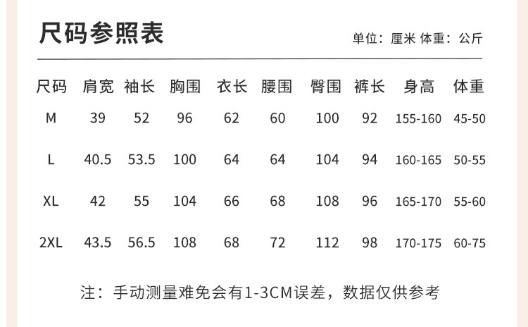 尺码 肩宽(cm) 袖长(cm) 上装号型 下装号型 衣长(cm) 身高(cm) 腰围(cm) 裤长(cm) 体重(kg) 臀围(cm) 胸围(cm) 号型