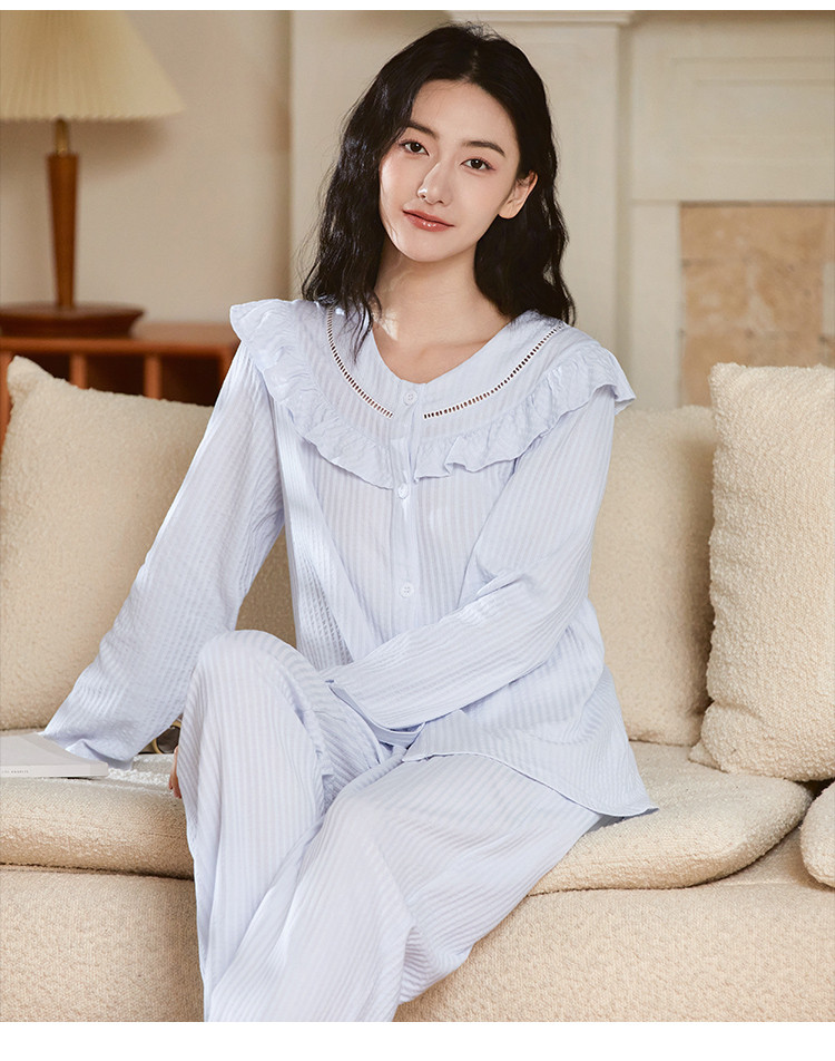 【100%棉】荷叶边长袖舒适套装睡衣女纯棉女士家居服舒适柔软 038731